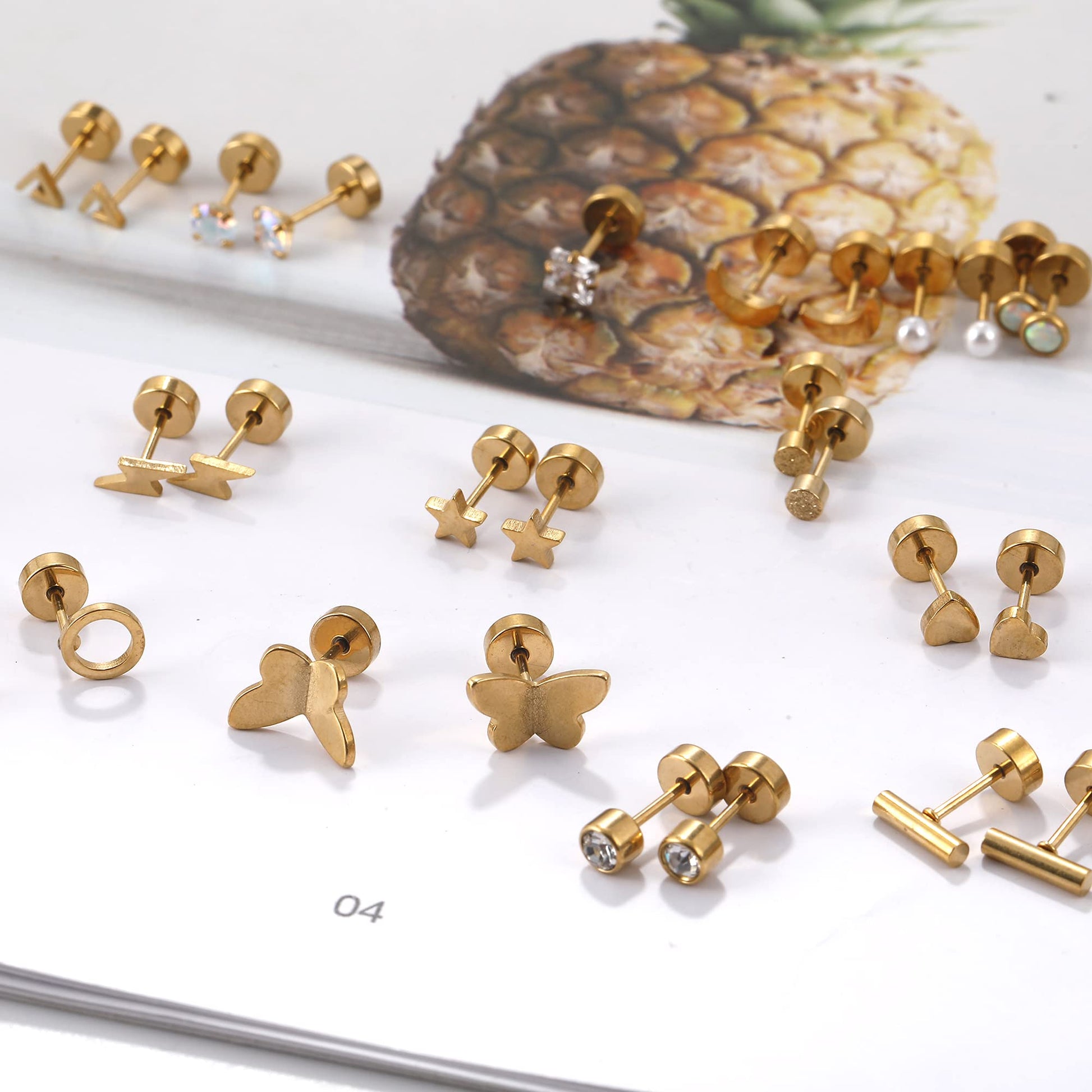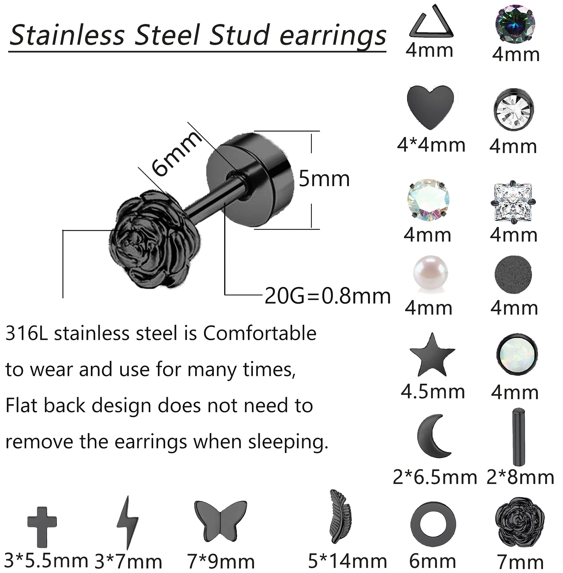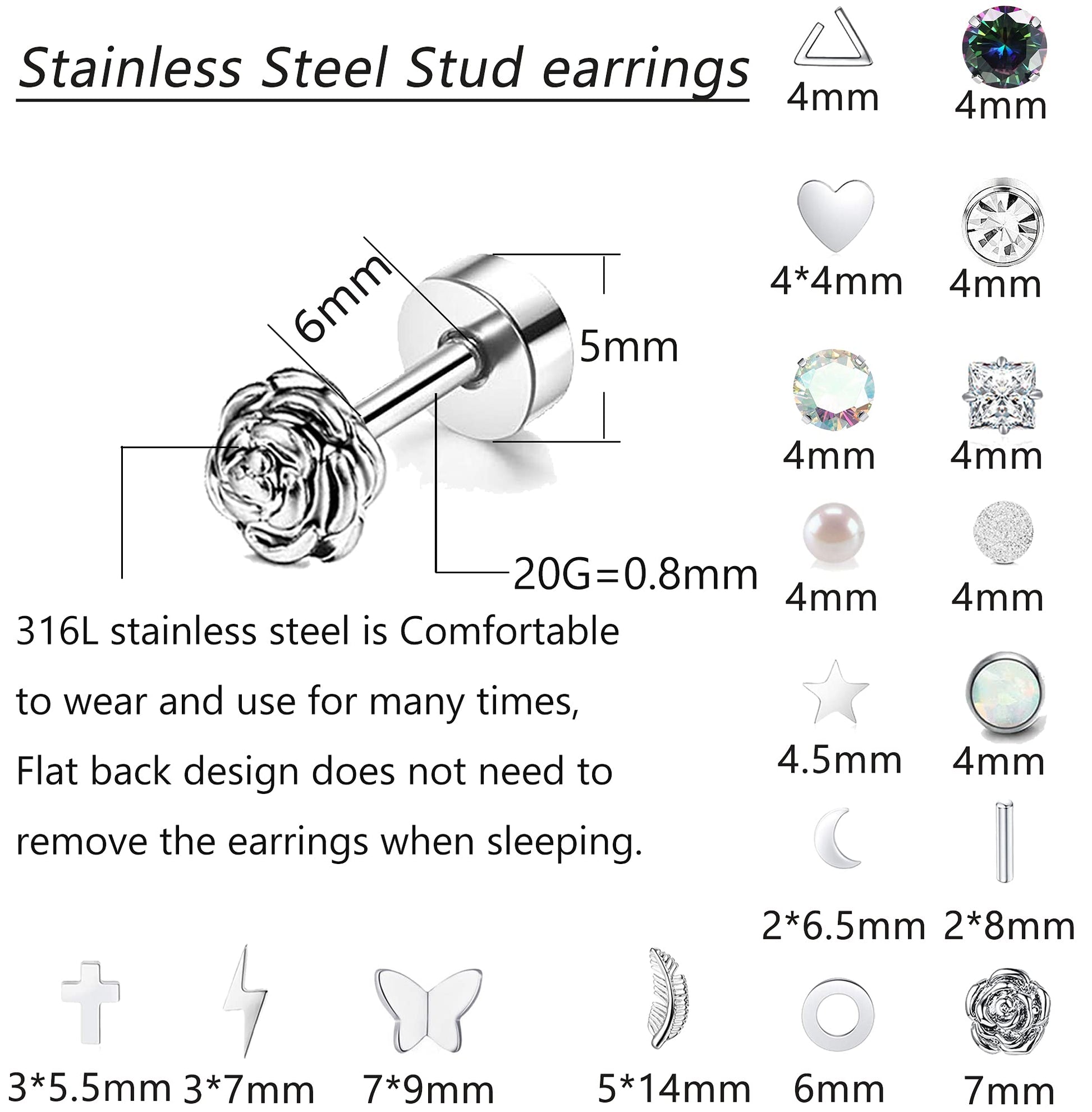 18 Pairs Stainless Steel Stud Earrings Set for Women Men Star Moon flower Heart Leaf Opal 20G Cartilage Earrings Hypoallergenic Flatback Earrings Piercing Jewelry