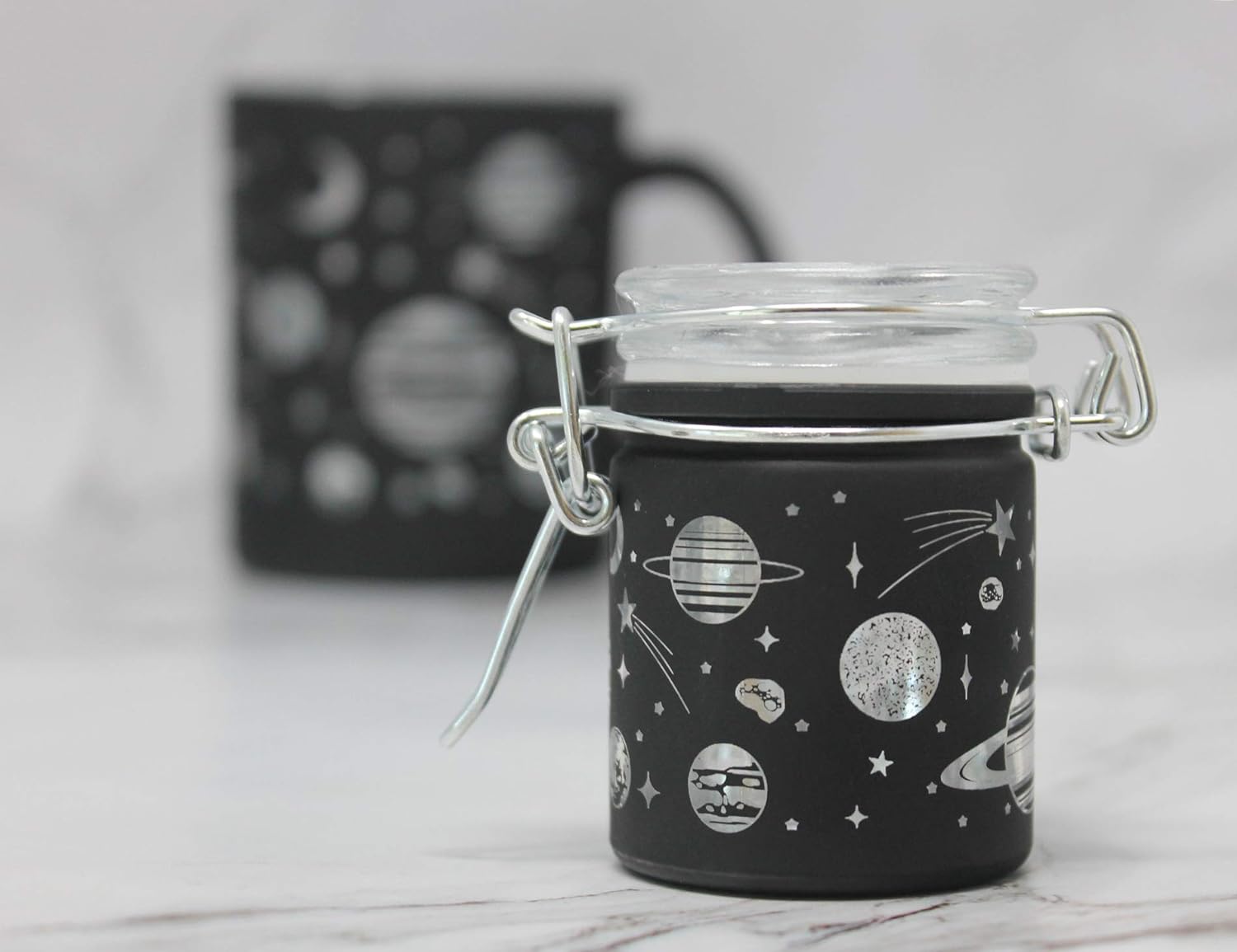 - HIGH STYLE: Clear glass lid and jar with a matte black outer coating that has crisp cutouts of celestial images.