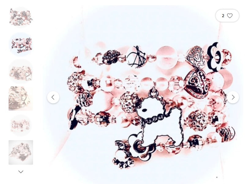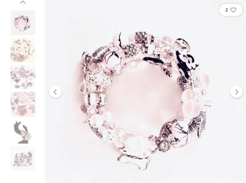 In a circle of complimentary colors, a combination of Pink and moonstone bicone crystals, pink and white glass hearts, semiprecious pink quartz, metallic silver/black flower spacers, silver charms, pink frosted glass beads, pink embellished steel beads, pink glass pearls and Scottie dog embellishments make this editorial piece unique, shining, and stunningly beautiful. A great original gift, perfect for pairing with designer jewelry or avant-garde fashion wear.
