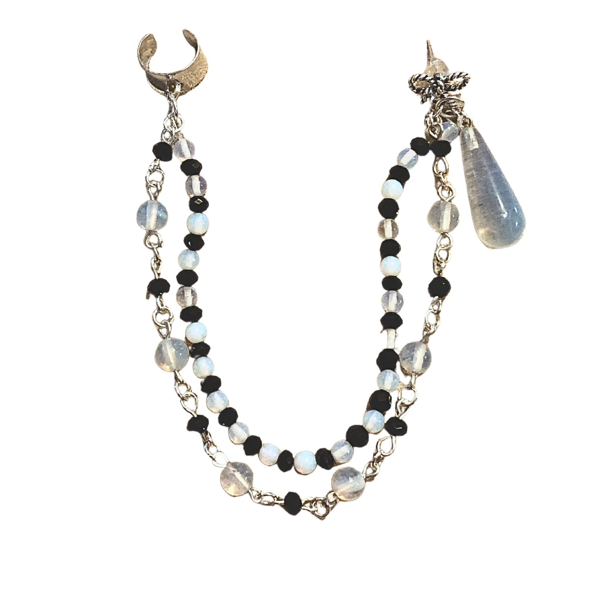 Limited edition. An original piece, constructed with sterling silver findings and a handcrafted chain with tiny polished Moonstone gem rounds. Secondary chain is a fine, light catching link chain with larger contrasting Moonstone rounds. Dual handcrafted chains. Black crystal beads are woven throughout the smaller chain. Finished with a faux Moonstone drop charm, an adorable braided bowtie ear lobe post, and a solid high shine silver ear cuff. Our jewelry is lead and nickel free!