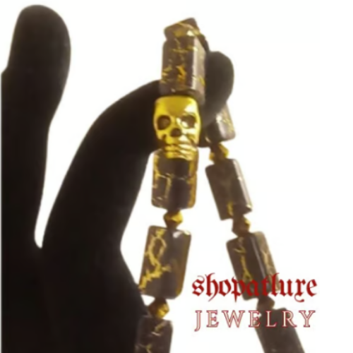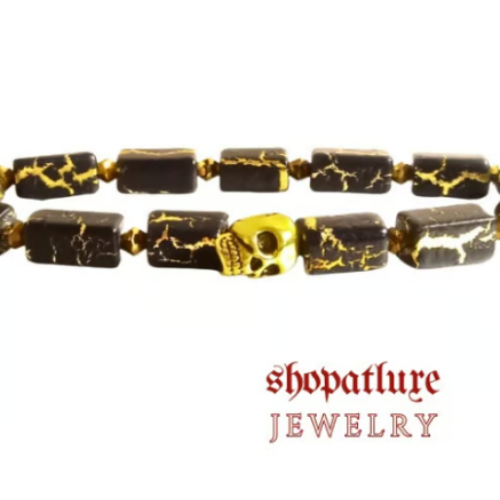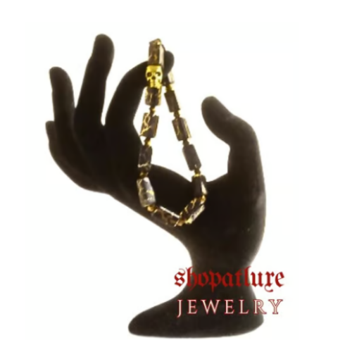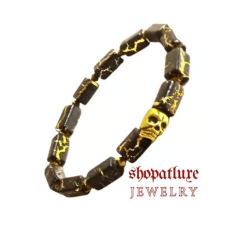 Newly released for our Global Tour Collection by ShopAtLuxe, this minimalist bracelet gives a nod to the designer's multiracial ancestry. This piece has a beautiful Sub Saharan influence to it's art. Handcrafted to order, this gender free expressive piece features a high shine golden skull charm, which is lead and nickel free, nestled among .5" black and gold beads, and alternating faceted gold crystals. Measures 7.5 inches to 8, with stretch cord. Medium weight; loose, casual fit.