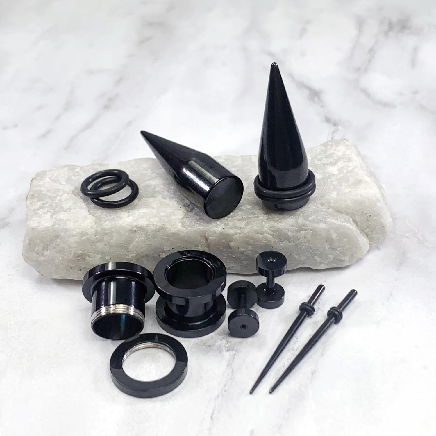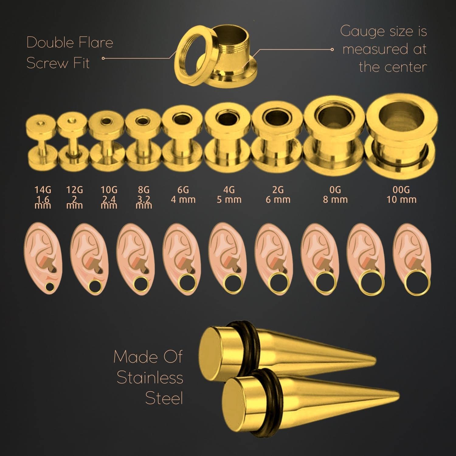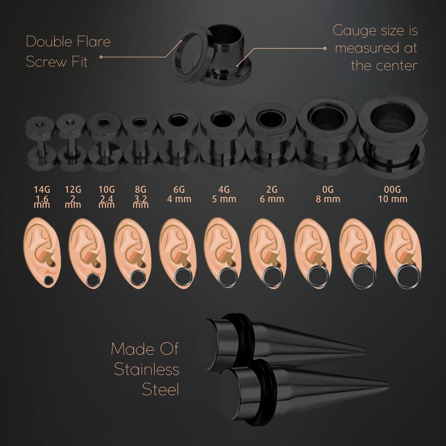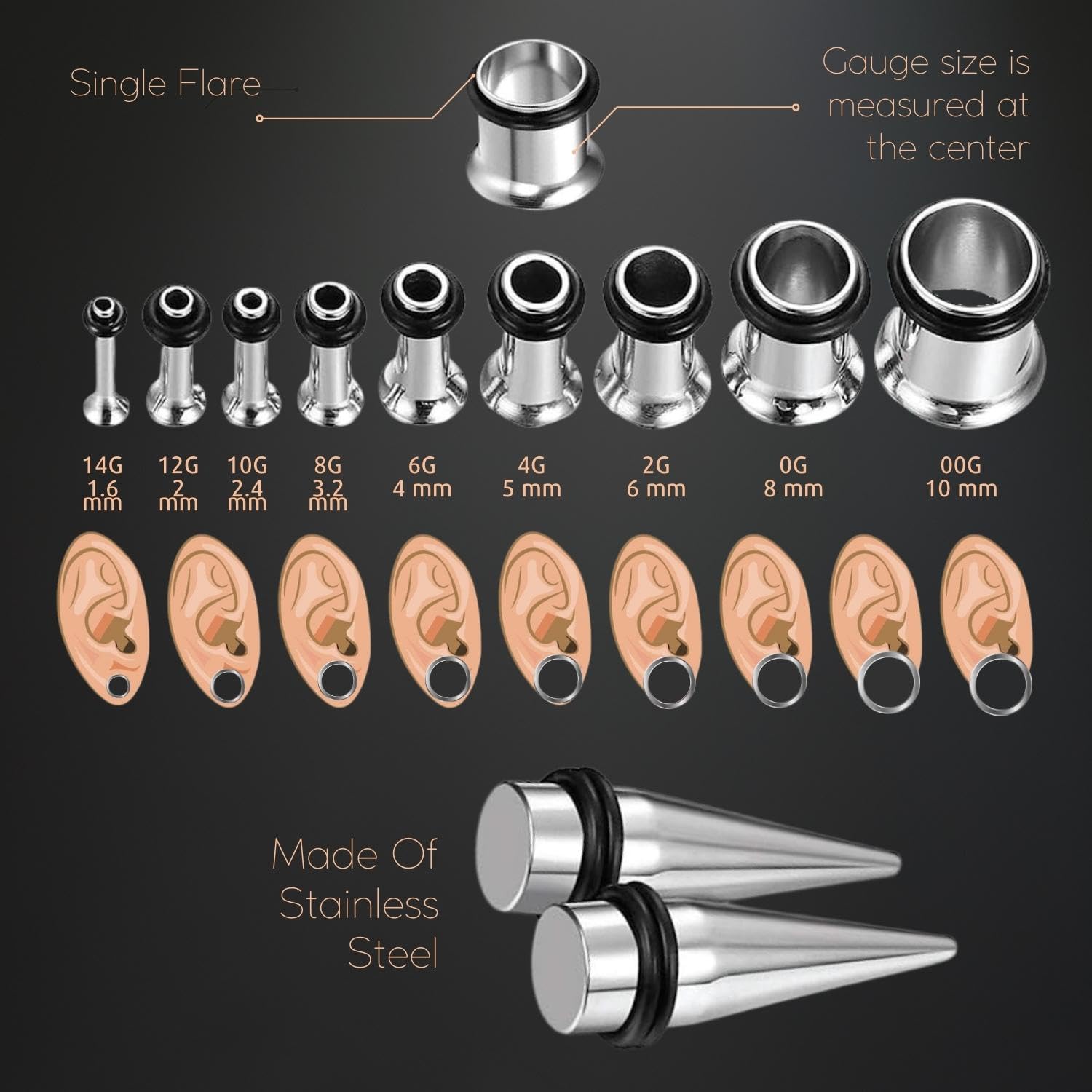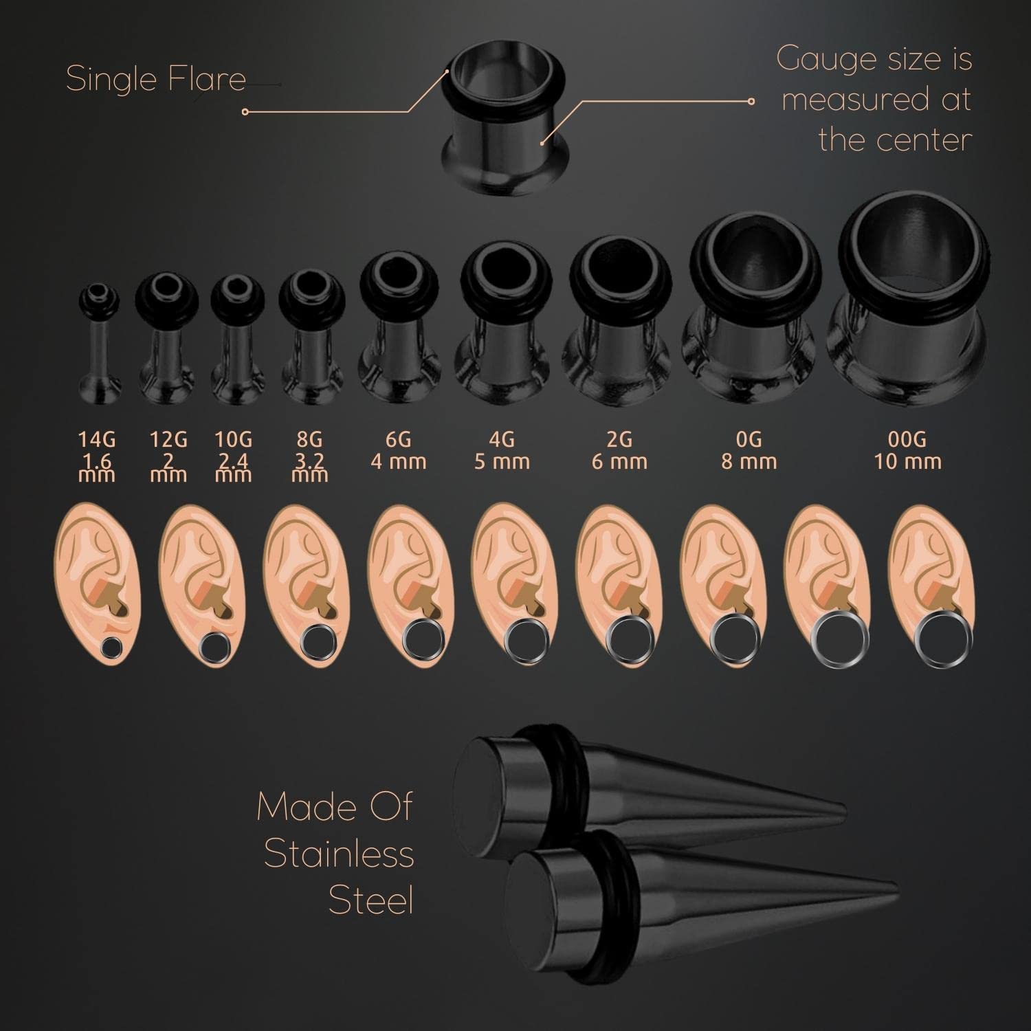 - COMPLETE GAUGING SET: Begin Ear Stretching Journey with 37-Piece Jewelry Kit - Surgical Stainless Steel Tapers, Single Flare Tunnel Plugs with O-Rings and Ear Balm. Start Easy with Smallest Size 14G (1.6mm) and Gradually Go Up to 00G (10mm), Included Natural Aftercare Will Make Sizing Up Easy, Safe and Comfortable.
