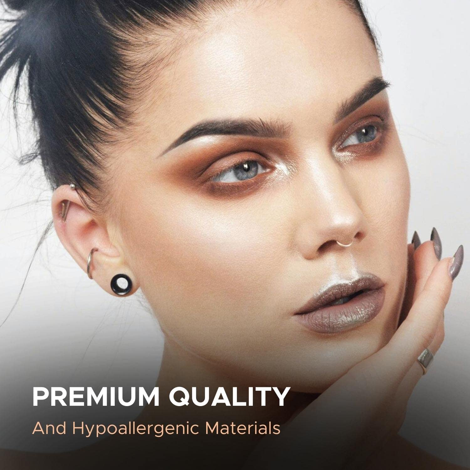 Stretch your earlobes safely and conveniently with our high-quality ear stretching kit. Includes surgical stainless steel plugs, tunnels, and natural jojoba oil for healthier stretching. Sizes range from 14G to 00G and 8G to 12mm.