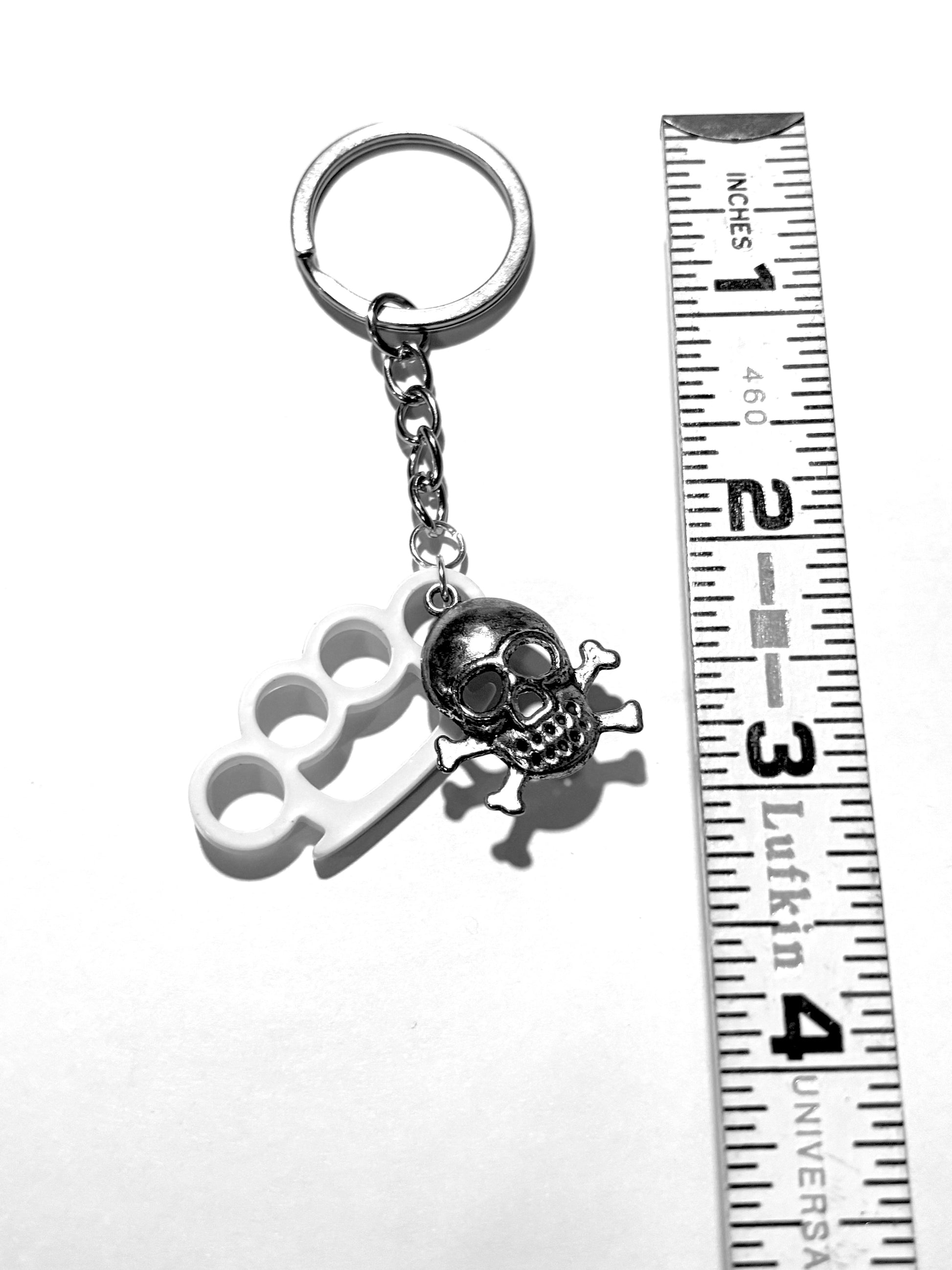 Description: - a custom crafted key chain with a dual pair of brass knuckles and a skull and crossbones pendants, made with a high quality steel metal split key ring, including a complimentary gift included! See image for close measurements.