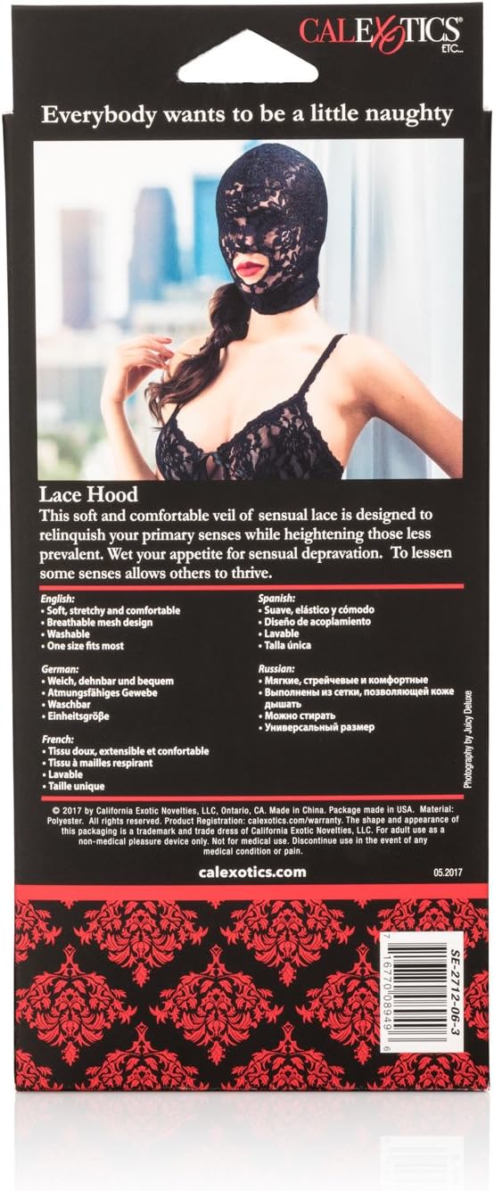 CalExotics Scandal Lace Hood is ideal for couples looking to experience with sensory pleasure play and dive into thrilling, erotic adventures. Surrender yourself to your lovers every whim once you slip on this sexy lace veil. The luxuriously soft mask creates a sight restricting sensation that heightens sensitivity, elevate pleasure and intensify arousal for everyone involved. Give into primal desires and give into to scandalous pleasure with the sexy open mouth design. Since 1994, CalExotics has been the world’s leading pleasure products manufacturer and is dedicated to being a consumer-friendly brand for men and women. We understand that to truly encourage sexual wellness, the intimate toy industry needs to create products that enhance pleasure in your everyday life and cultivate a happier and more satisfied you. CalExotics has taken the very limited intimate toy options from the past and created a world of pleasure products for men, women and couples. By revolutionizing the way we see intimate products, CalExotics has been able to help everyone find confidence in their sexuality and promote sexual self-awareness. At CalExotics, we want you to expect more. Expect more passion, expect more romance and always expect more fun.