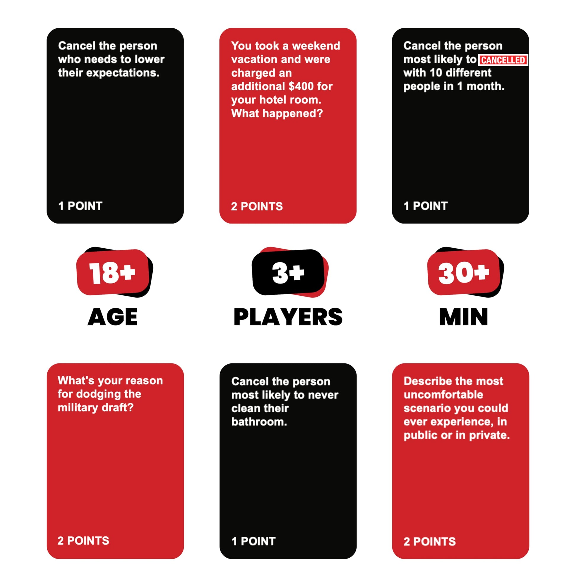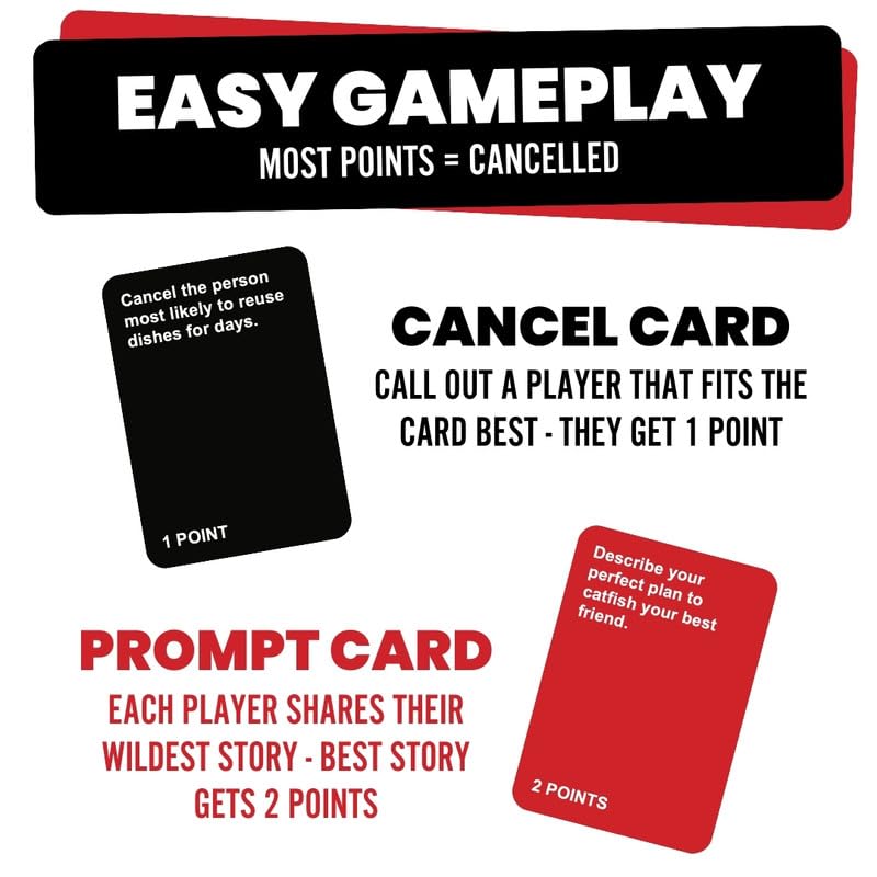- Easy to Play - Cancelled was designed to stir the pot and become your go-to icebreaker. This card game is easy to pick up and play as a quick 30 minute game, or for hours all night!