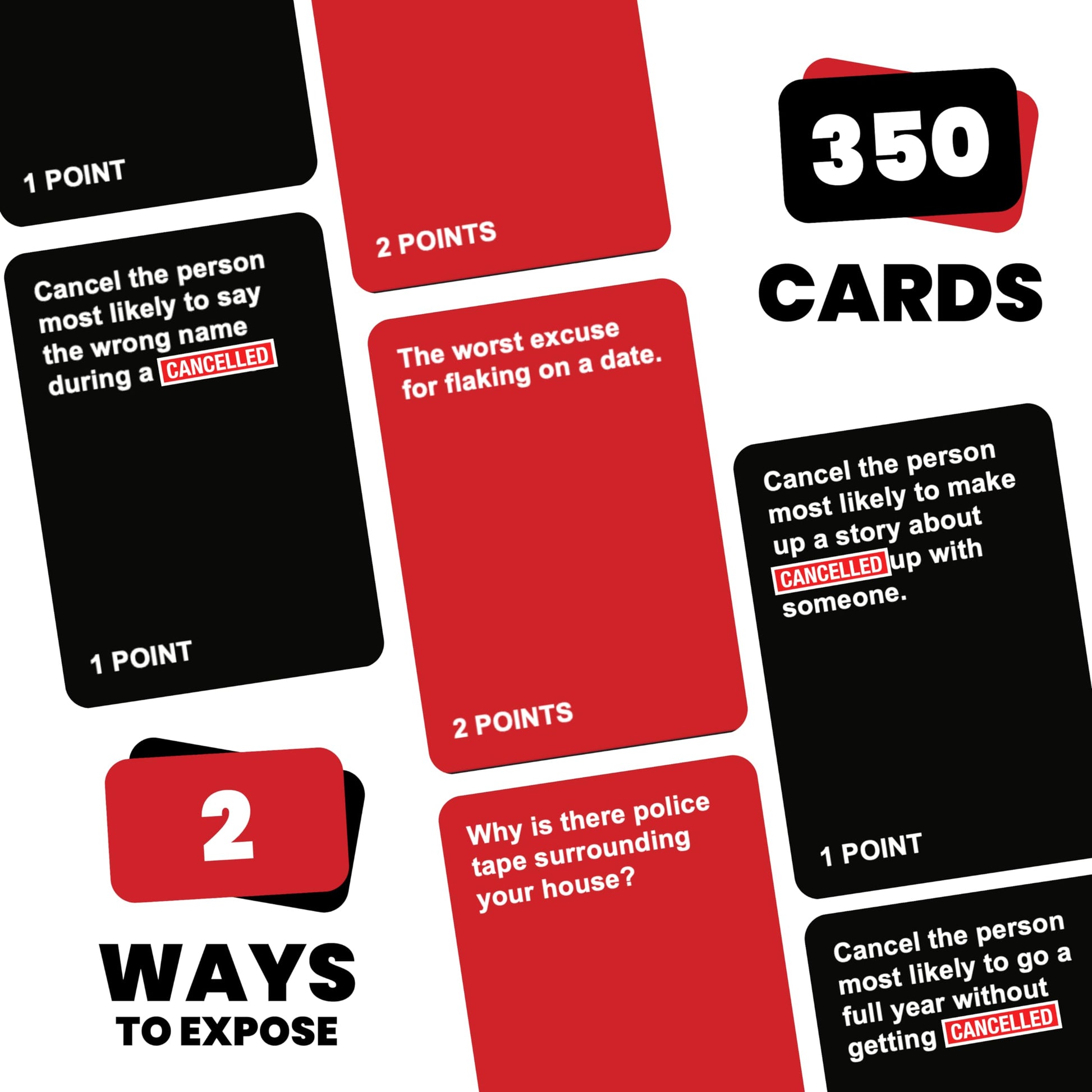 - 350 Entertaining Cards: Cancelled is a fun and exciting card game for adults, ideal for game nights, pre games, after parties and college get-togethers.