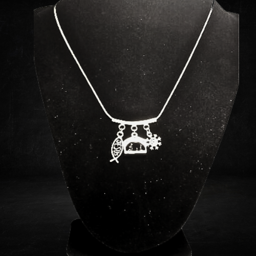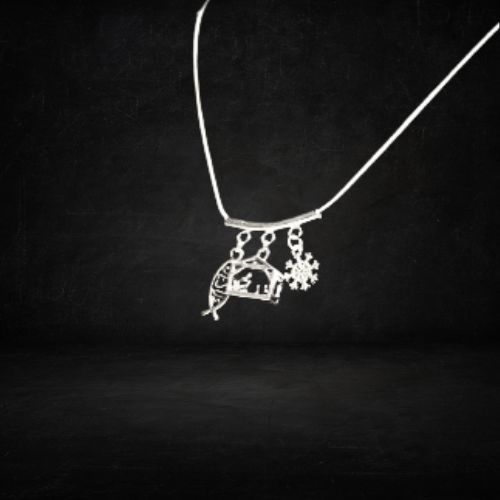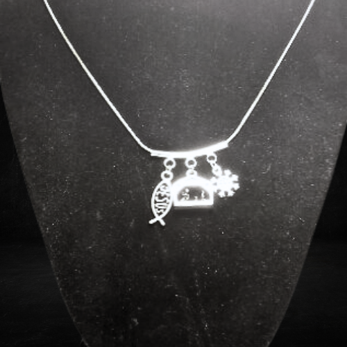 Details: An adorable necklace with three pendants, (Jesus Greek Fish, Bethlehem Stable, Snowflake,) suspended from a unique tube bail fitted onto a Sterling Silver snake chain. Length: 20 inch silver traditional flat link chain with extender, and a silver star drop charm embellishment. Lobster claw closure. Lead and nickel free; hypoallergenic. Lightweight fit.