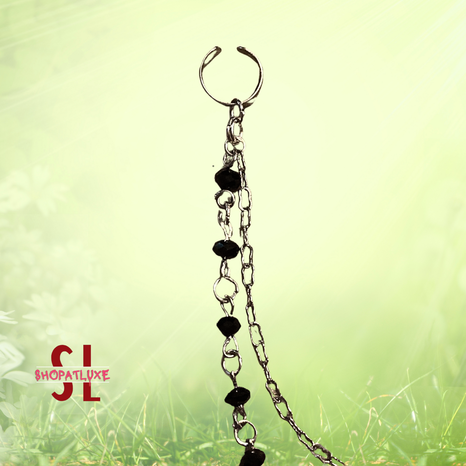 An original limited edition piece, this accessory is constructed with a sterling silver and beaded handcrafted dual chain. Both chains are a fine, light catching link chain, attached to a graffiti paint spattered captive ring (10mm) and silver ear cuff; finished with a tiny spider/web charm. Our jewelry is lead and nickel free!
