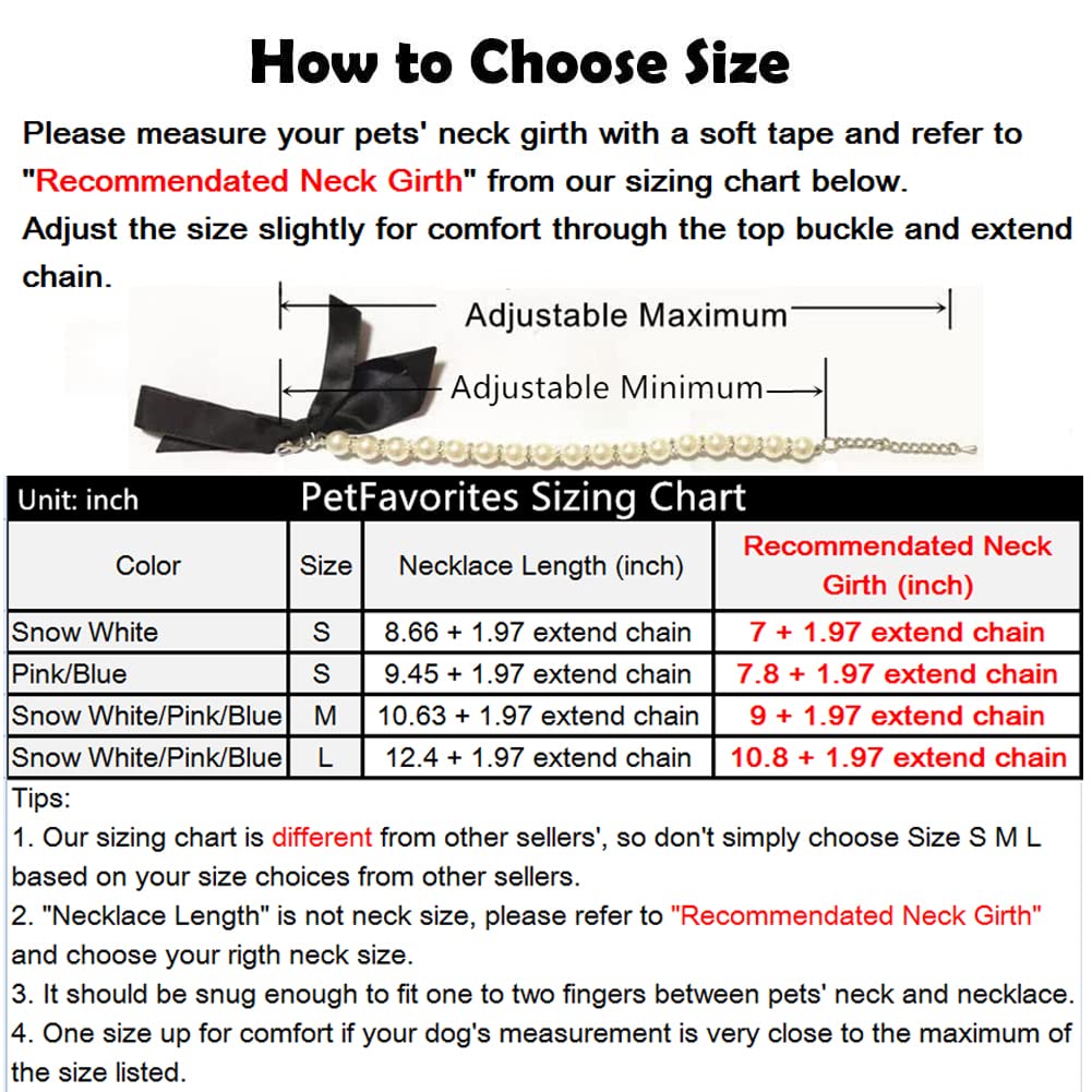 - US Popular Pet Registered Brand: PETFAVORITES. Three sizes in three colors available. Sizing for each pet is unique. Please measure your pets' neck size precisely and refer to our sizing chart in the fifth product image before shopping PetFavorites Dog jewelry necklace.