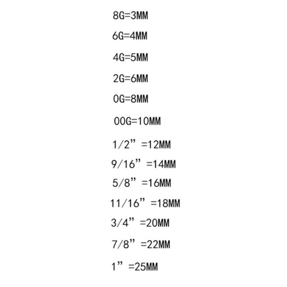 - 【Available Gauge Size】2g (6mm),0g (8mm), 00g (10mm), 1/2" (12mm), 9/16" (14mm), 5/8" (16mm), 11/16" (18mm), 3/4" (20mm),7/8"(22mm),1"(25mm). Please make sure to choose the correct size of the ear plug and tunnel.