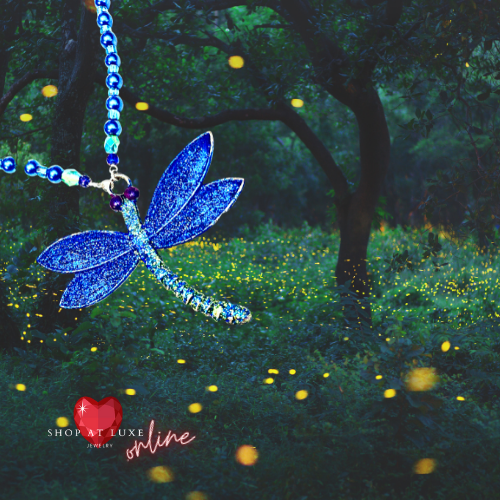 Newly constructed, this resort wear Chainmail Necklace will stun your travel companions! Blue Rings are interconnected with sapphire blue glass beads on a silicone strand throughout, for extra stretch. A shimmering sapphire blue dragonfly is suspended from the chain. This is an exclusive design. Silver toggle closure; 22 inches in length.