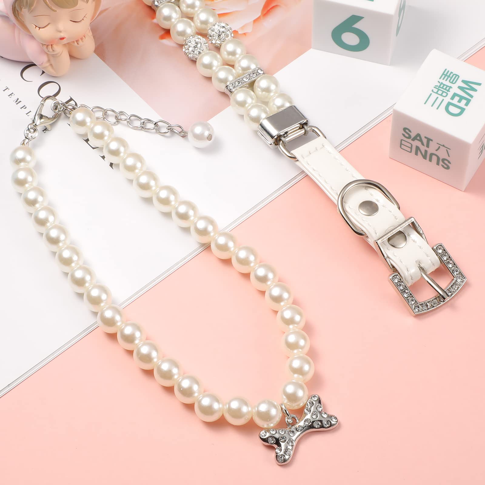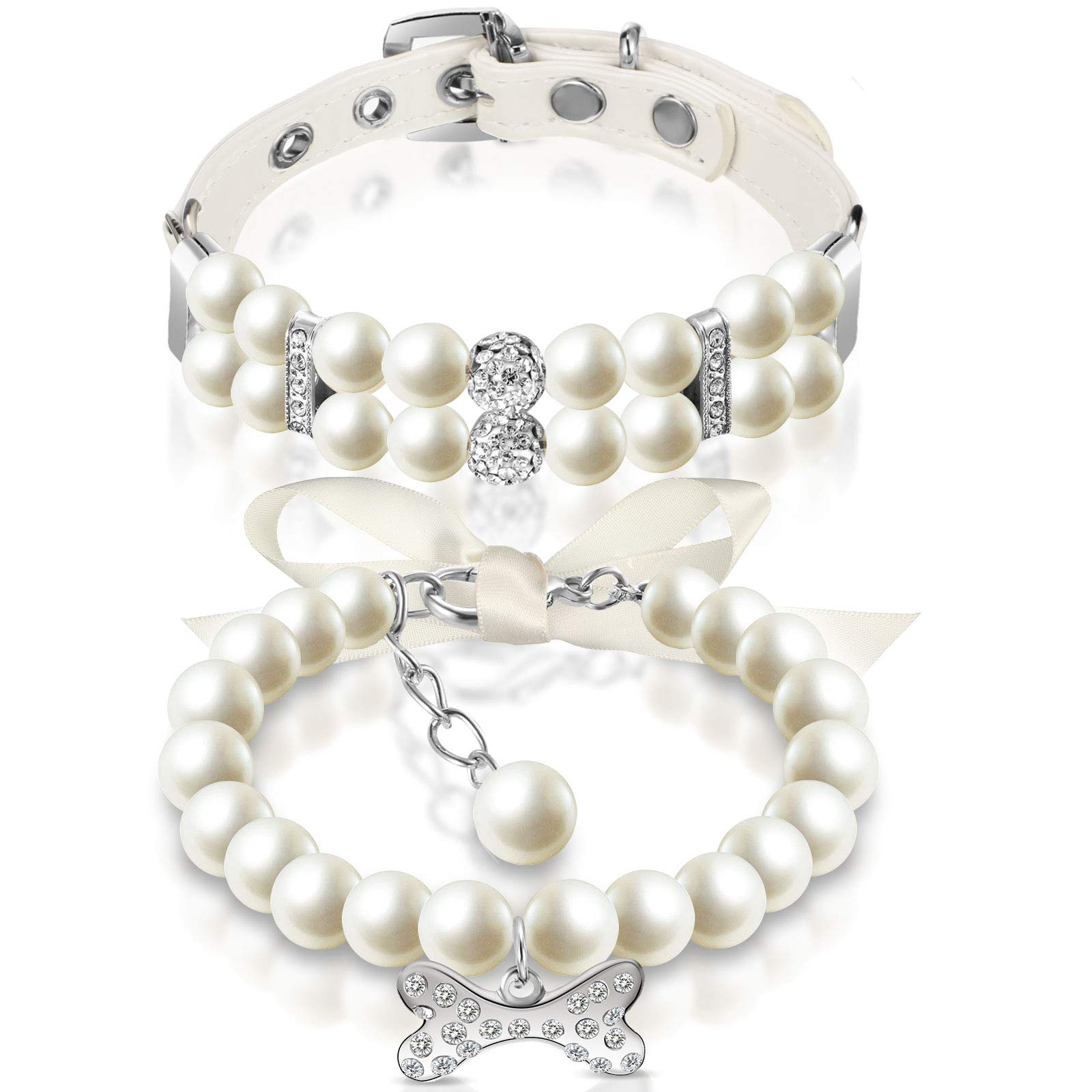 Hicarer 2 Pieces Small Dog Cat Pearl Collars and PET Pearl Necklace Set Cute Fashion PET Pu Leather Collars Necklace with Crystal Rhinestone for Dogs Cats Puppy Kitten Wedding Birthday Party (S)