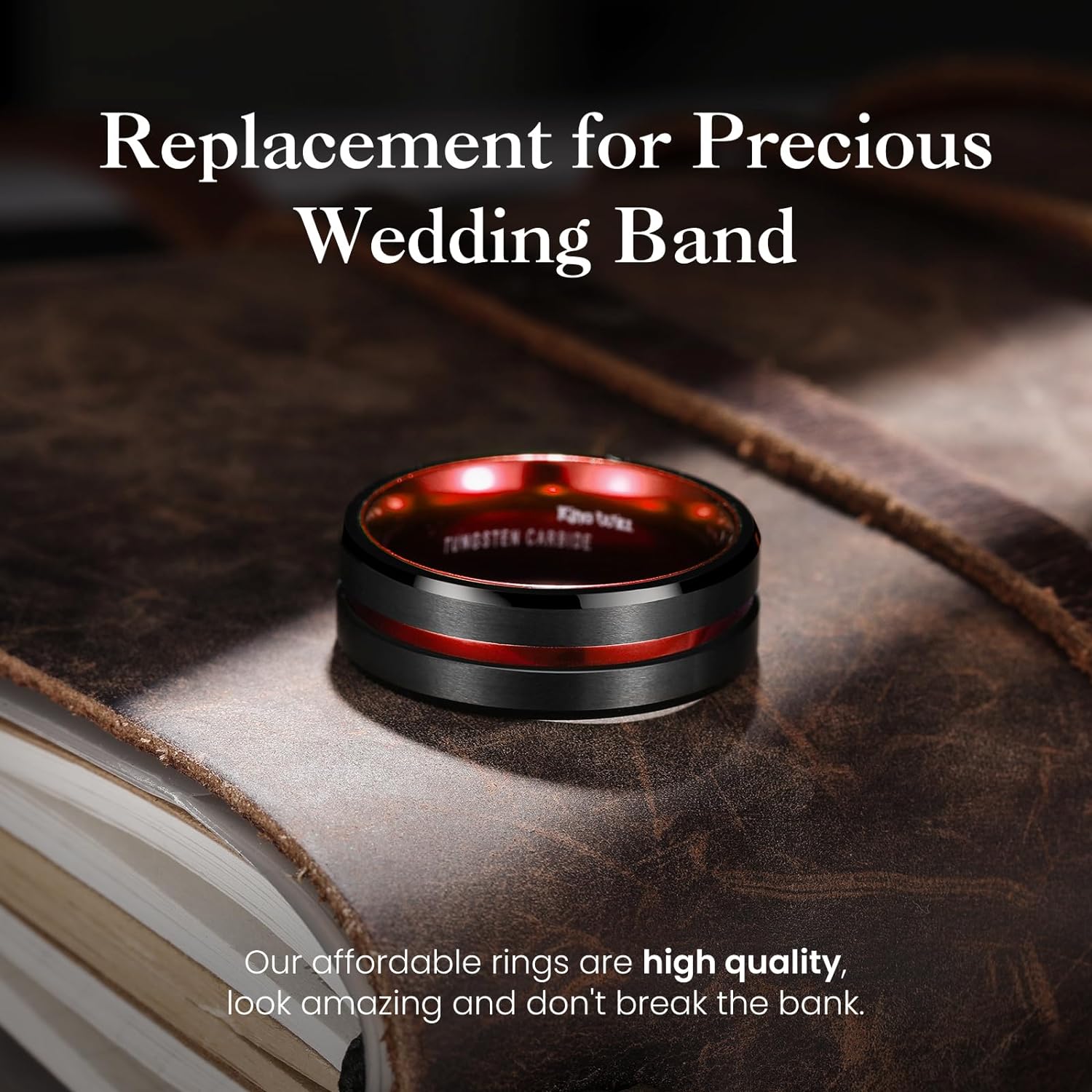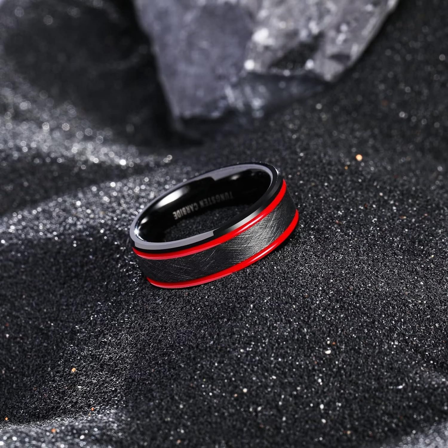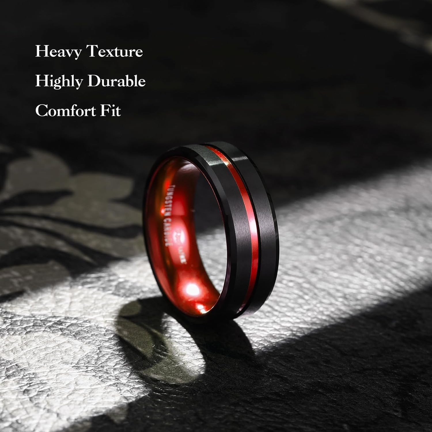 - ✔️CLASSIC DESIGN: 8mm Black Matte Finish & Red Tungsten Carbide Ring