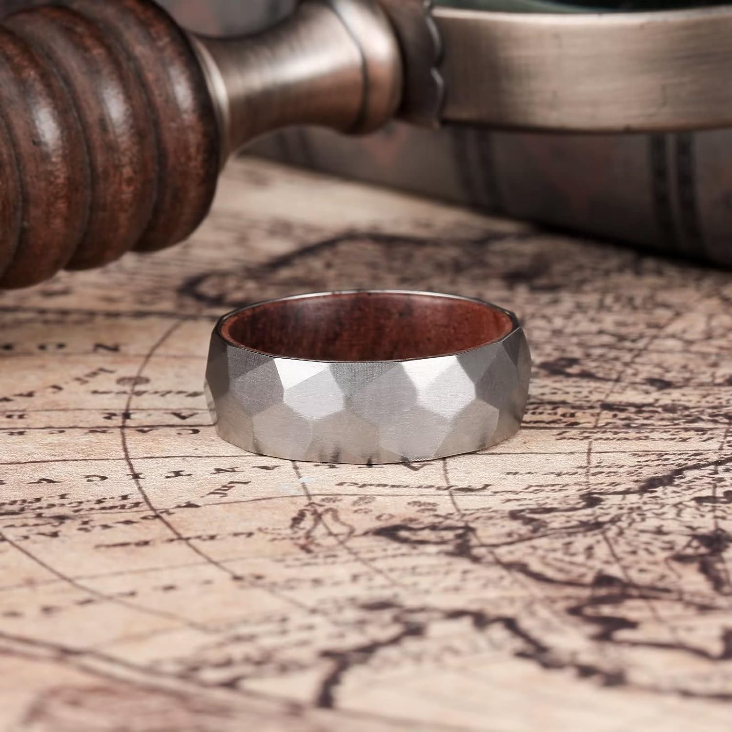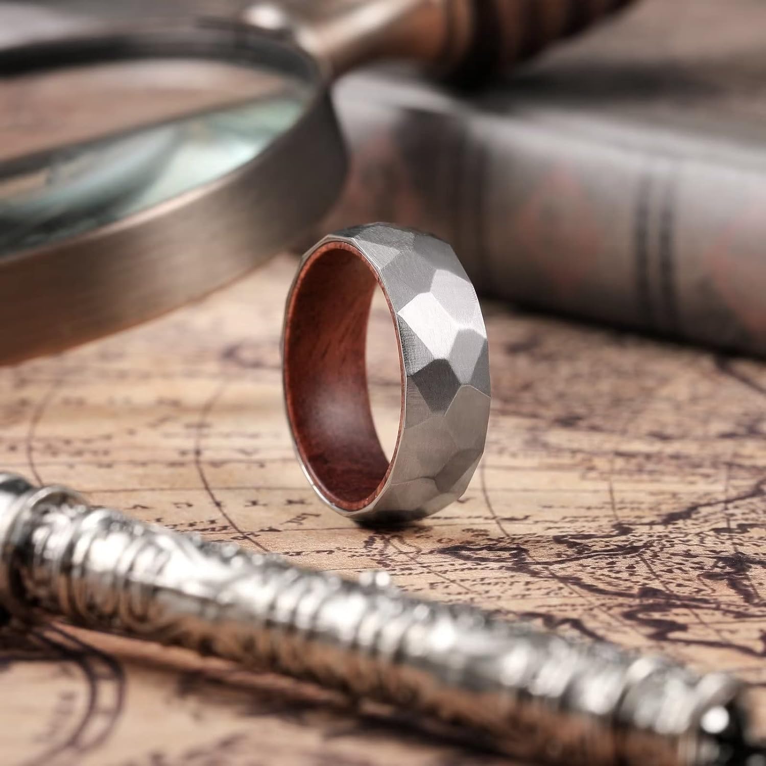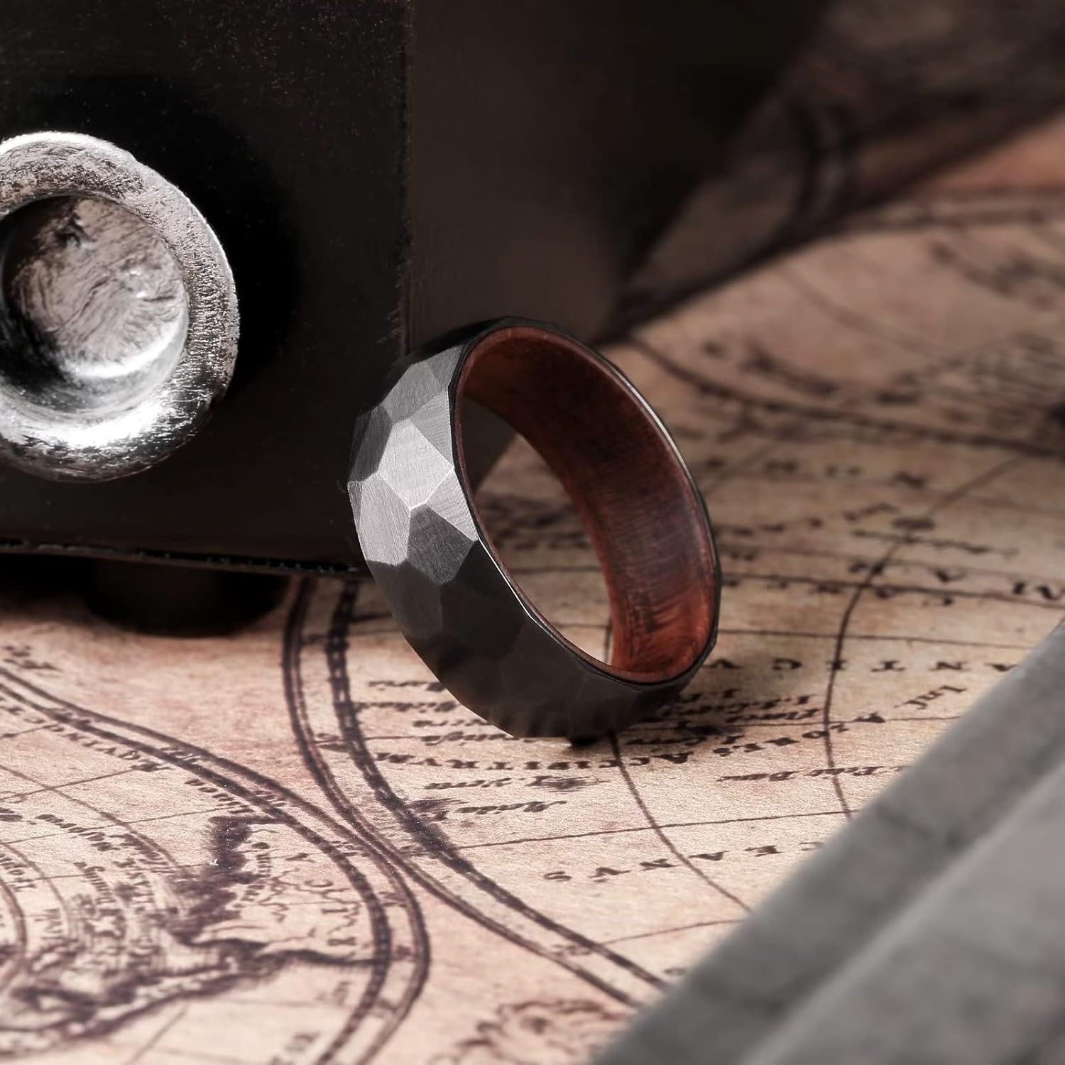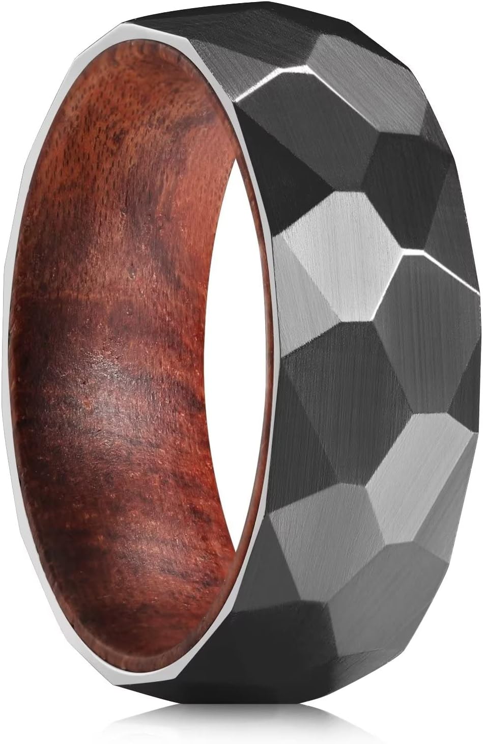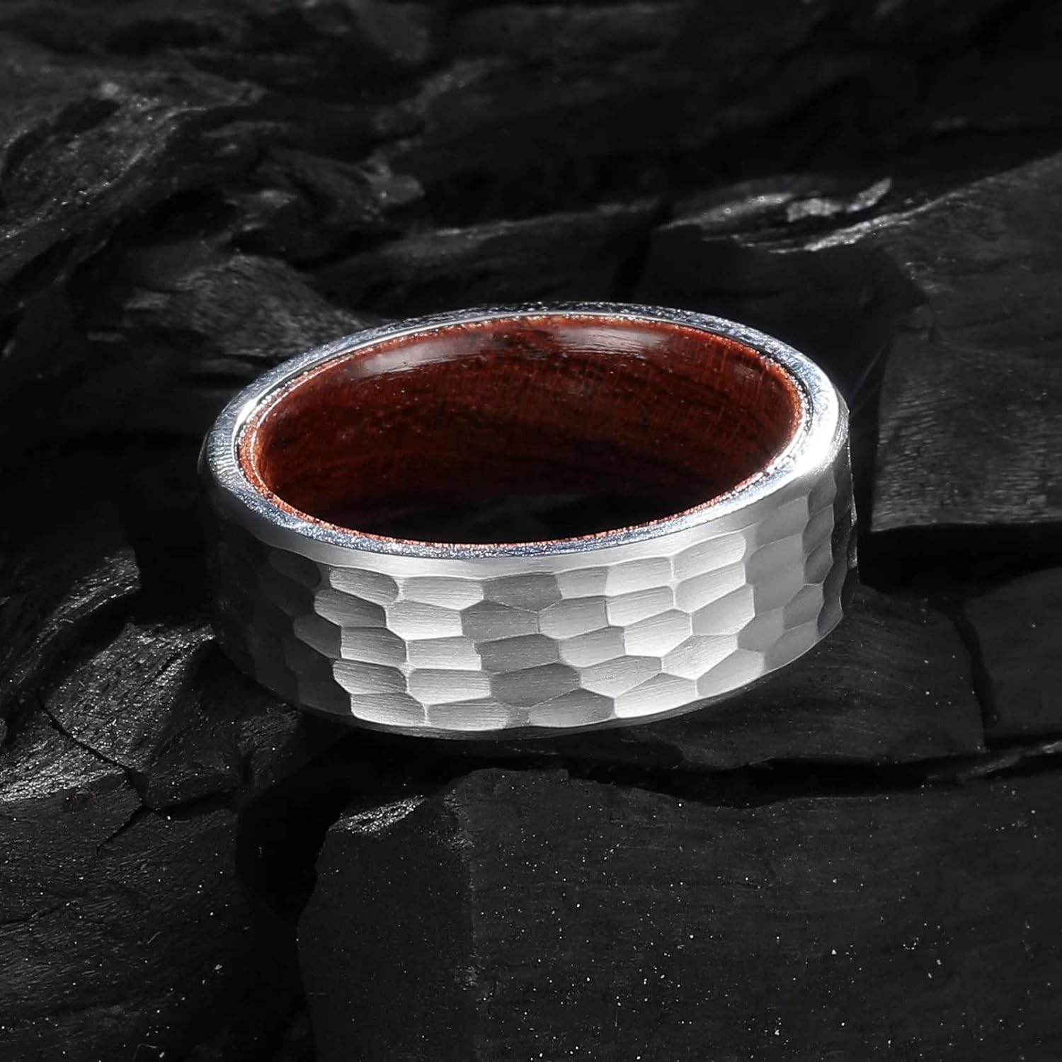 King Will 6mm/8mm Silver/Black Hammered Titanium Ring Inlaid Wood Inner Hole Wedding Band for Men Matte Brushed Comfort Fit