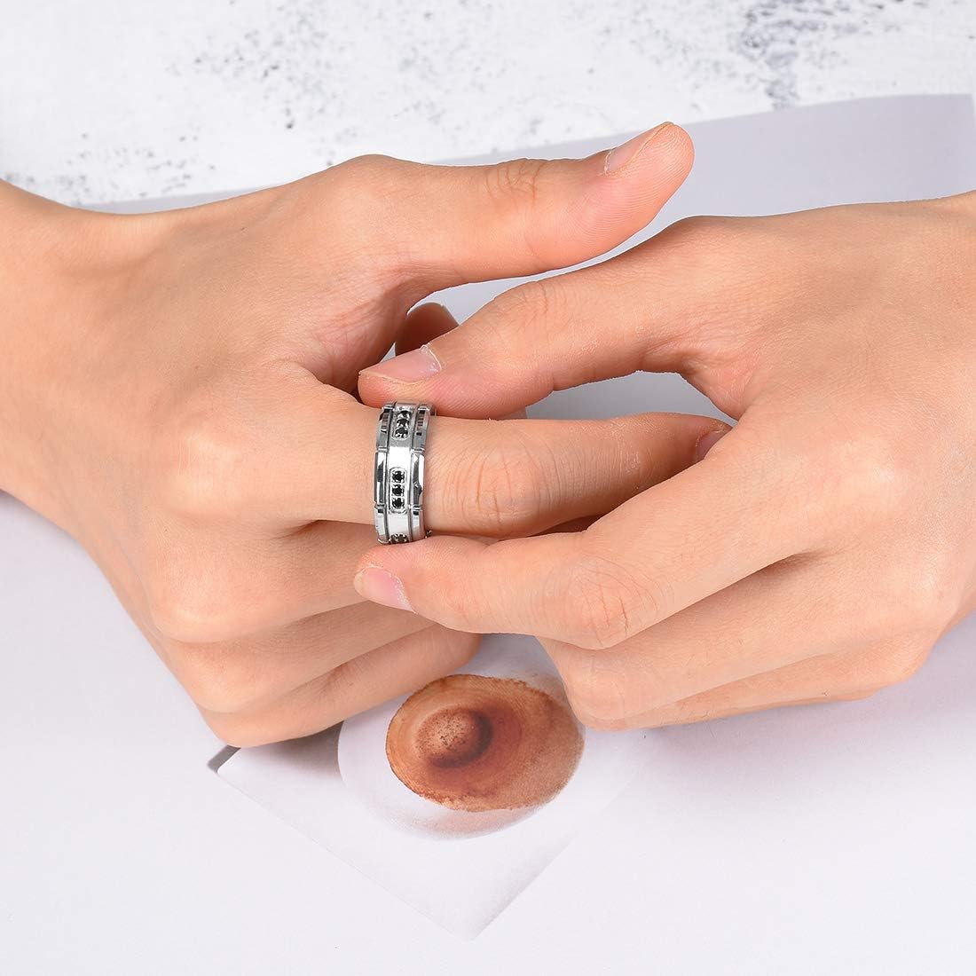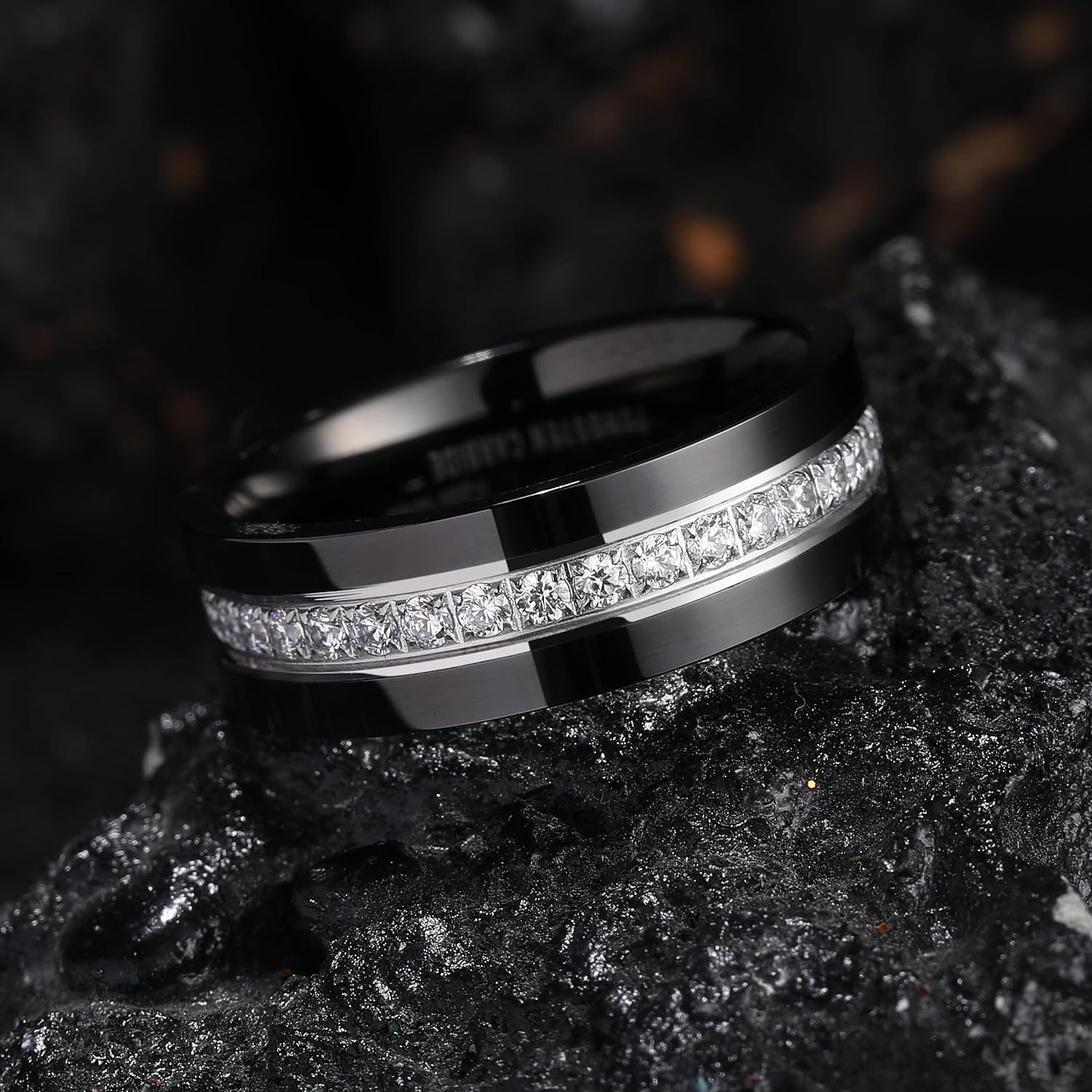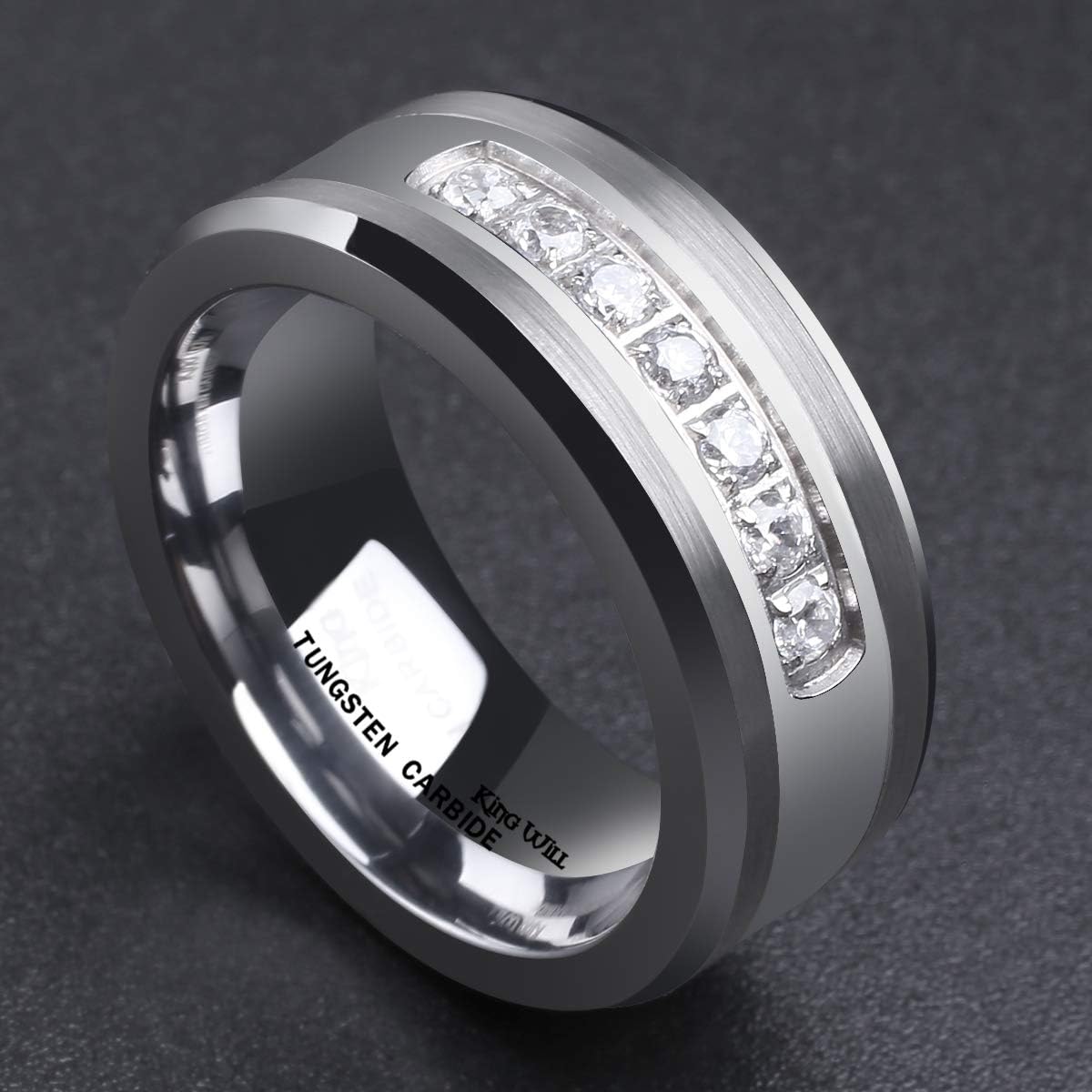 King Will GEM Mens 8mm Black Polished Finish Tungsten Carbide Ring Cubic Zircon Stones Flat Style