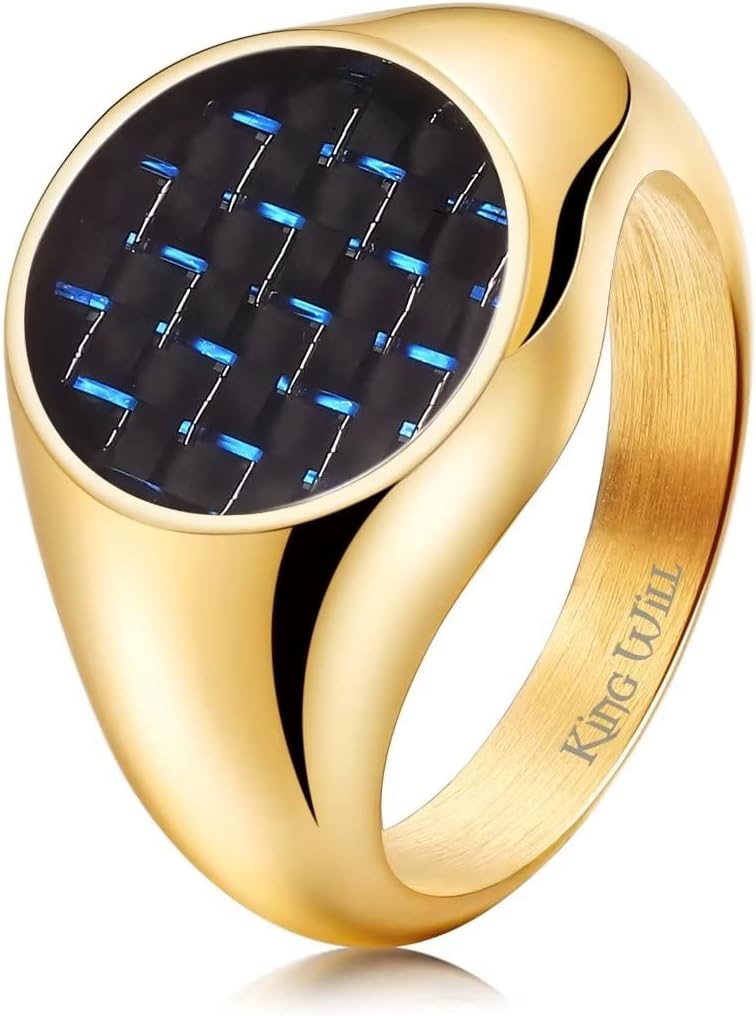 - ✔️FASHION DESIGN: GENTLEMAN Gold Signet Ring Solid Polished Stainless Steel Ring Blue Black Carbon Fiber Inlay.