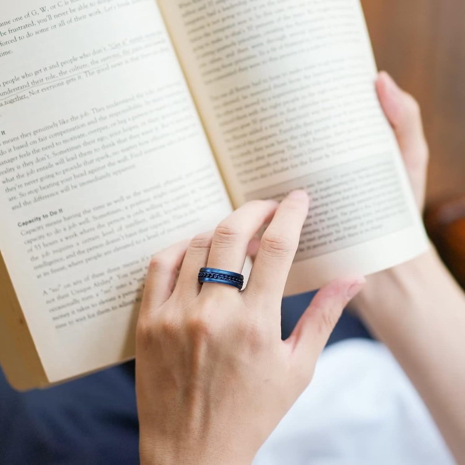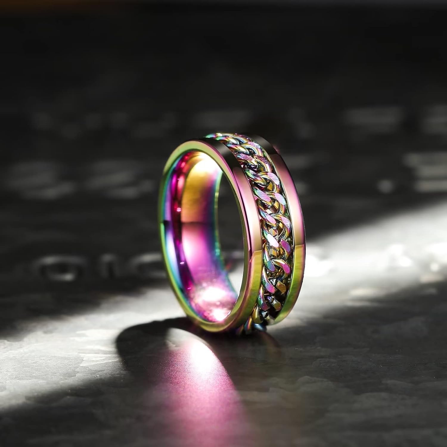 - ✔️SPINNER DESIGN: Polished Edge and Black Curb Chain Inlaid Design Relief Fidget Anxiety Ring, Masculine and Trendy.