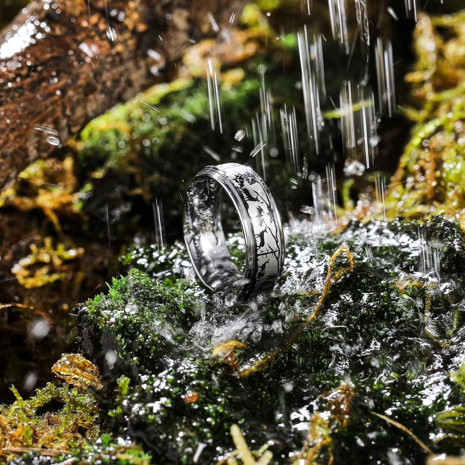 - ✔️FASHION DESIGN: 8mm Laser Hunting Mountain Tree Forest Landscap Tungsten Ring, beautiful scenery into the forest tungsten ring.