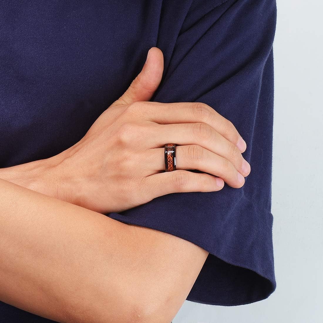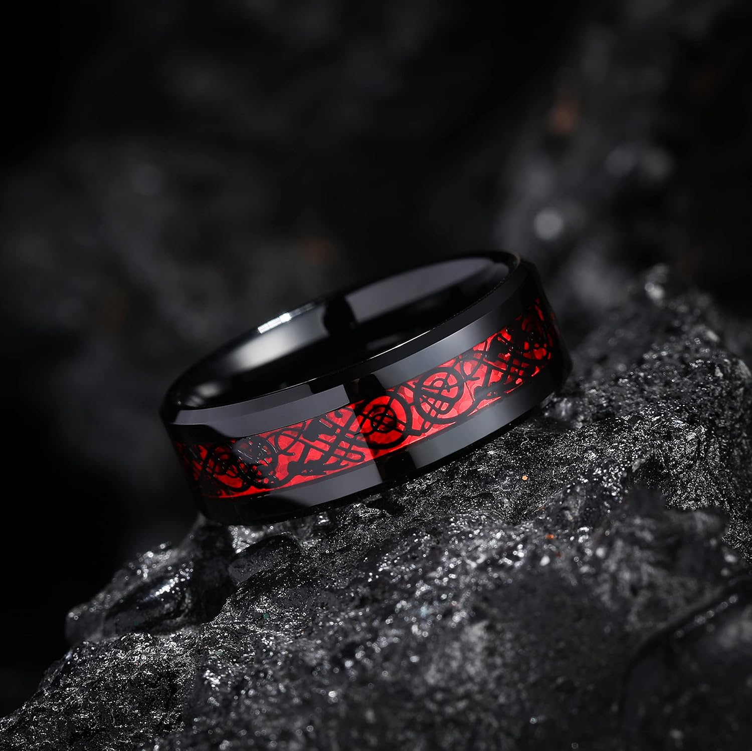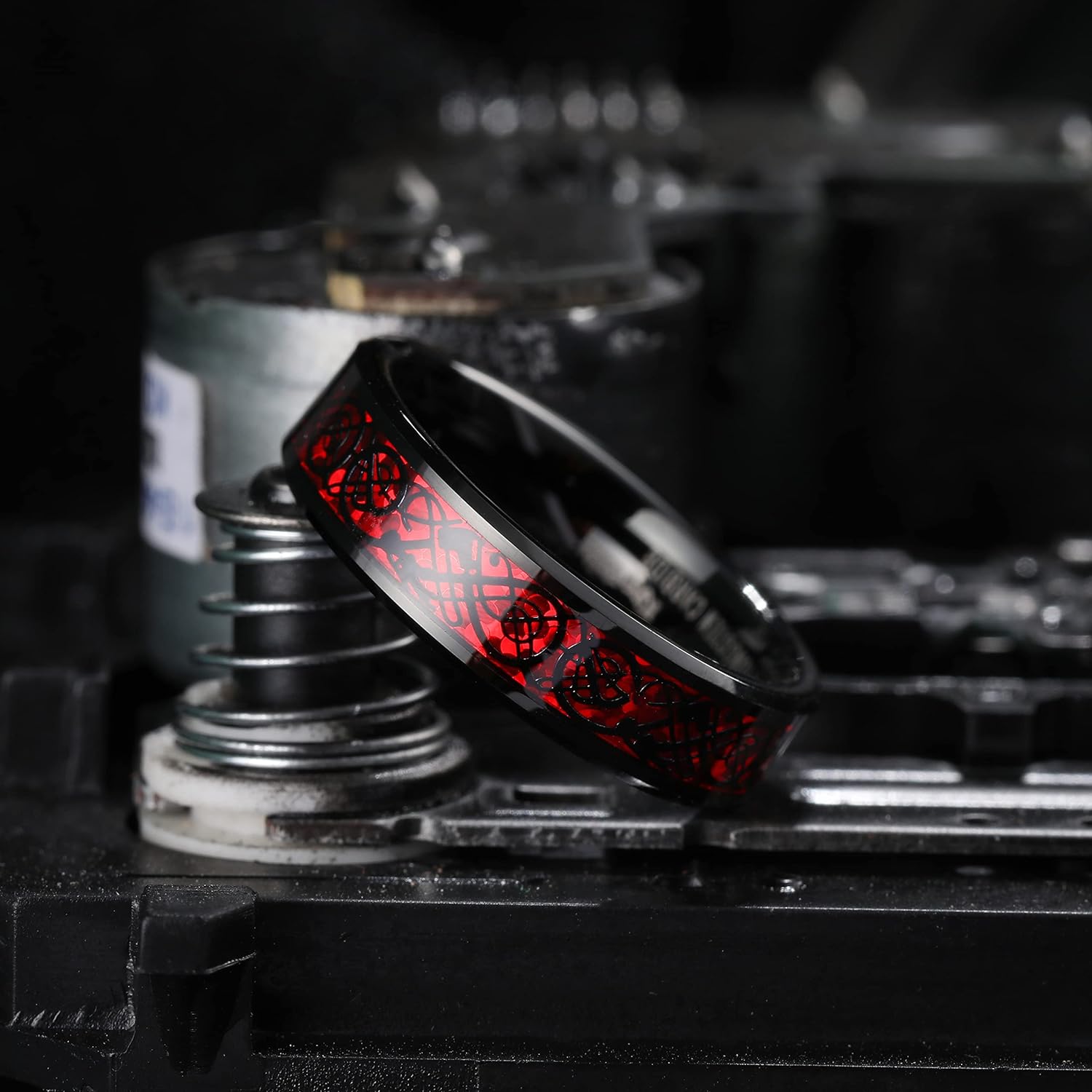 - ✔️CLASSIC DESIGN: Unique black celtic dragons with red background inlay, which is an 8mm extraordinary wedding ring.