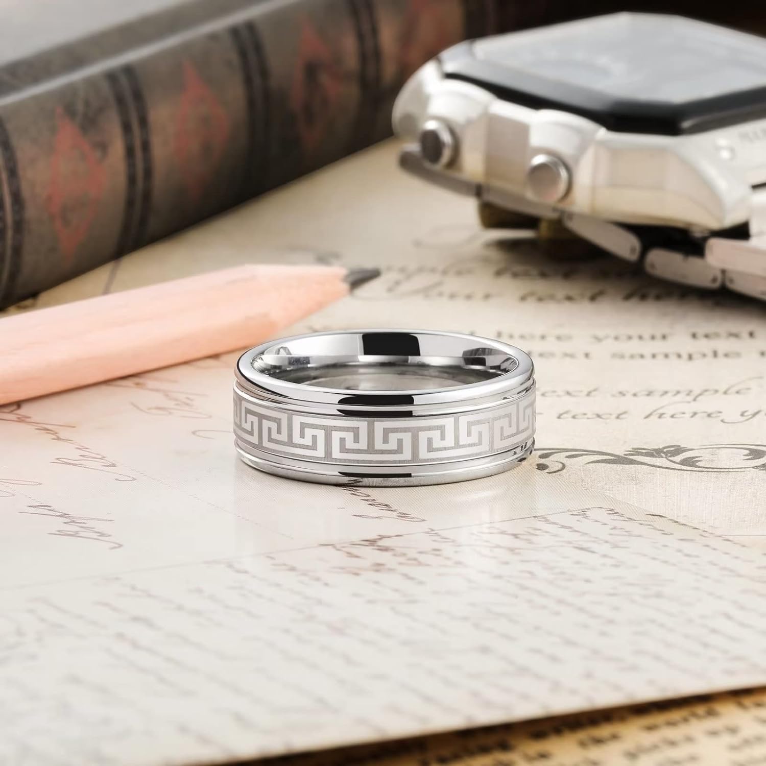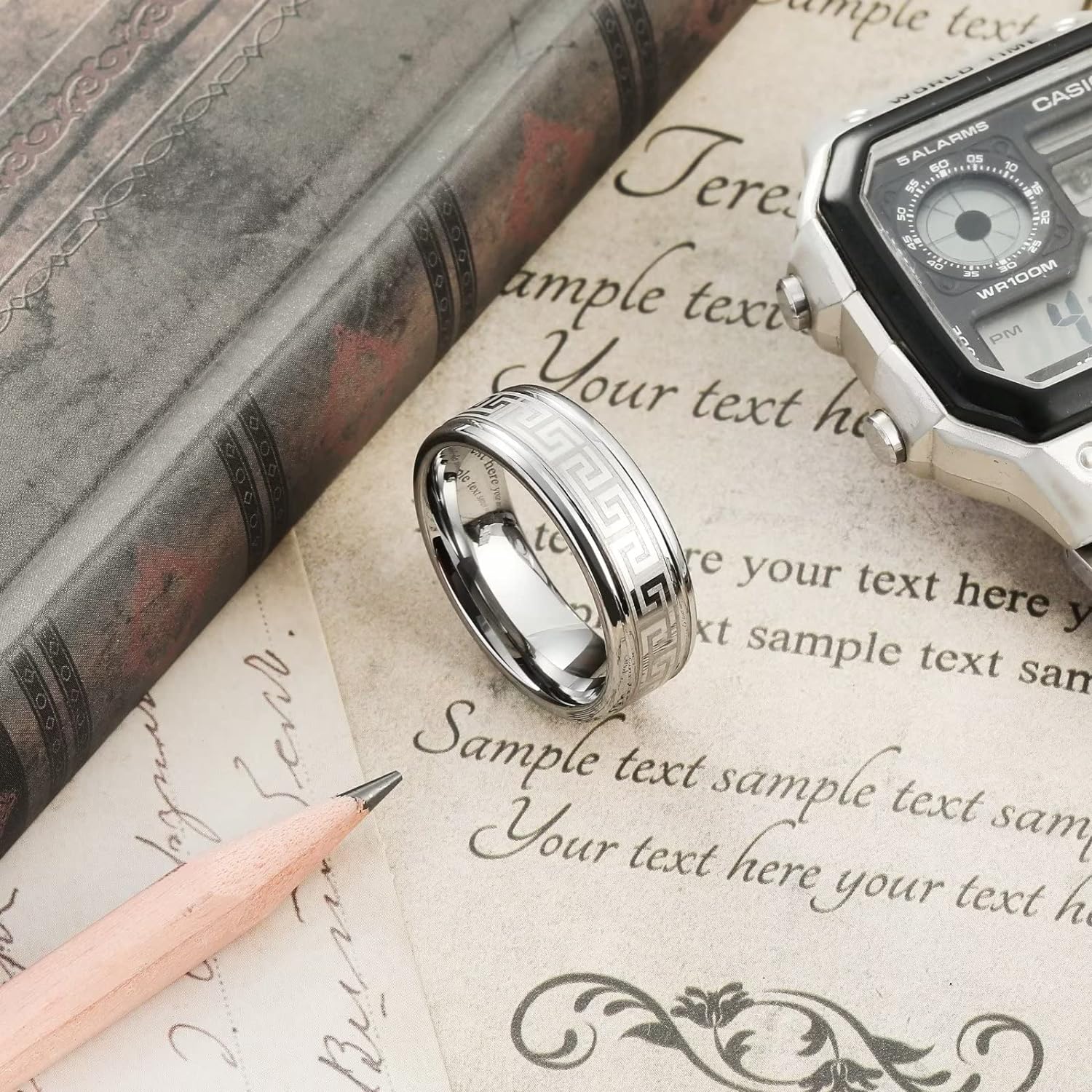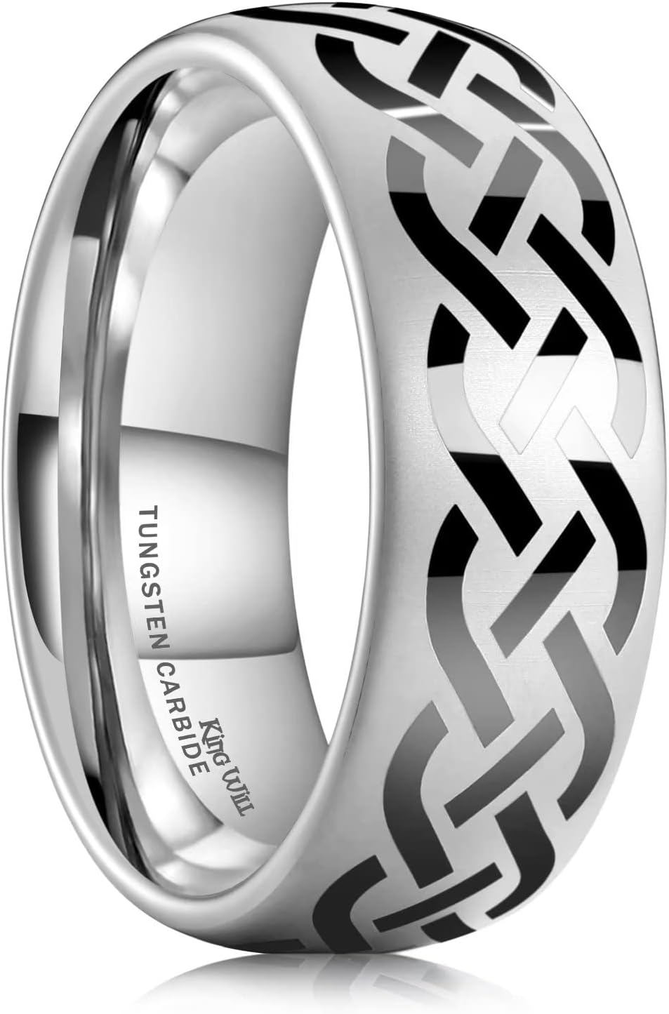 King Will Silver Black Celtic Knot/Greek Key Tungsten Wedding Rings Two Grooves Edge Laser Polished Celtic Knot/Greek Key Center and Matte Brushed Surface Wedding Band for Men Women