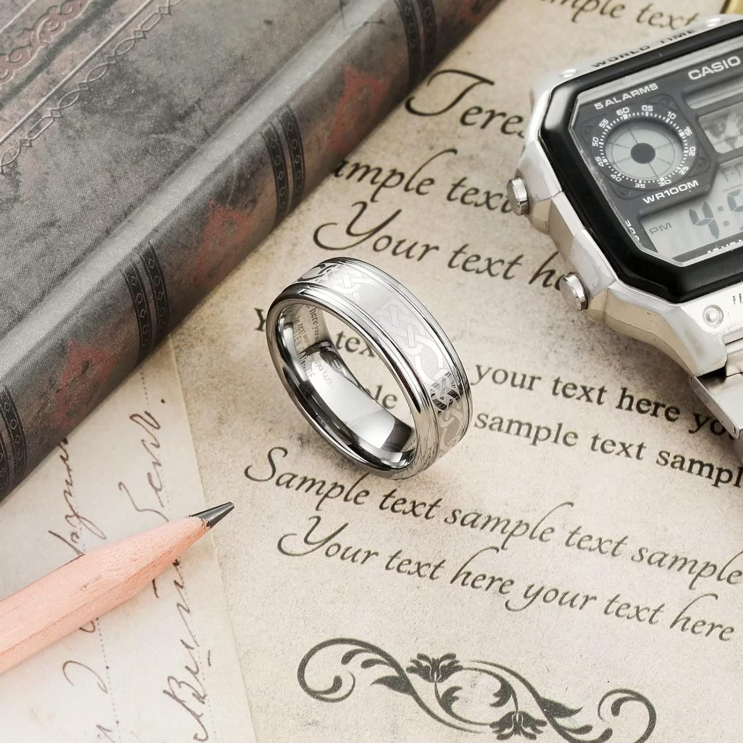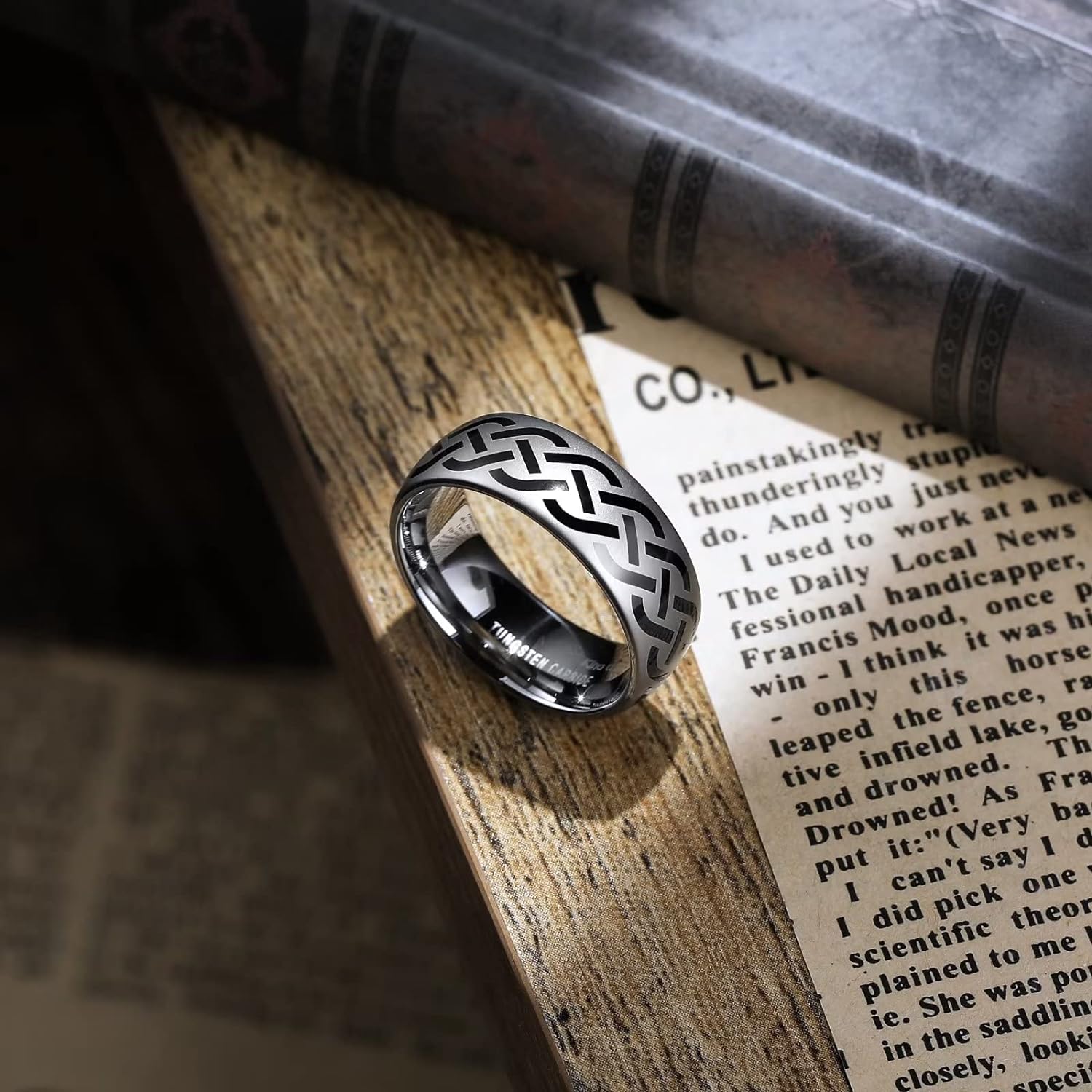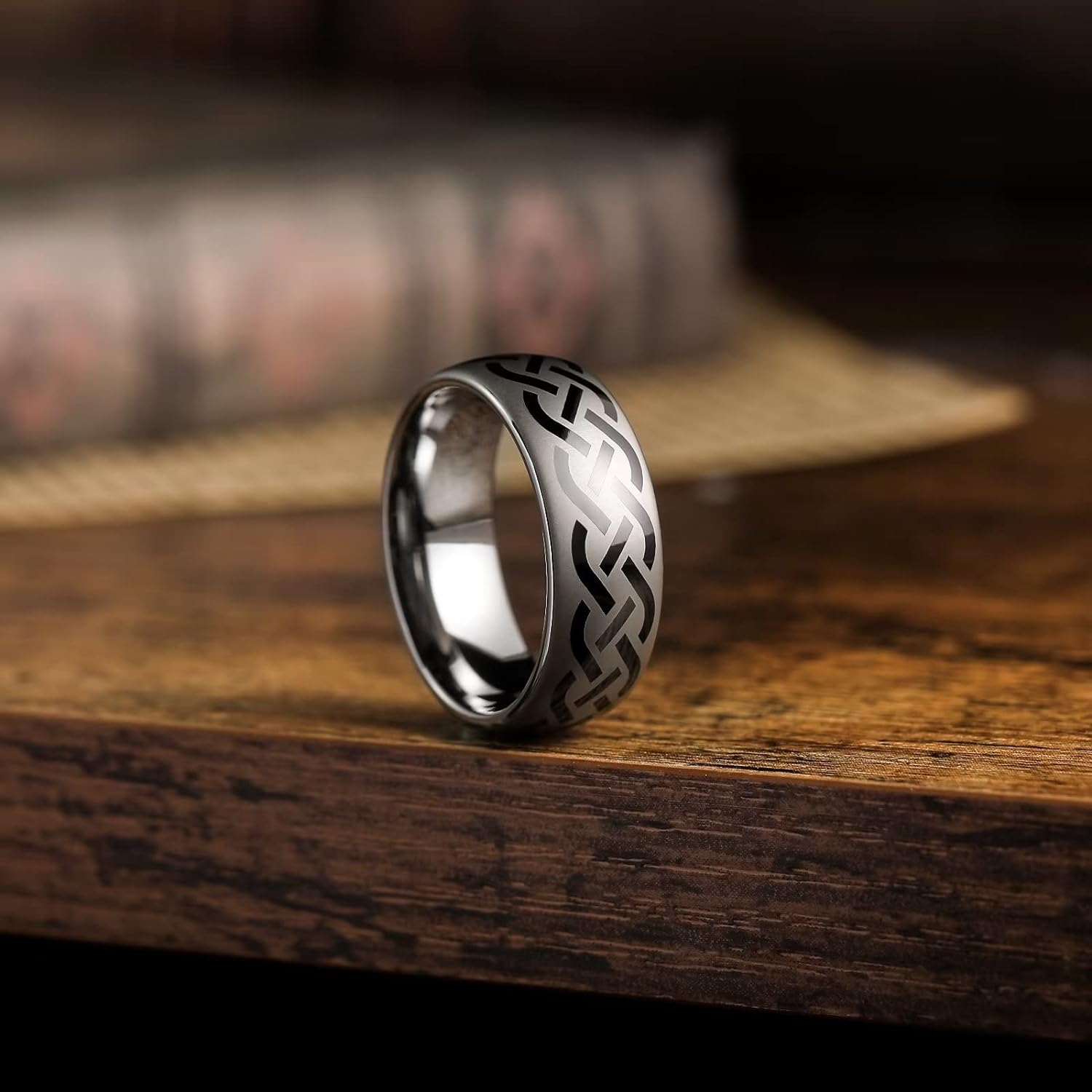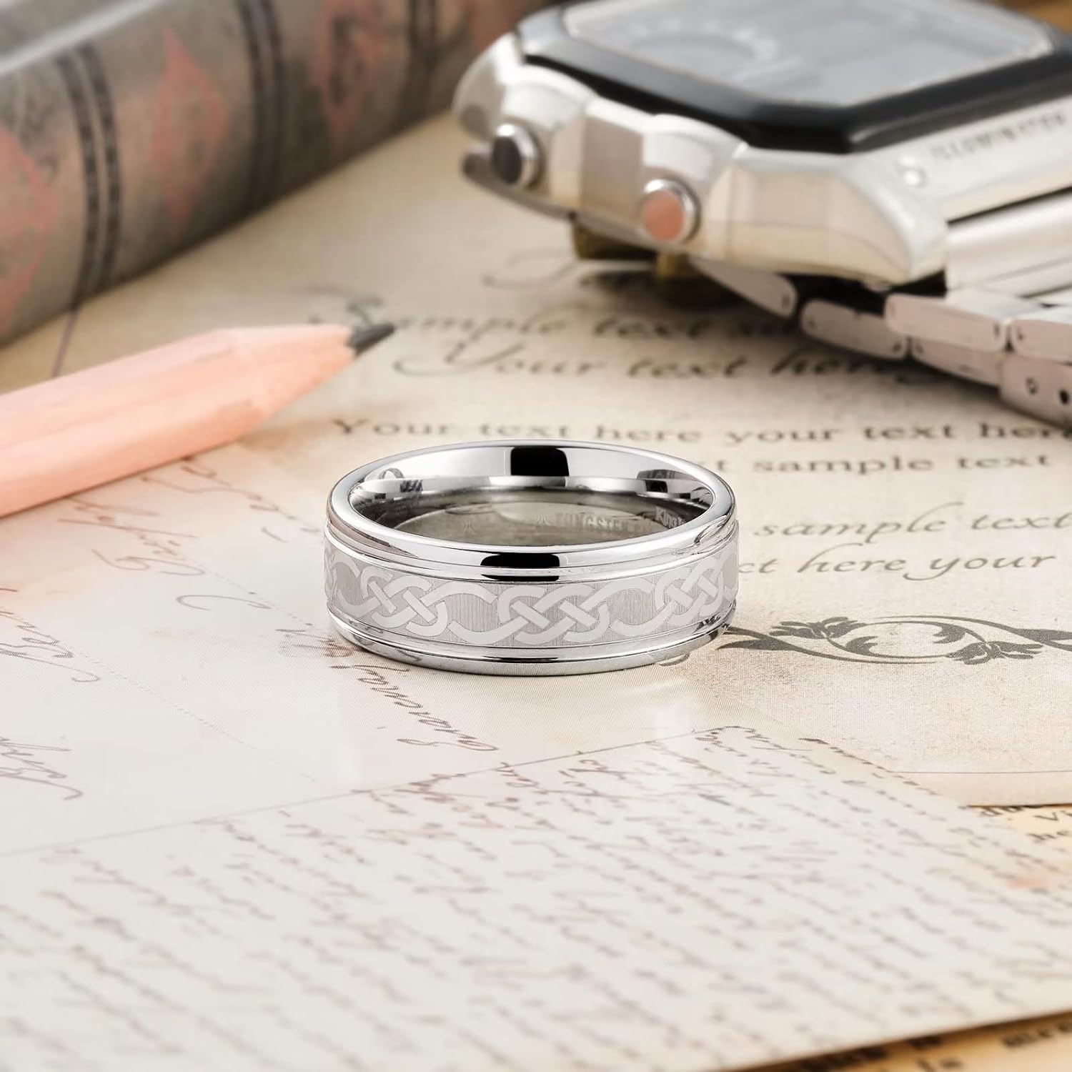 - ✔️SPECIAL DESIGN: Silver 8mm Laser Polished Celtic Knot Center Tungsten Ring, Two Grooves Edge, stands for love that never ends.
