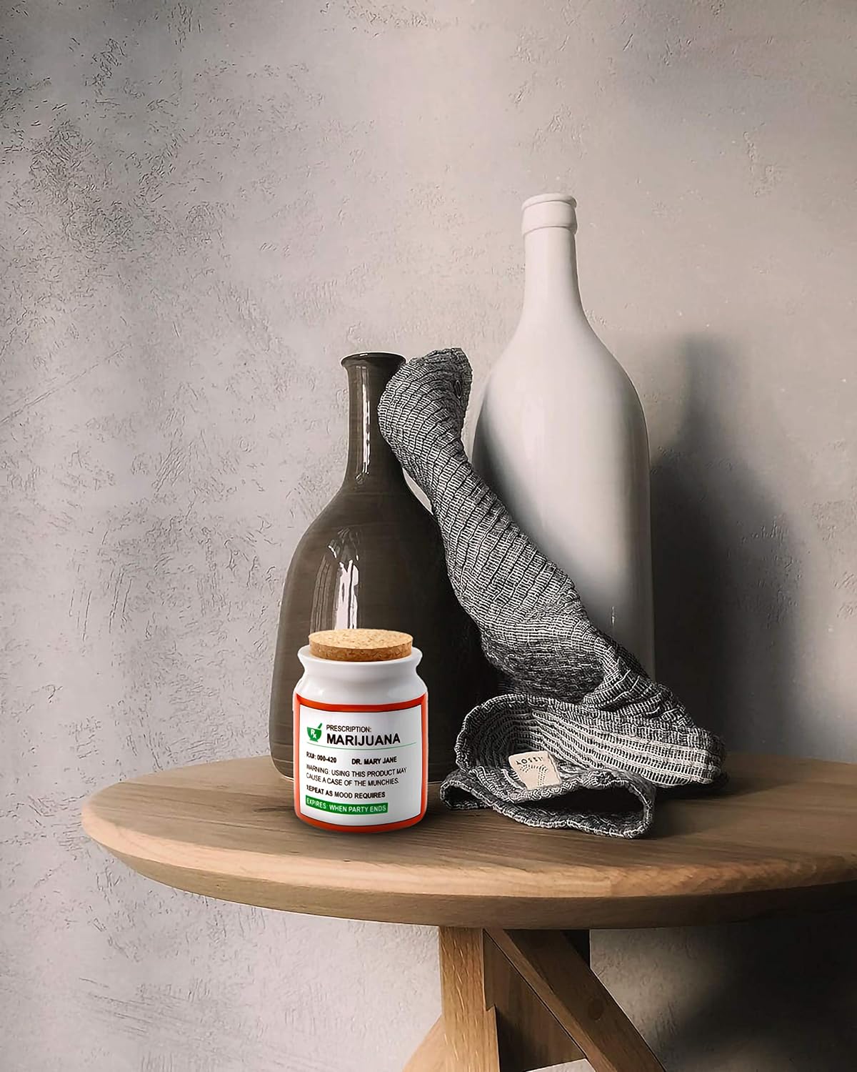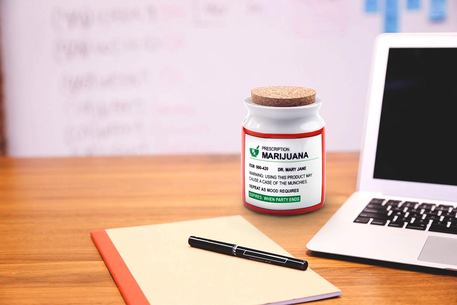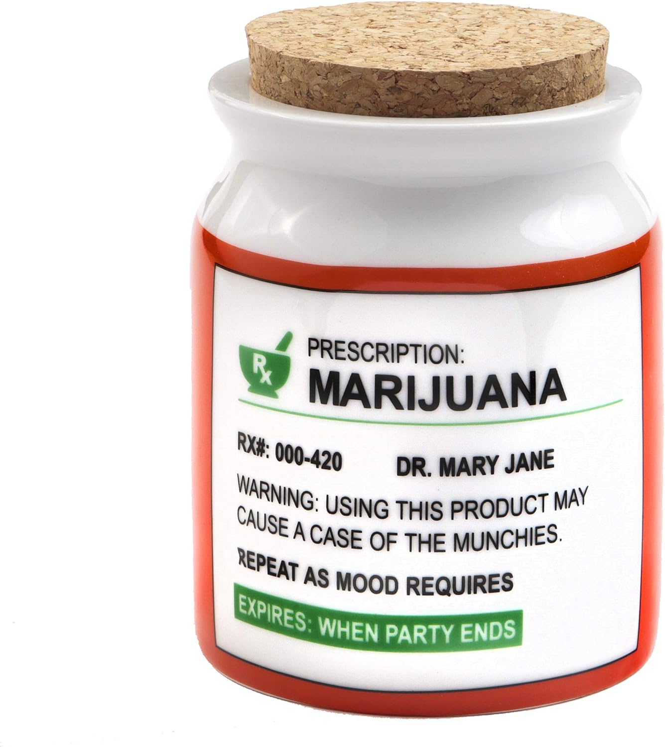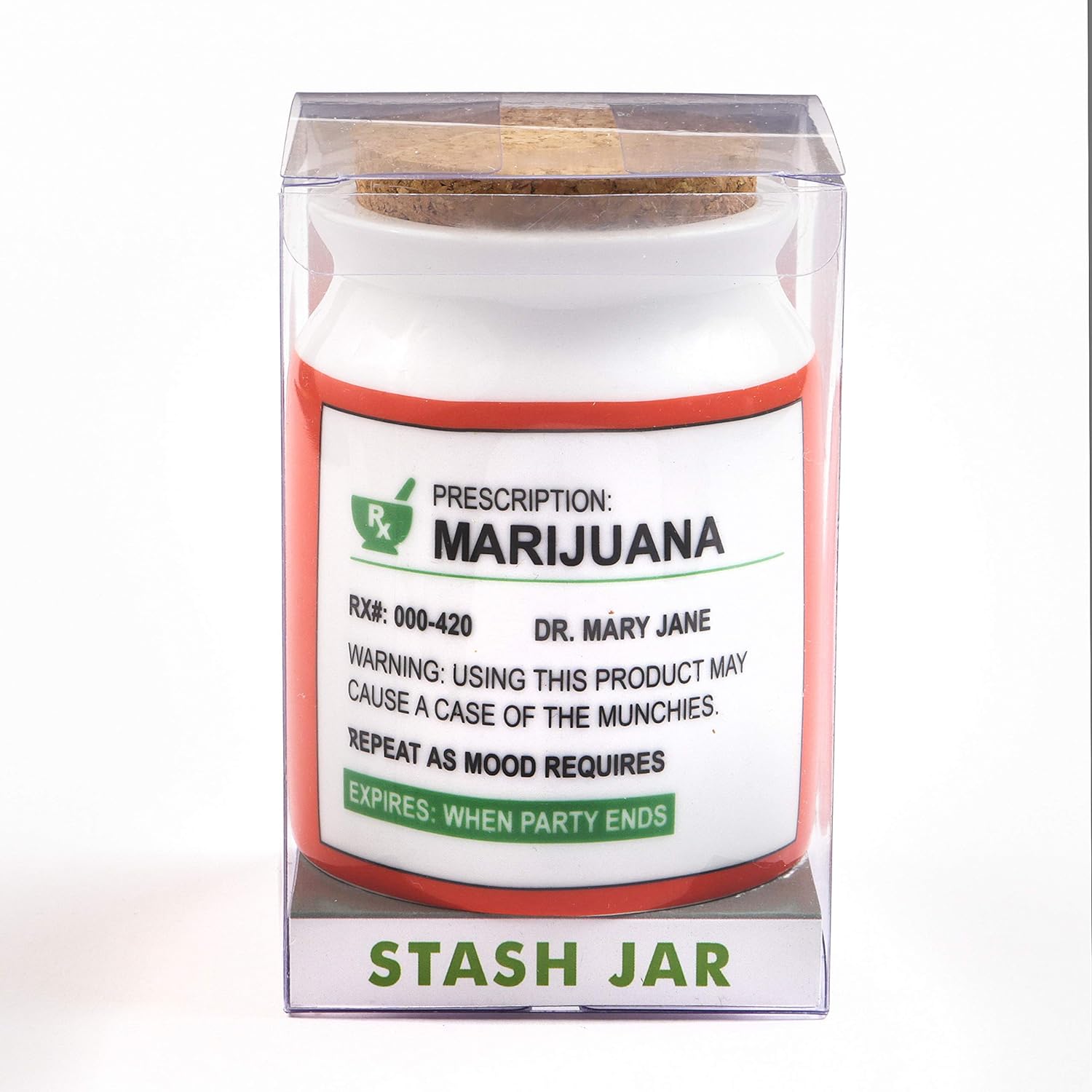 - Hot from our latest finds! This large stash jar is made from ceramic and has a cork top. It features a whimsical phony prescription label on the front in white, orange and green colors.