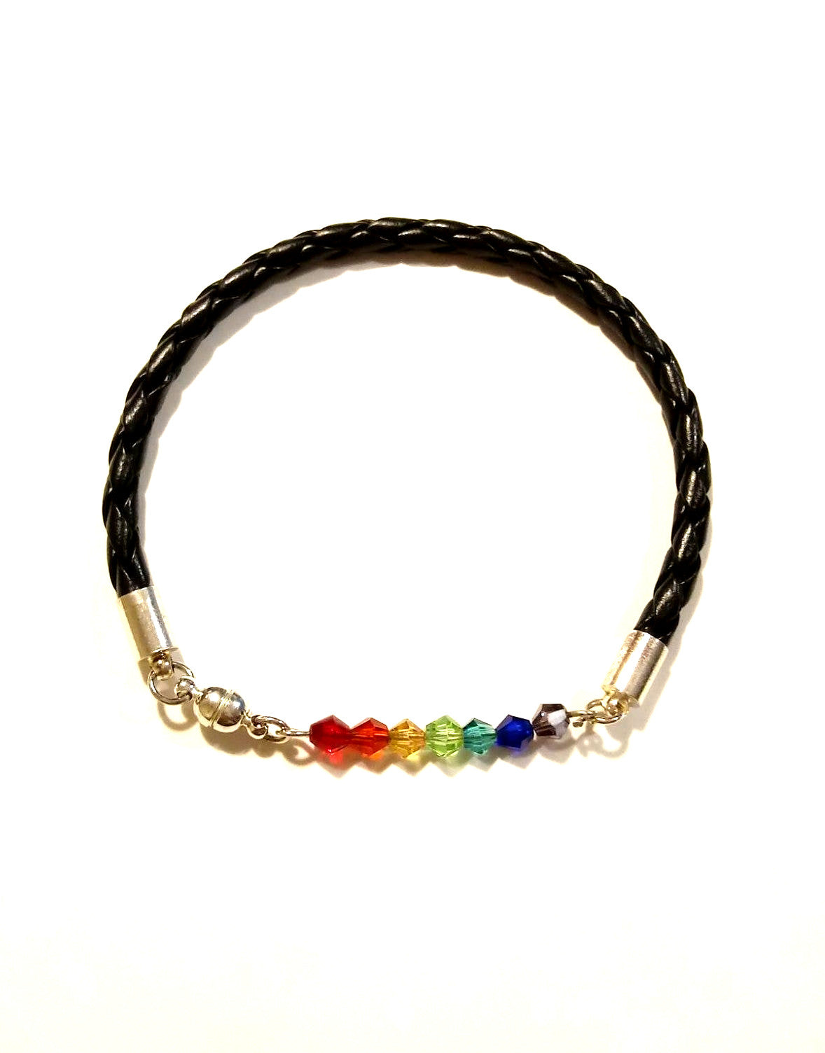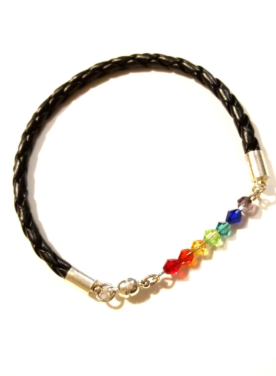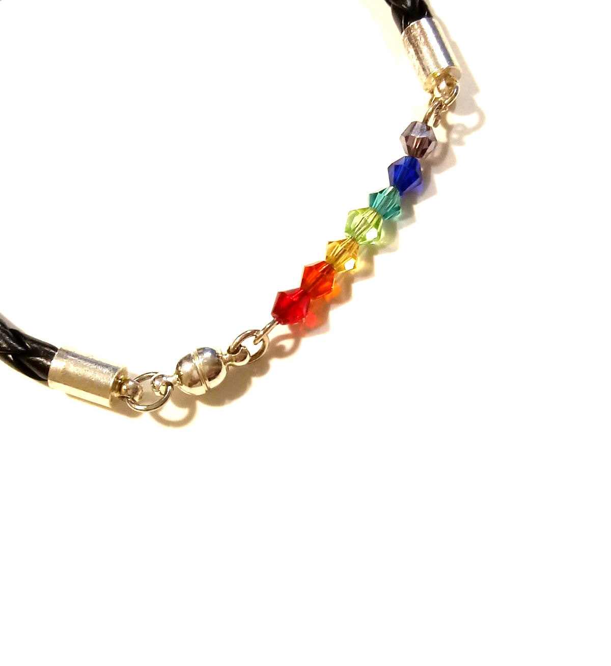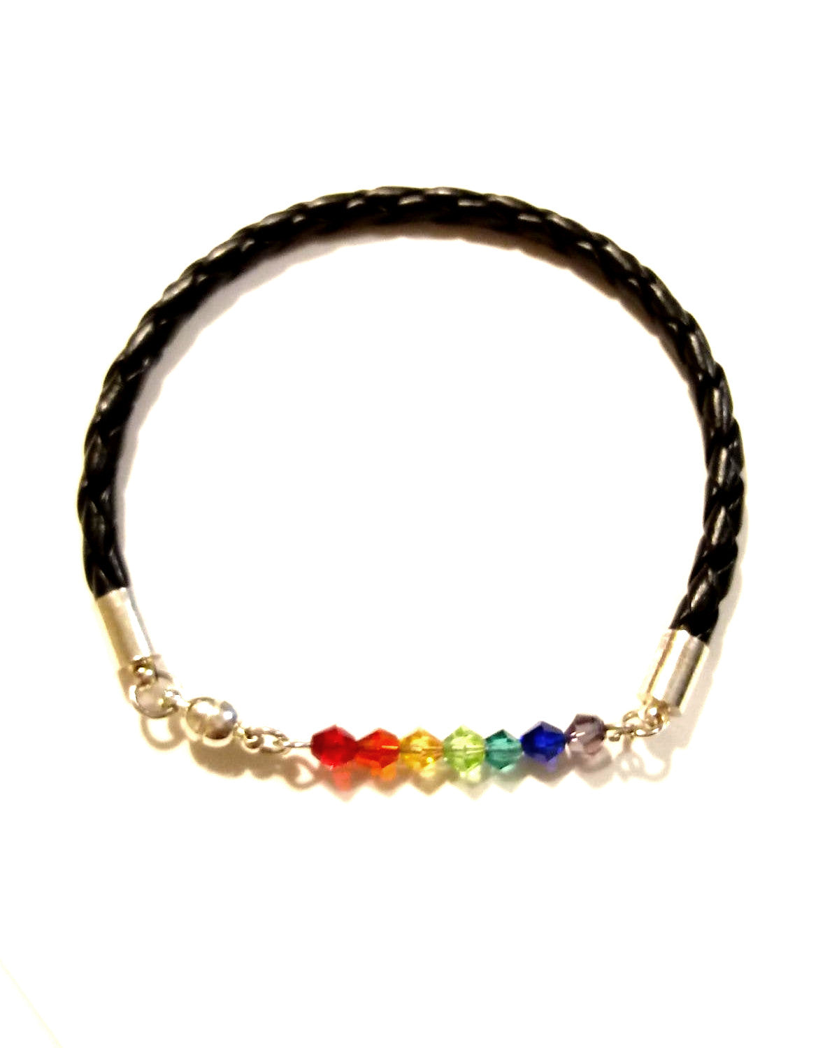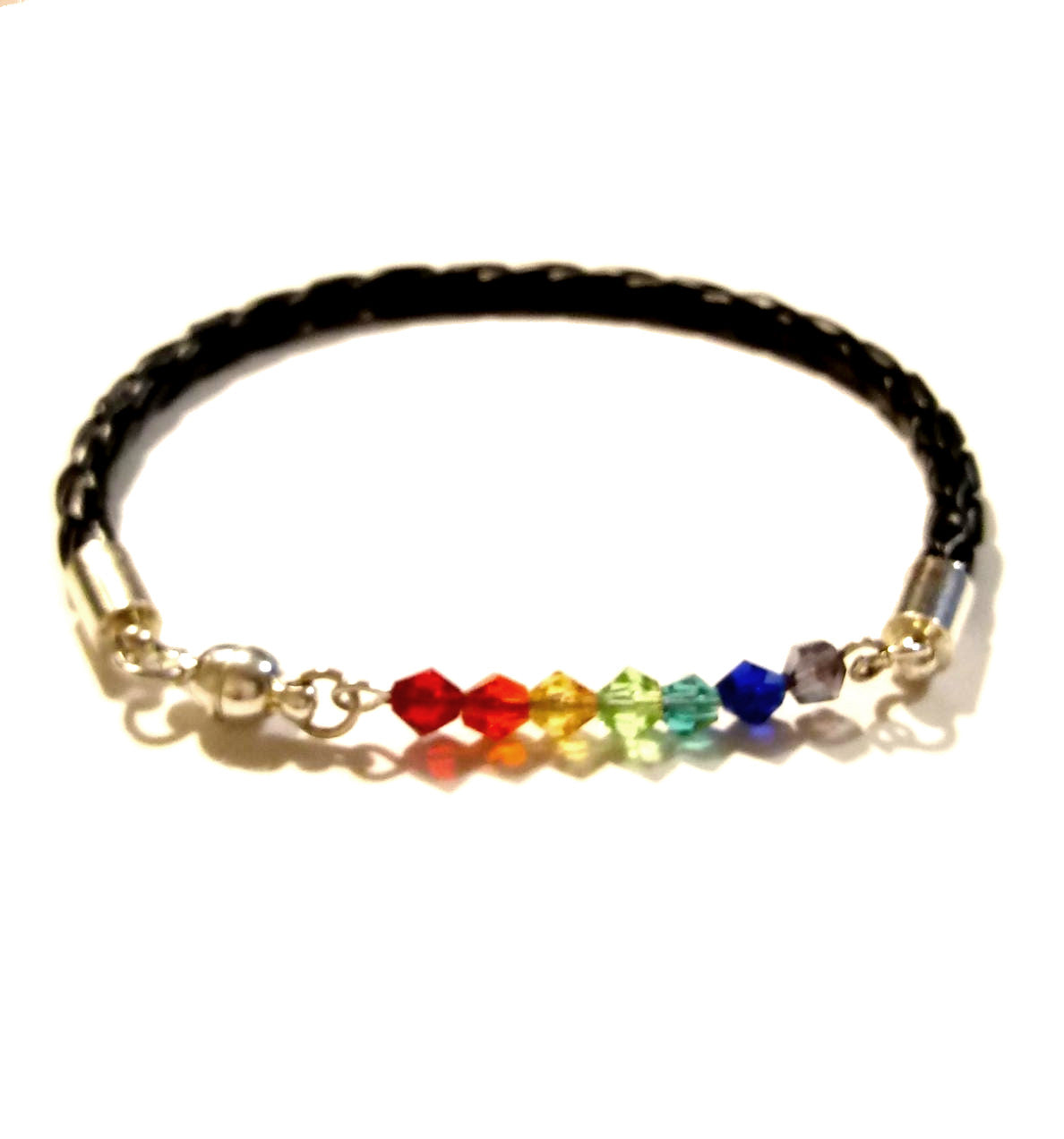 Beautiful hand cut Silver Bracelet with Bicone Swarovski faceted crystal bar in the colors of the LBGTQAI Pride Flag! These are the colors are the colors of the rainbow.
