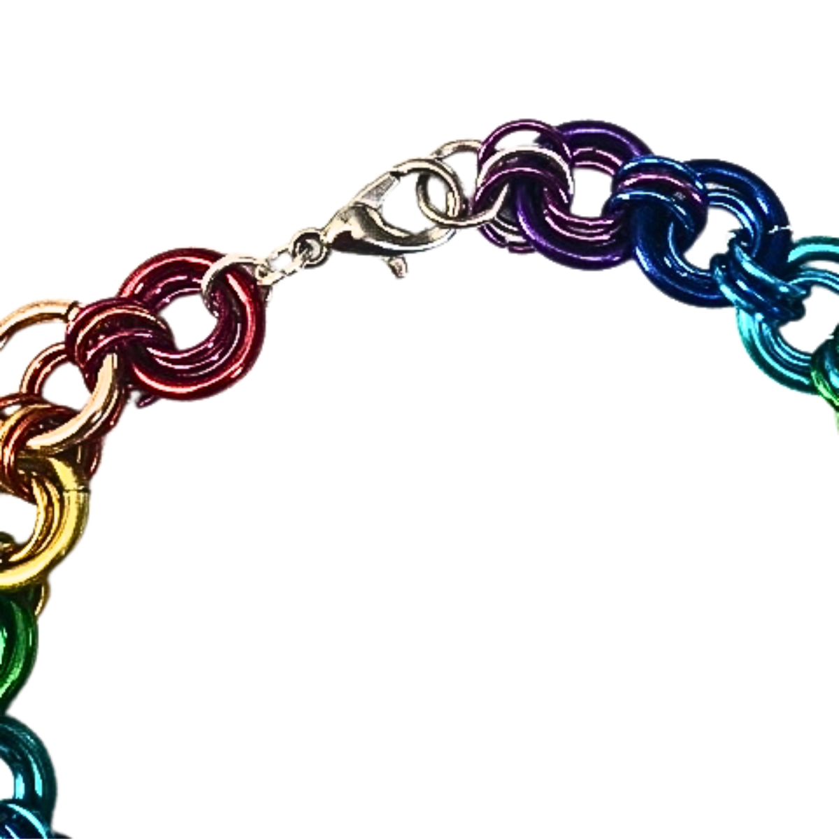 Increase awareness and celebrate your Pride with this bold statement piece from SHOPATLUXE! 8 mm aluminum rings in the colors of the rainbow are interconnected with sterling silver rings to create a rainbow of pride around your wrist.