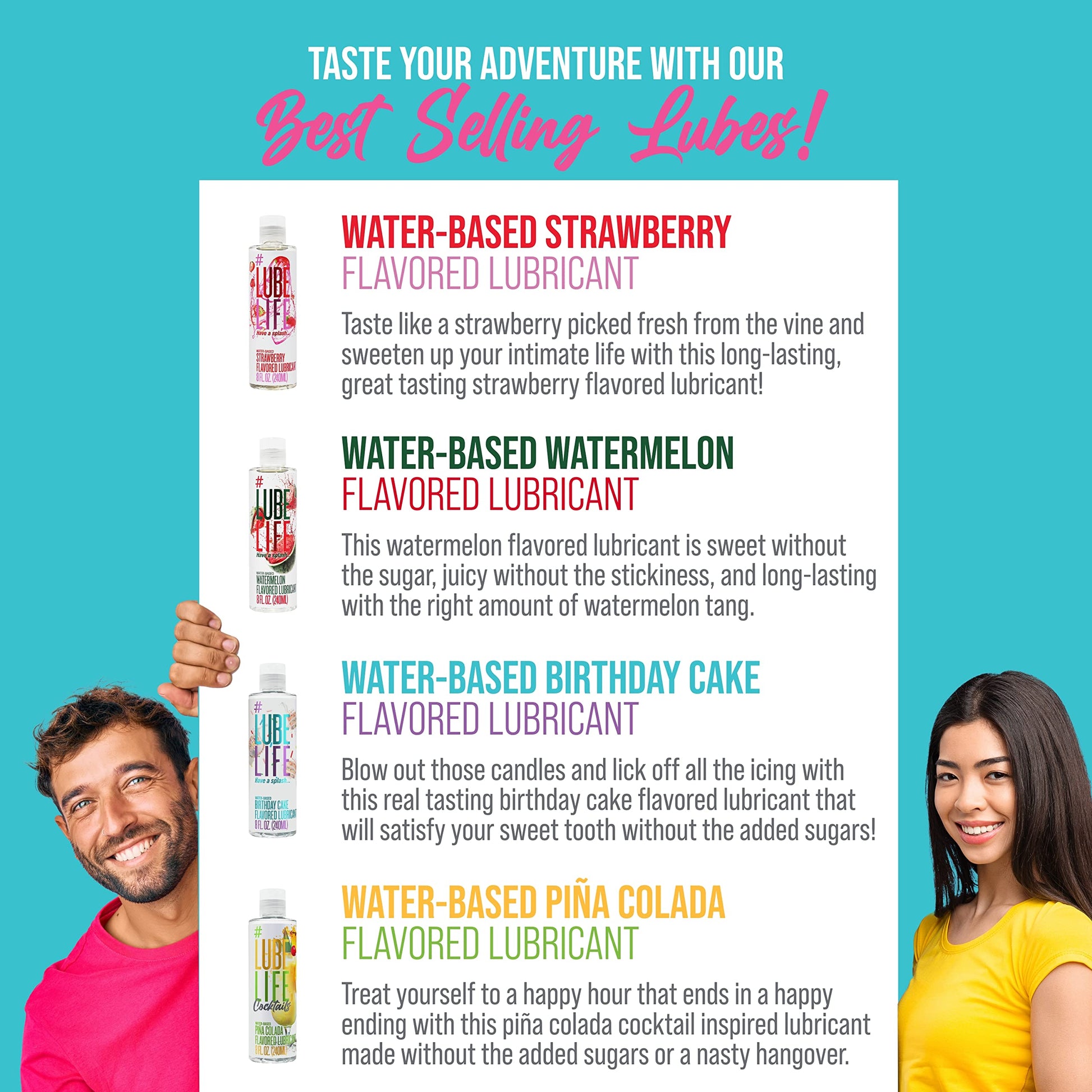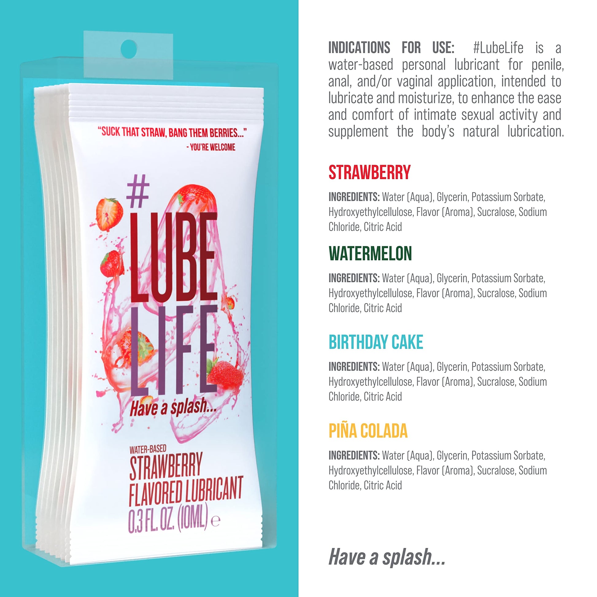 - SWEET AND SUCCULENT STRAWBERRY: A taste you won’t forget, this desirable and lickable #LubeLife Water-Based Strawberry Flavored Lubricant is a fit for any occasion. Tasting like a strawberry picked fresh from the vine, this lubricant is packed full of intense flavor. Add a little fruit to your diet and sweeten up your life!