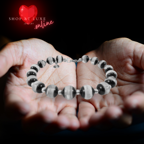 Newly handcrafted from ShopAtLuxe, this limited edition mens bracelet is constructed of genuine translucent black and white marble beads, suspended from an 8.5 hand cut steel snake chain. Loose casual fit. Lobster claw closure. Hypoallergenic; lead and nickel free. Complimentary gift with purchase!