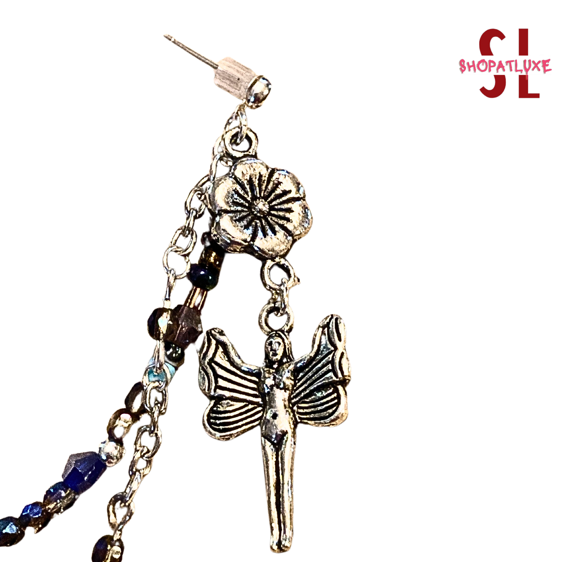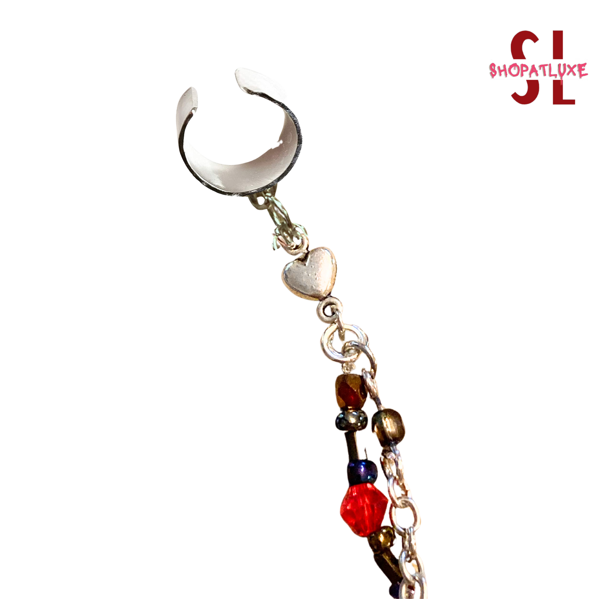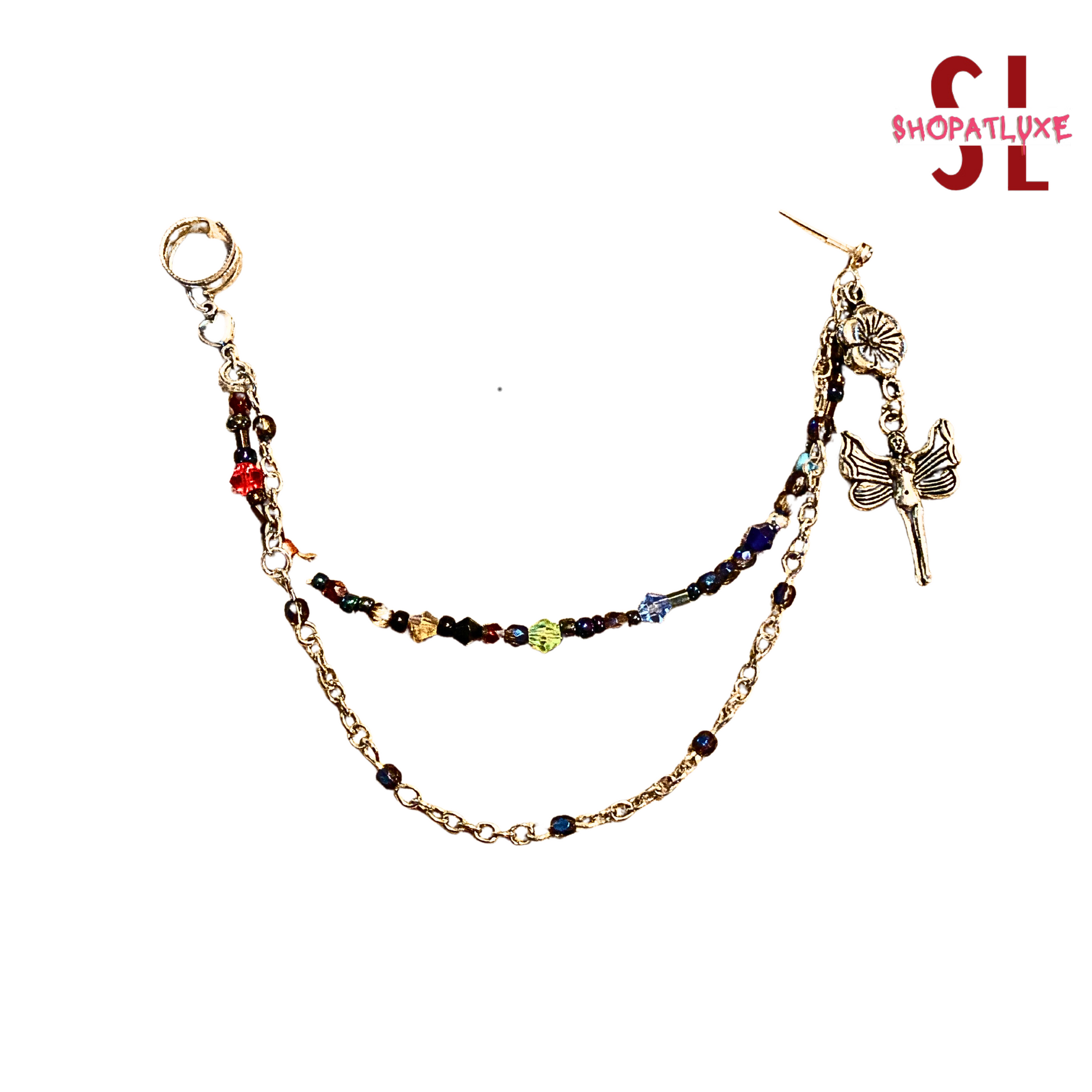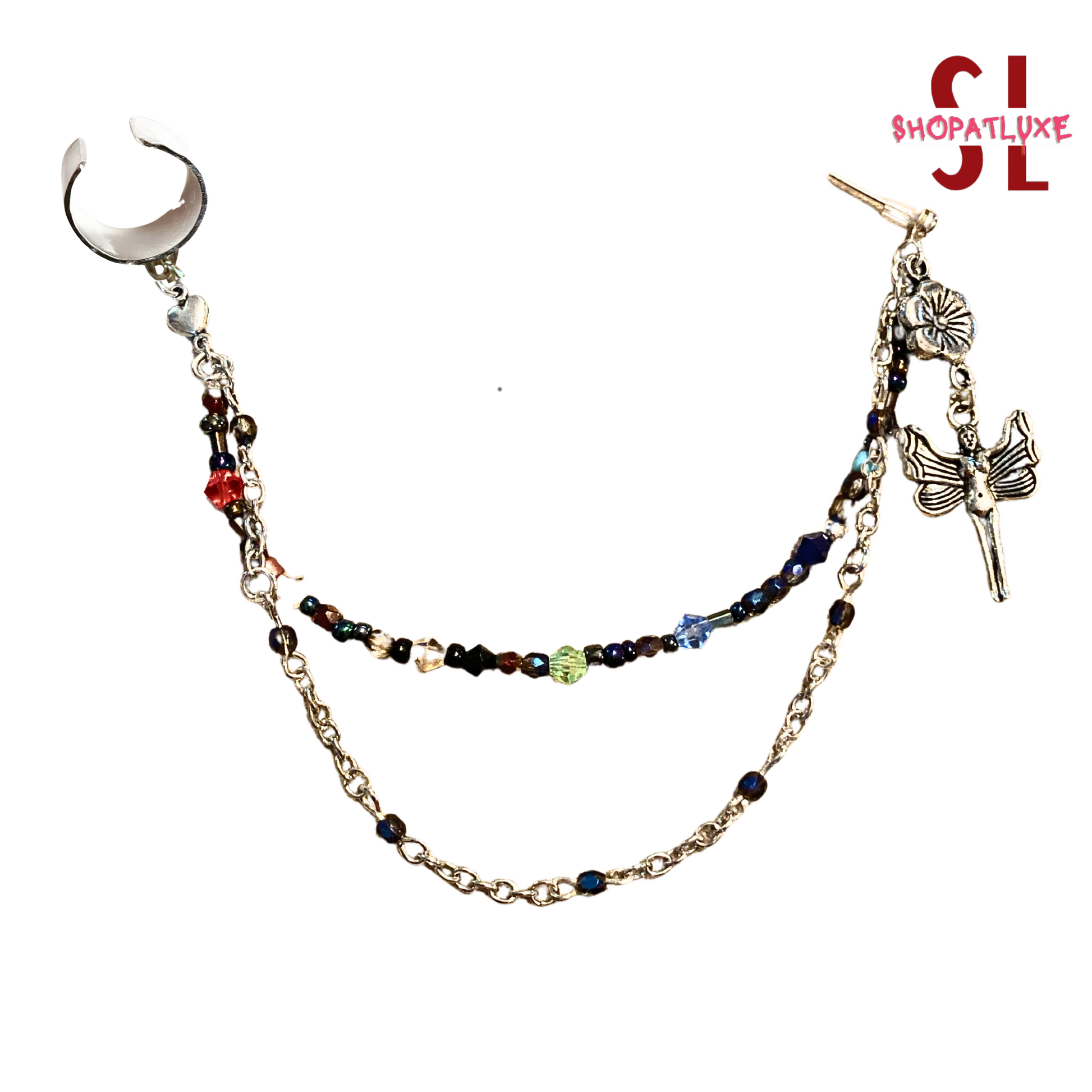 Limited edition. An original piece, constructed with sterling silver findings and handcrafted chains with tiny faceted crystals and Hematite gem rounds, along with a rainbow of stones! Triple handcrafted chains. Finished with a Fairy charm, a half moon ball post, and a solid high shine silver ear cuff.