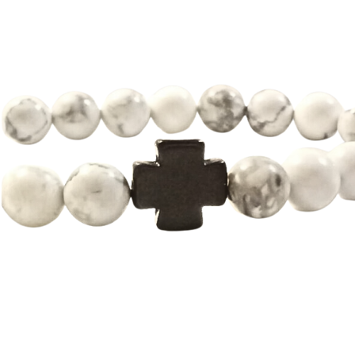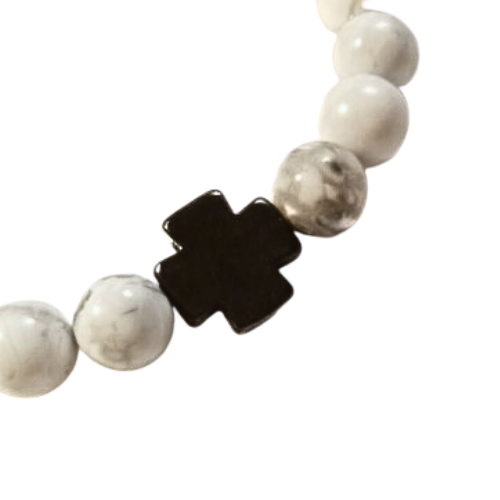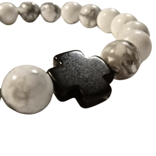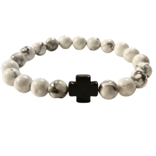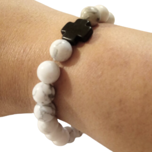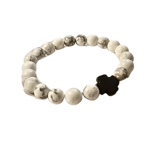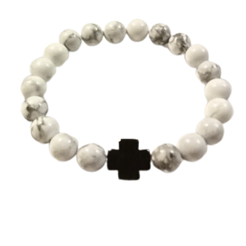 Newly handcrafted from ShopAtLuxe, this eye catching, limited edition bracelet is constructed of semi precious White Turquoise Howlite rounds, suspended from an 8 inch stretch clear cord. Centering the Onyx rounds is a Celtic cross in Black Onyx stone. Casual fit. For any gender. Limited edition piece. Hypoallergenic; lead and nickel free. Complimentary gift with purchase!