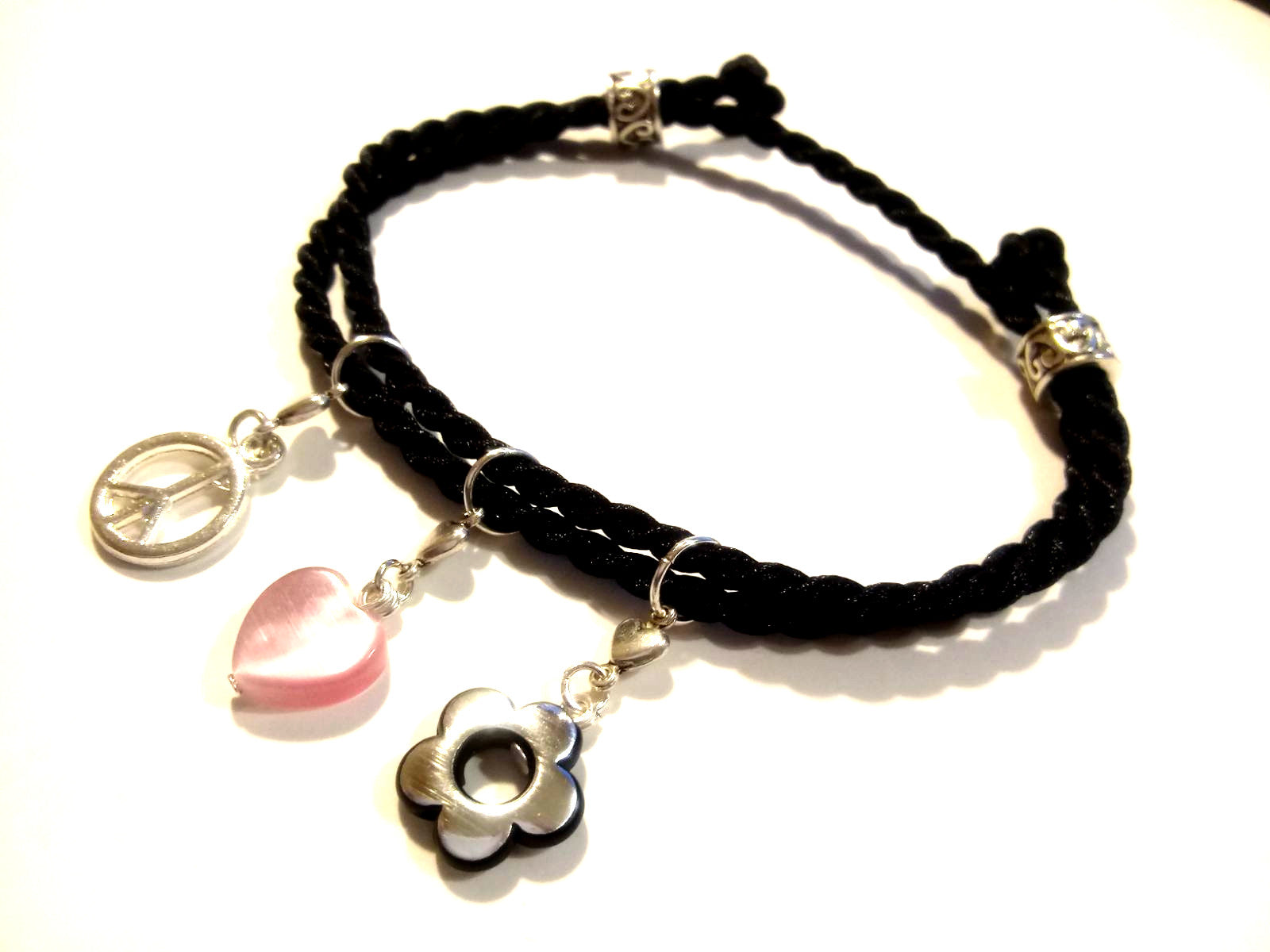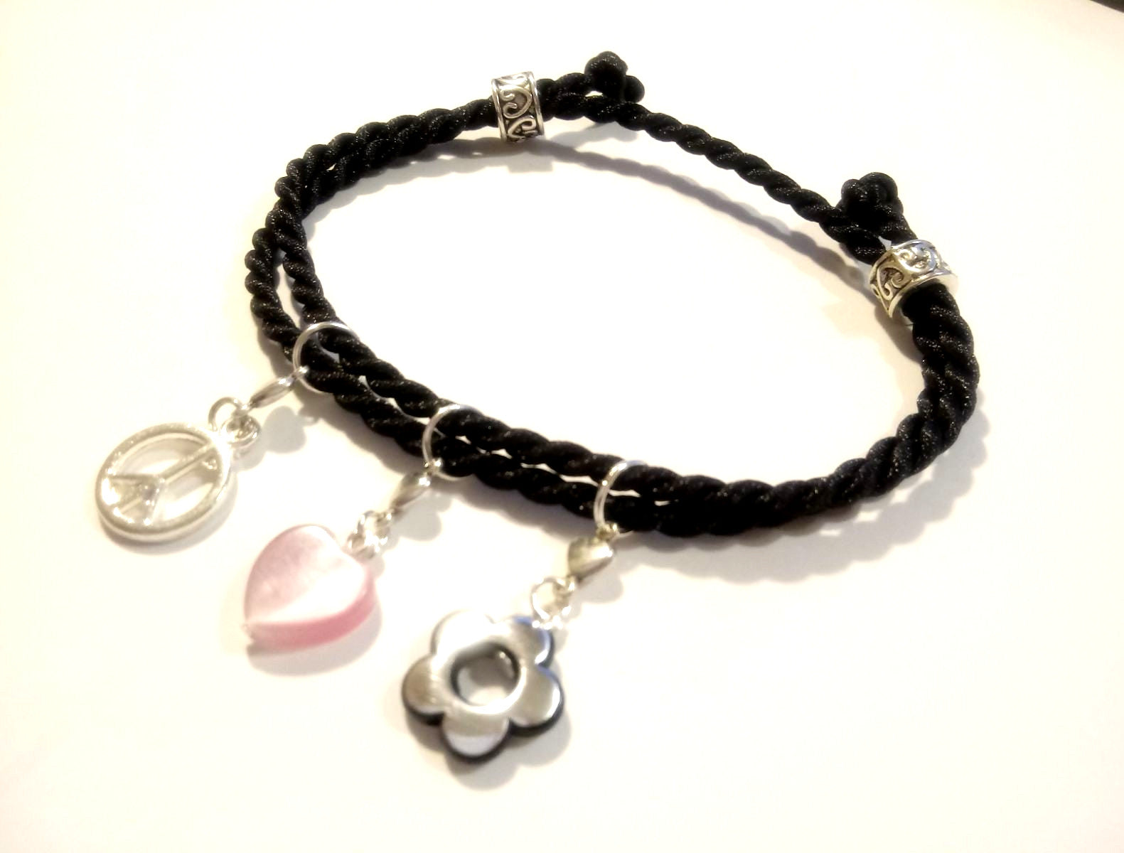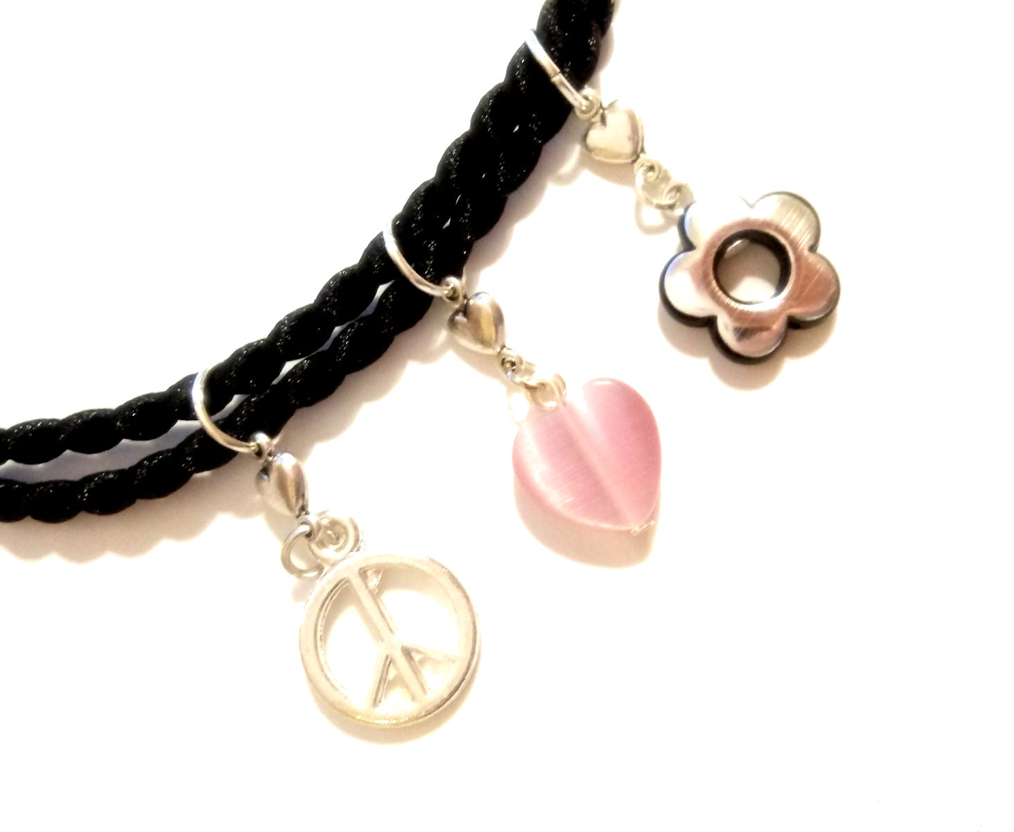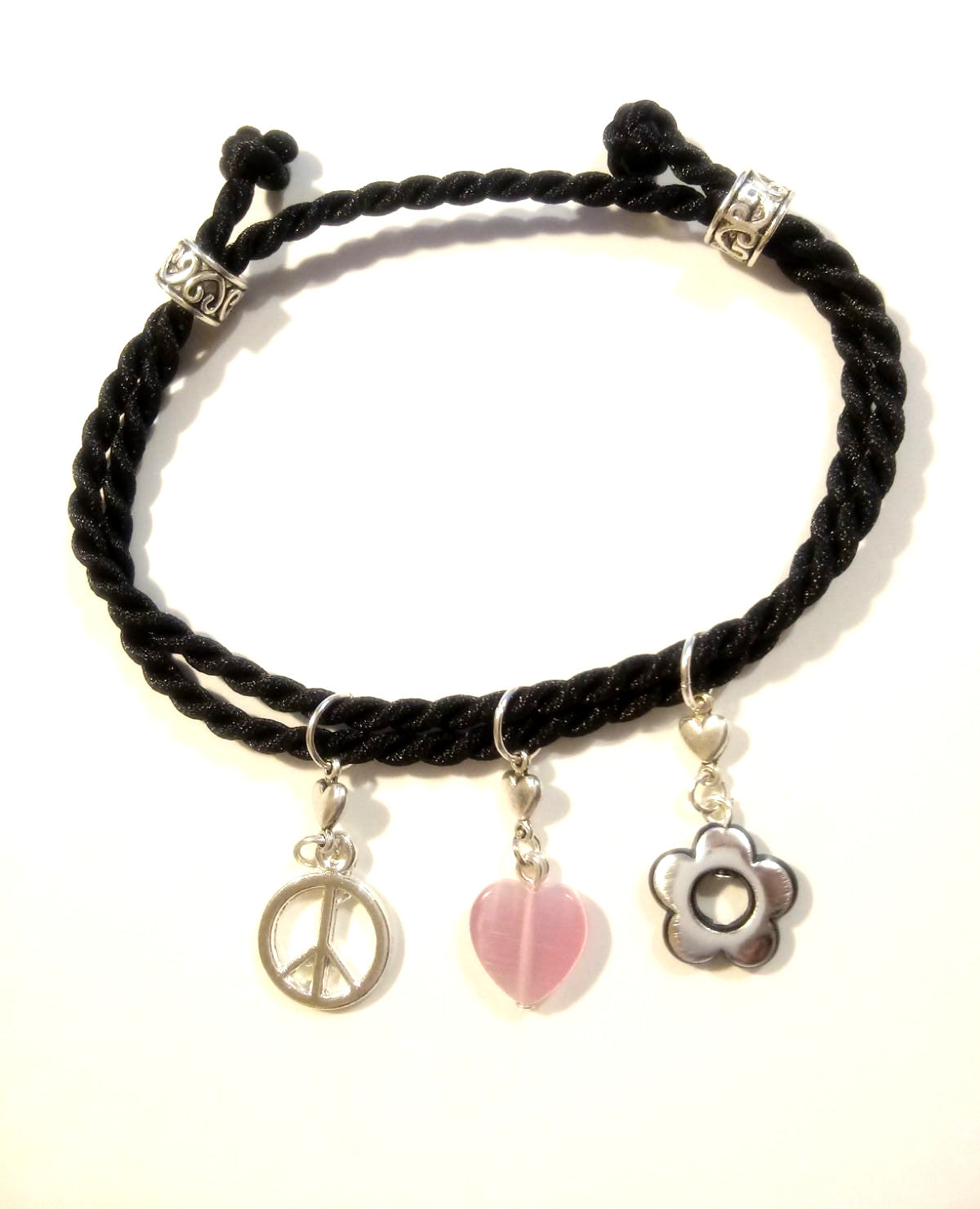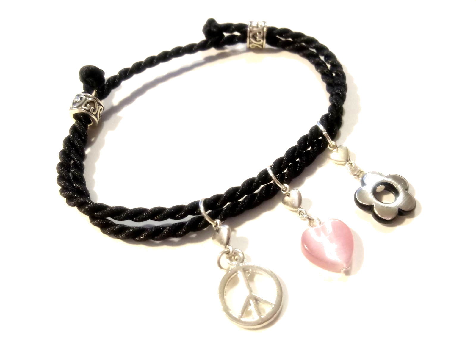 Newly released from the ShopAtLuxe Global Tour Collection, this Americana Peace Love and Nature Boho Wrap Bracelet is perfect for wearing any time of year. Leather lovers Bracelet with Bicone Swarovski faceted crystal bar in the colors of the rainbow flag. Three petite charms are suspended from tiny silver hearts, while securely attached to an adjustable double wrap nylon black bracelet. Embellished with silver rounds to keep your bracelet from unraveling. Bracelet expands and tightens, and will fit 4 to 9 inch wrists. No closure needed. An original design from the chief designer of ShopAtLuxe. Remember, with each purchase from ShopAtLuxe you will receive a complimentary gift!