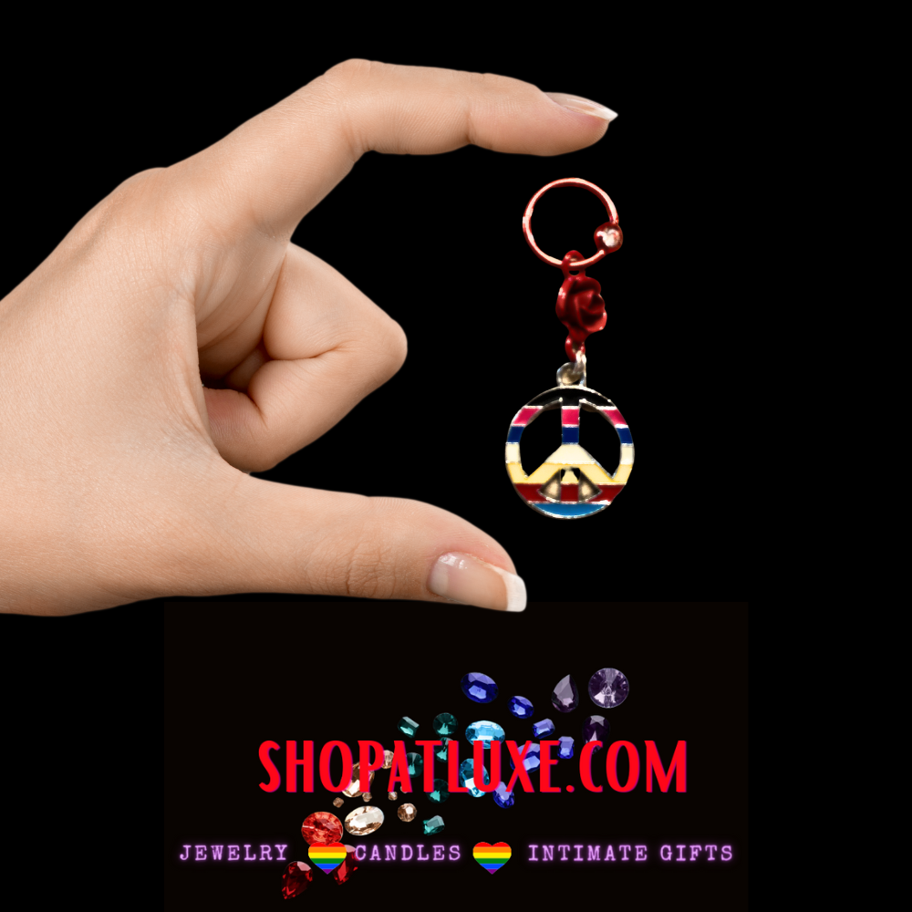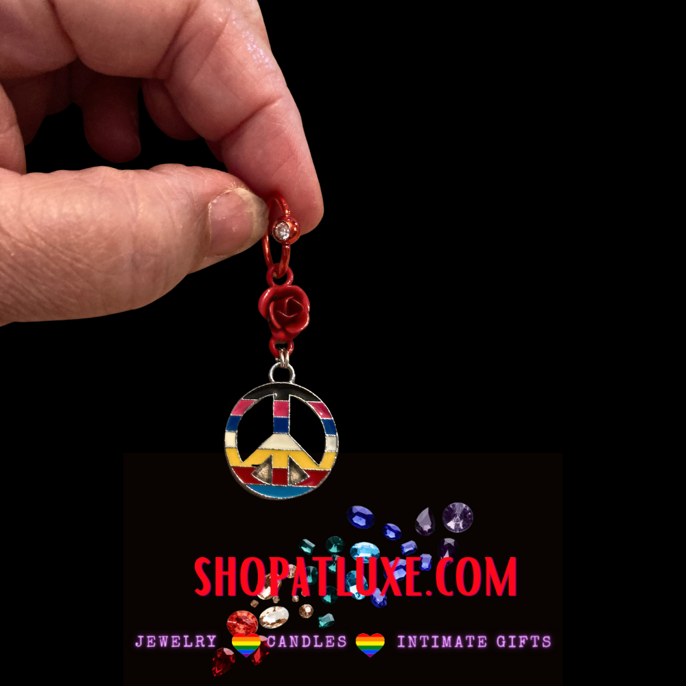 Red SURGICAL STEEL CAPTIVE CRYSTAL BEAD RING WITH A ROSE AND MULTICOLORED PEACE SIGN DANGLE.