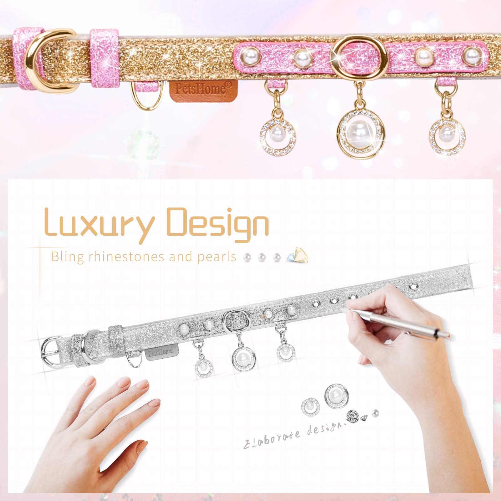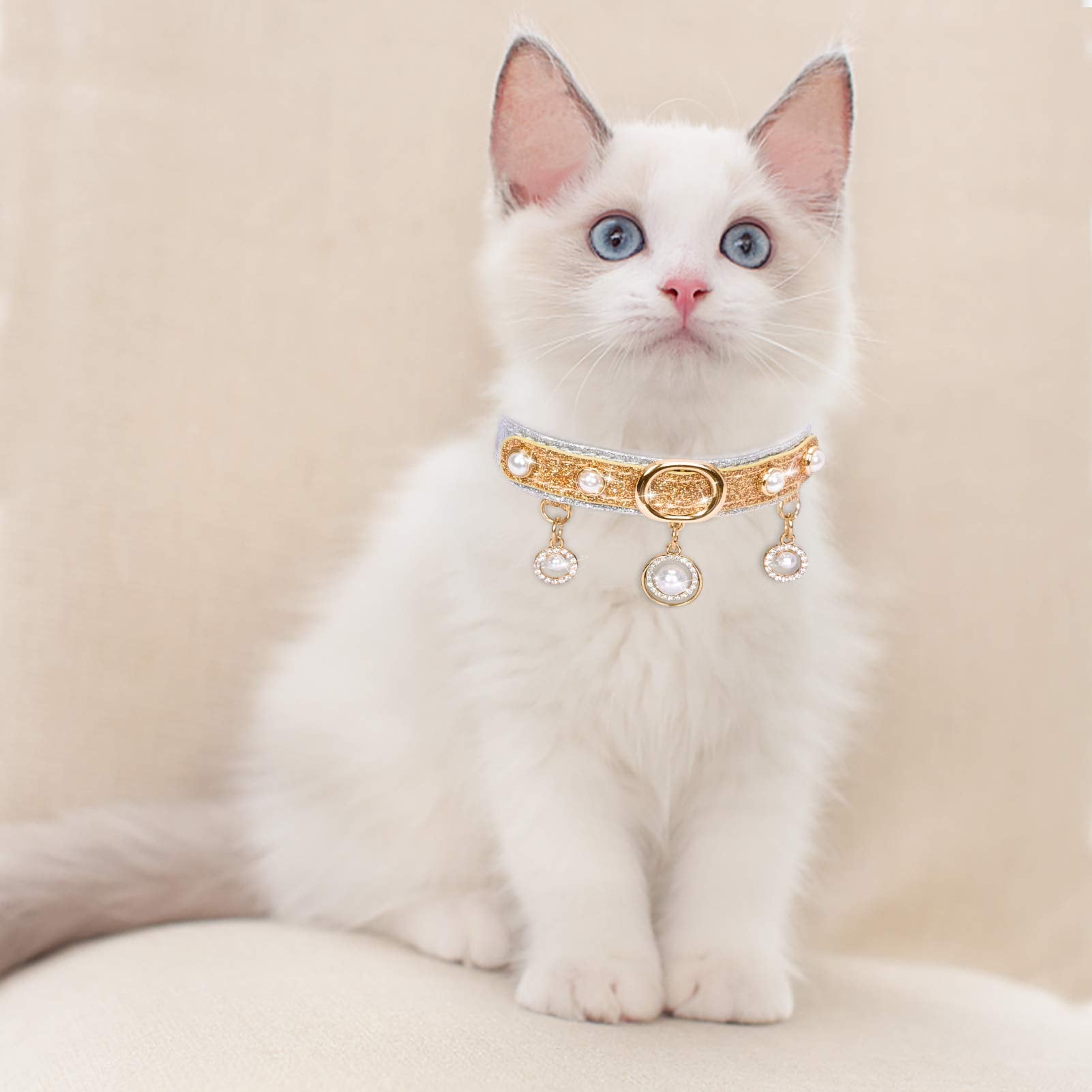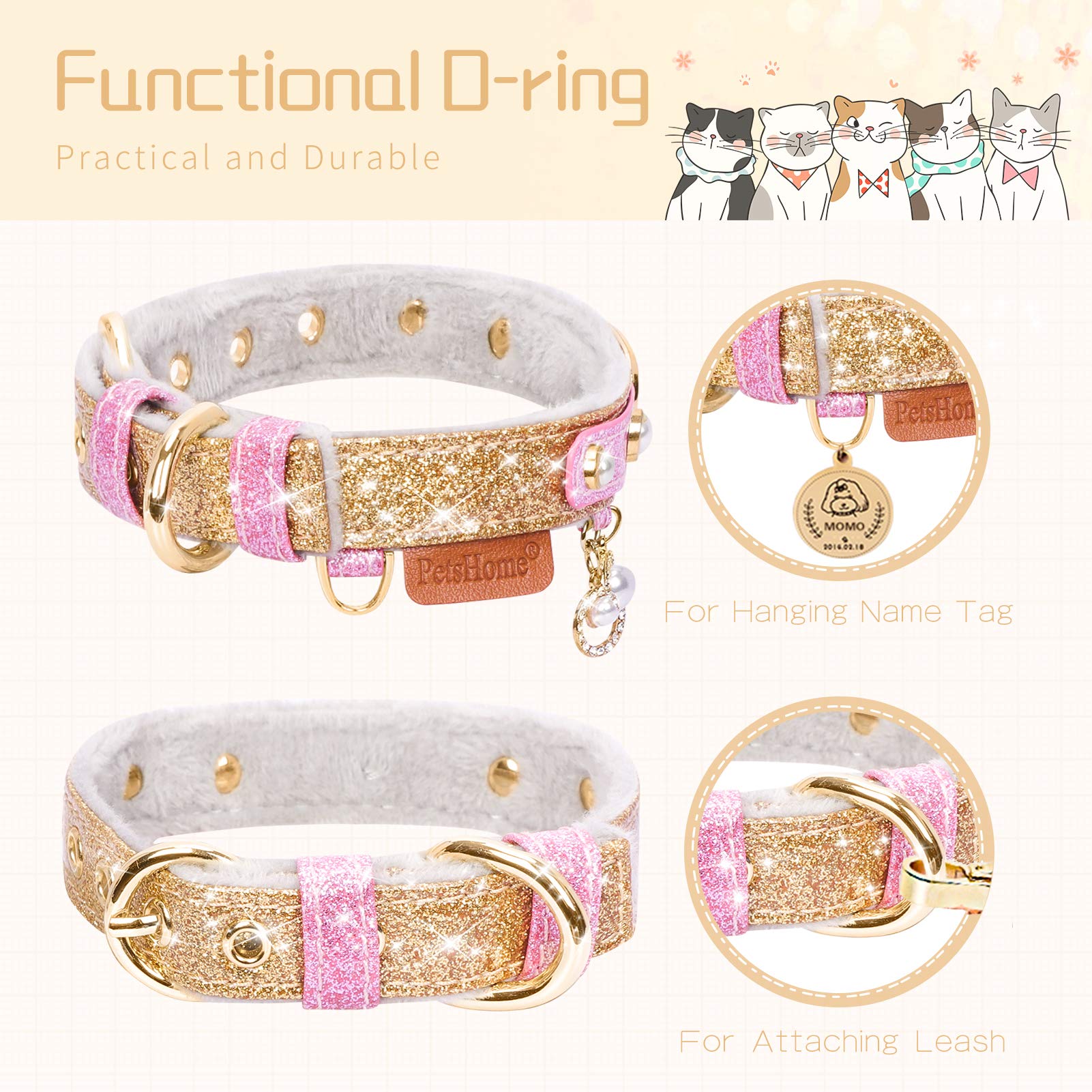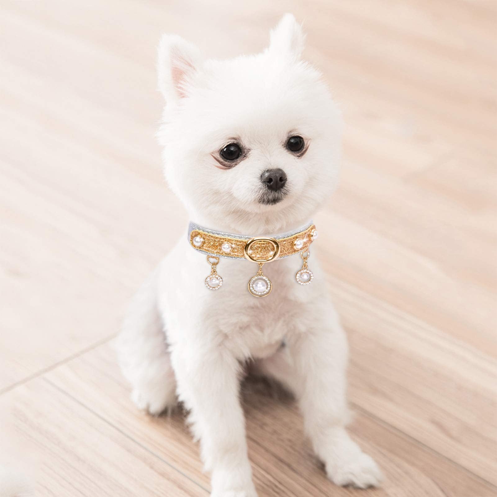 PetsHome Cat Collar, Dog Collar, Bling PU Leather Adjustable Pet Collar with Cute Pearls and Luxury Pendant for Cat and Small Dog Small Gold
