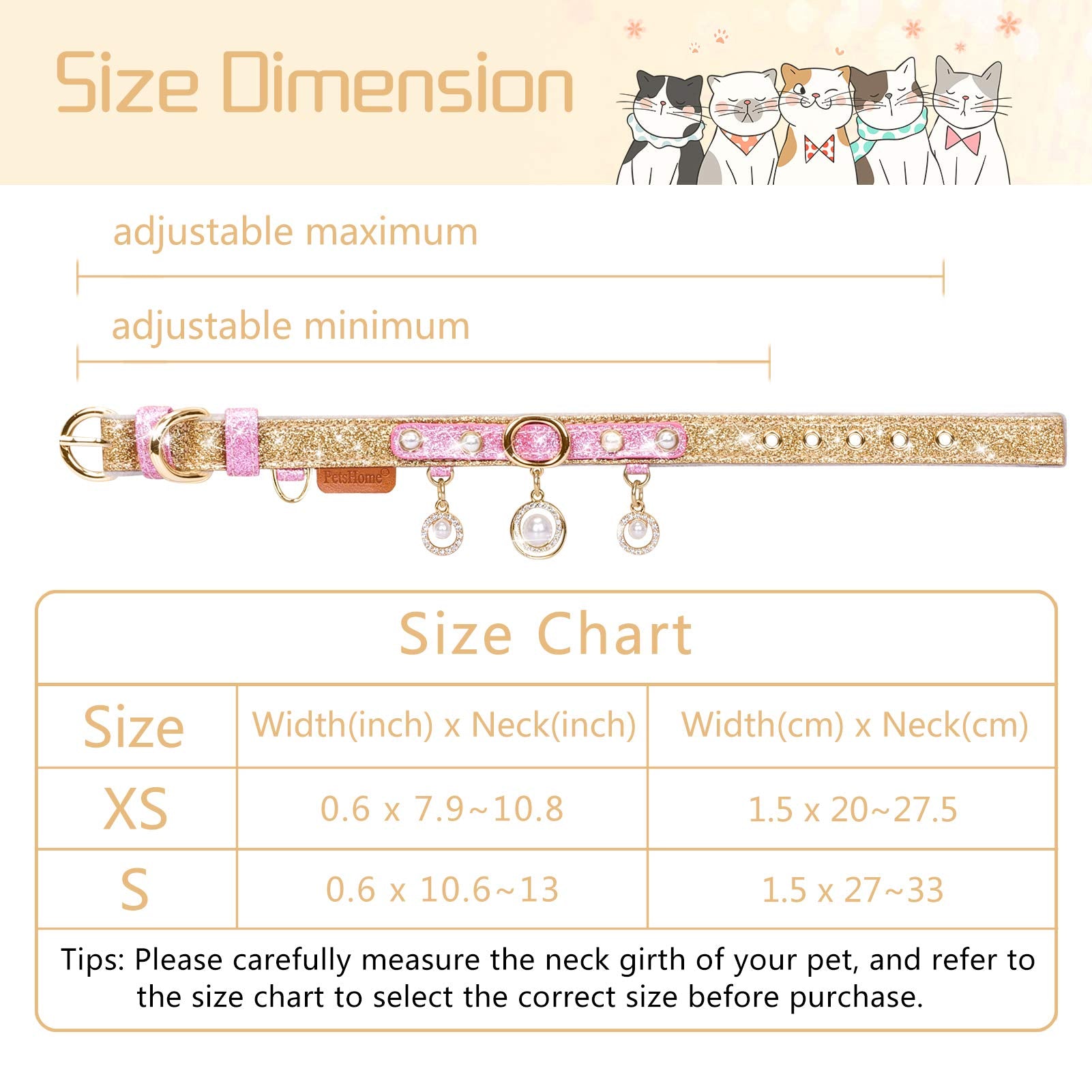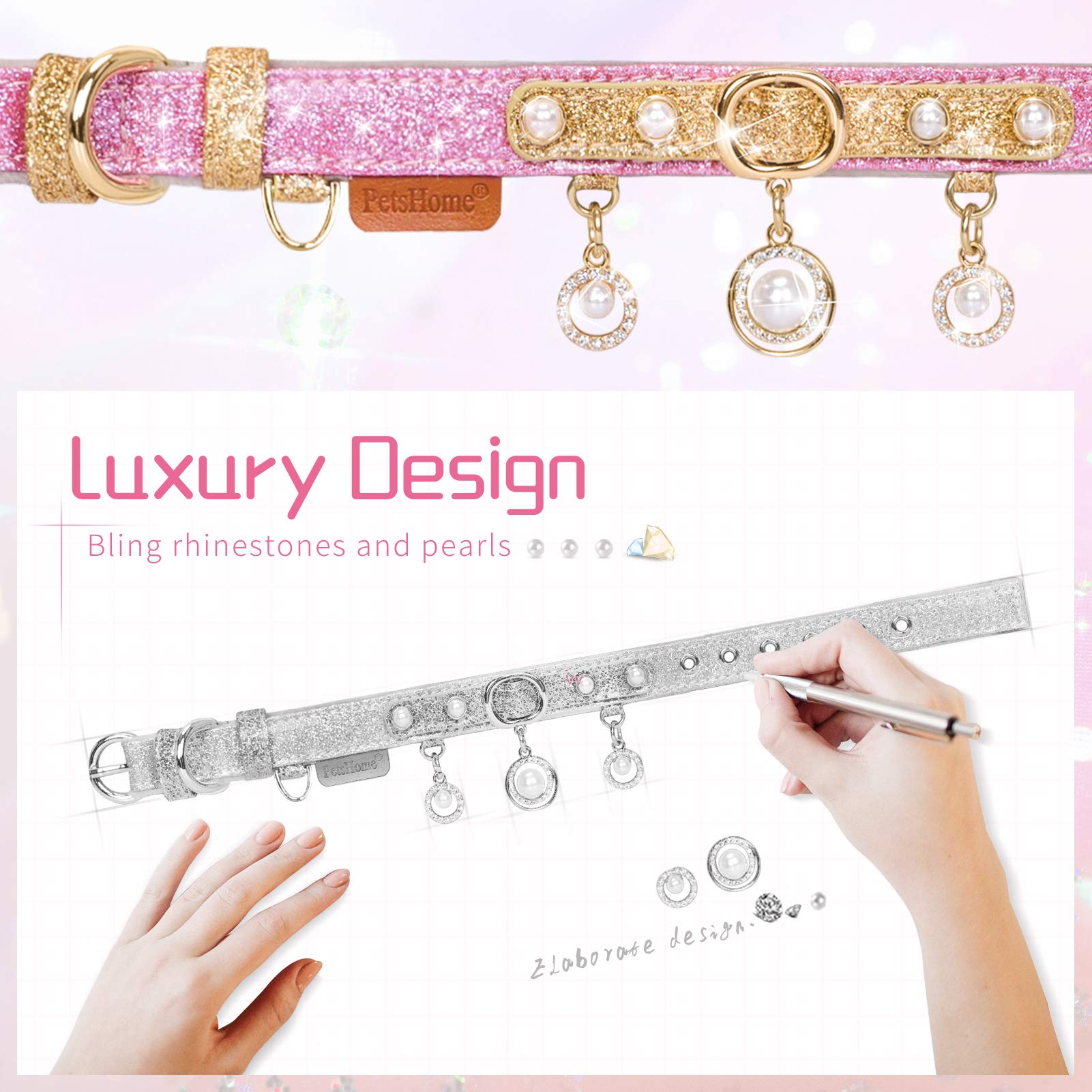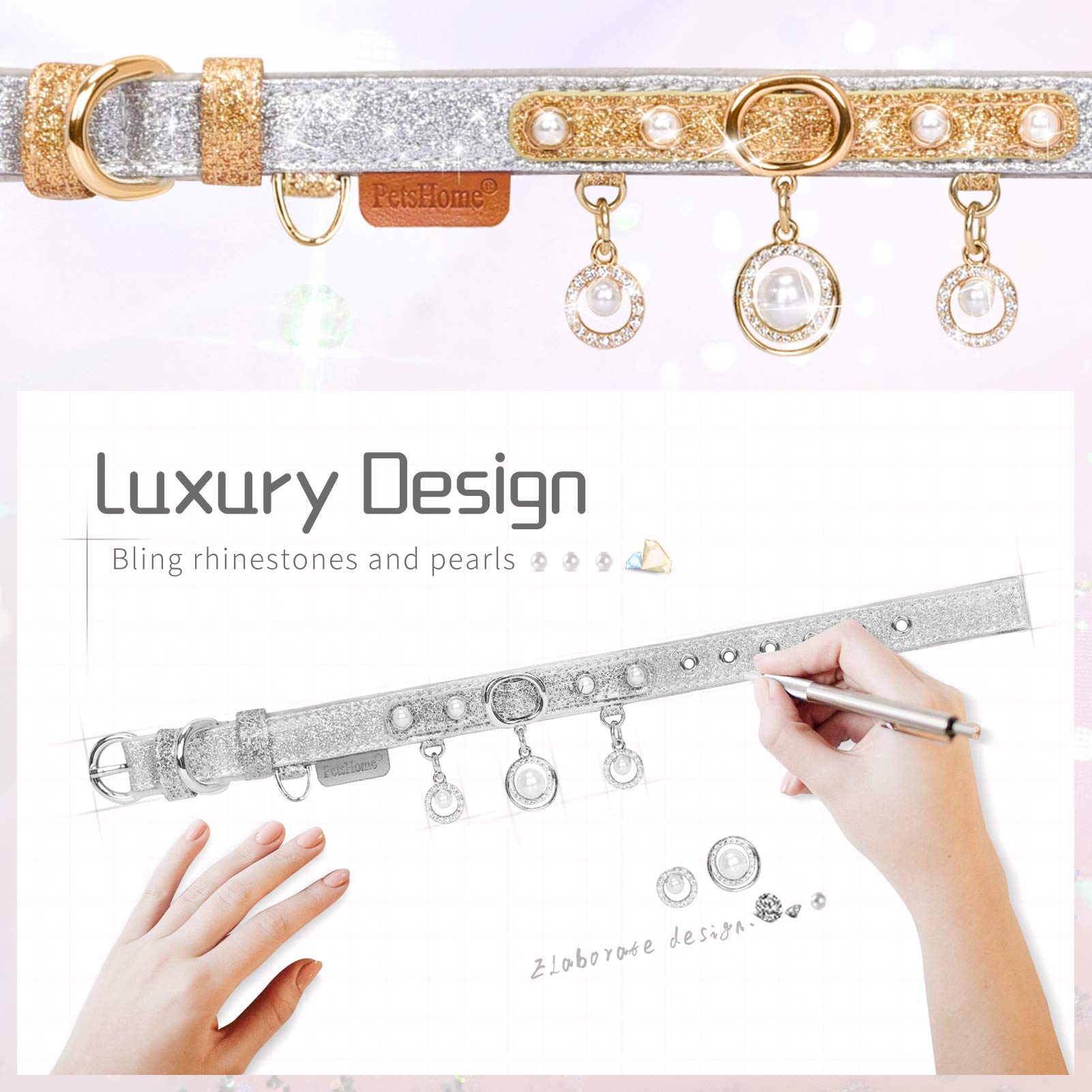 PetsHome Cat Collar, Dog Collar, Bling PU Leather Adjustable Pet Collar with Cute Pearls and Luxury Pendant for Cat and Small Dog Small Gold