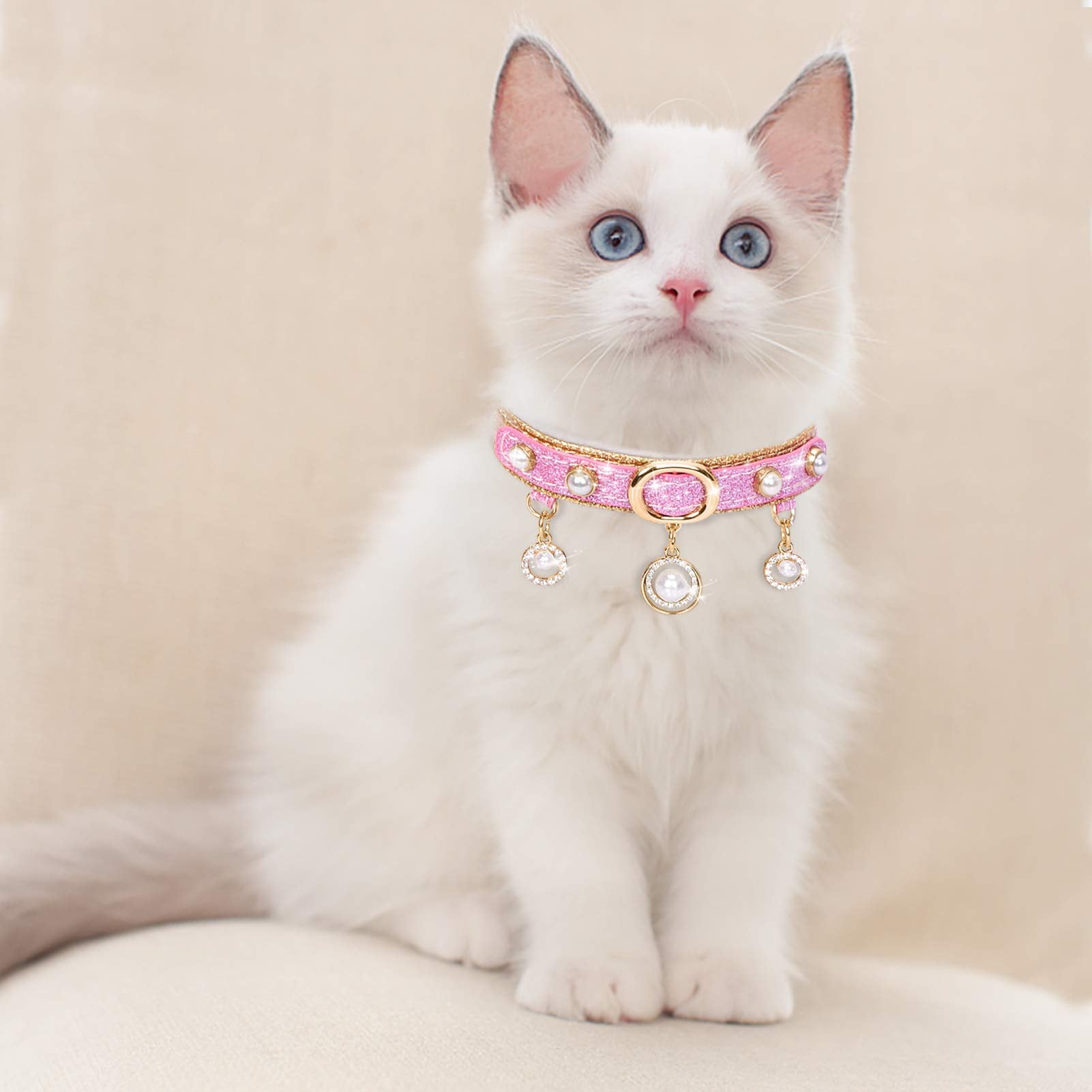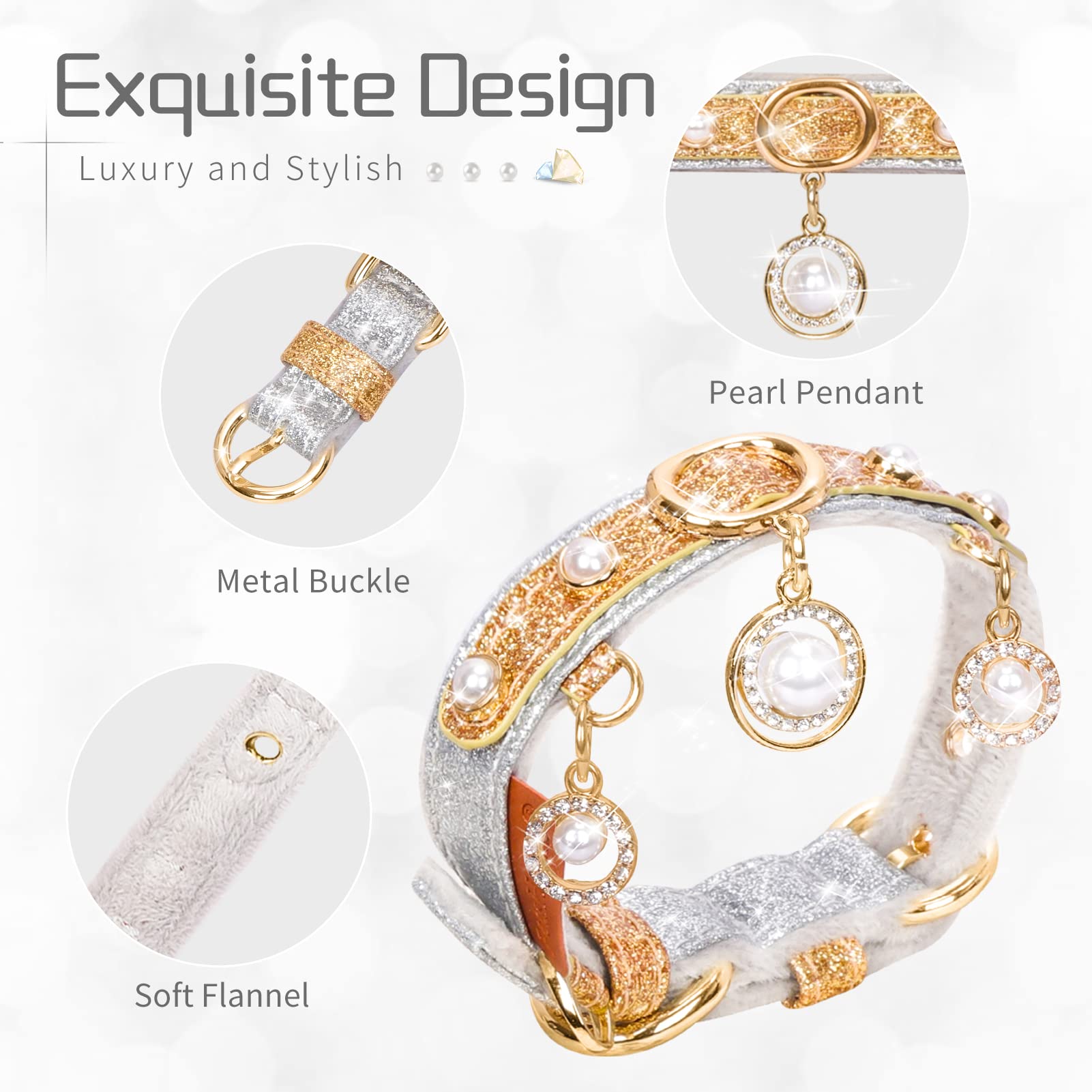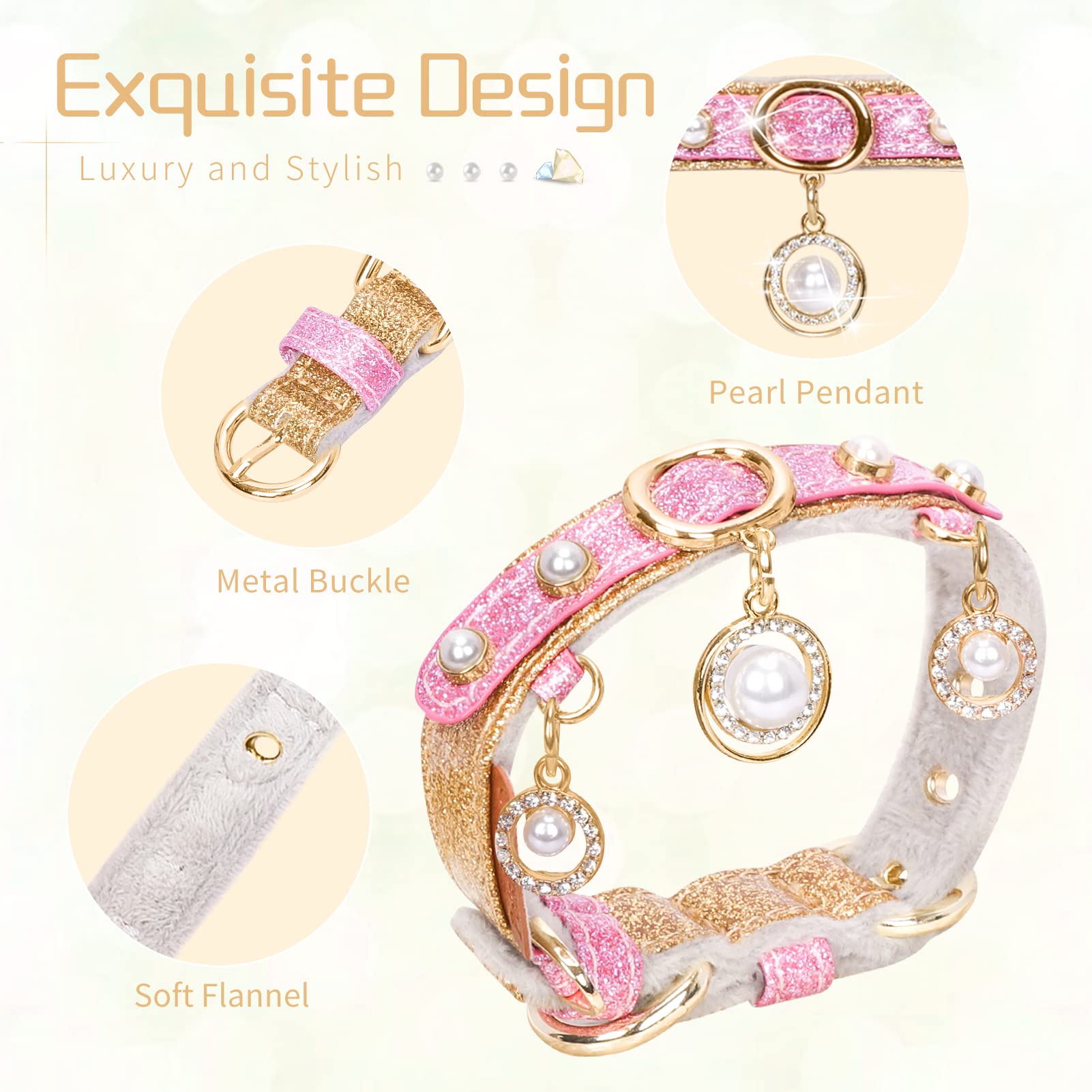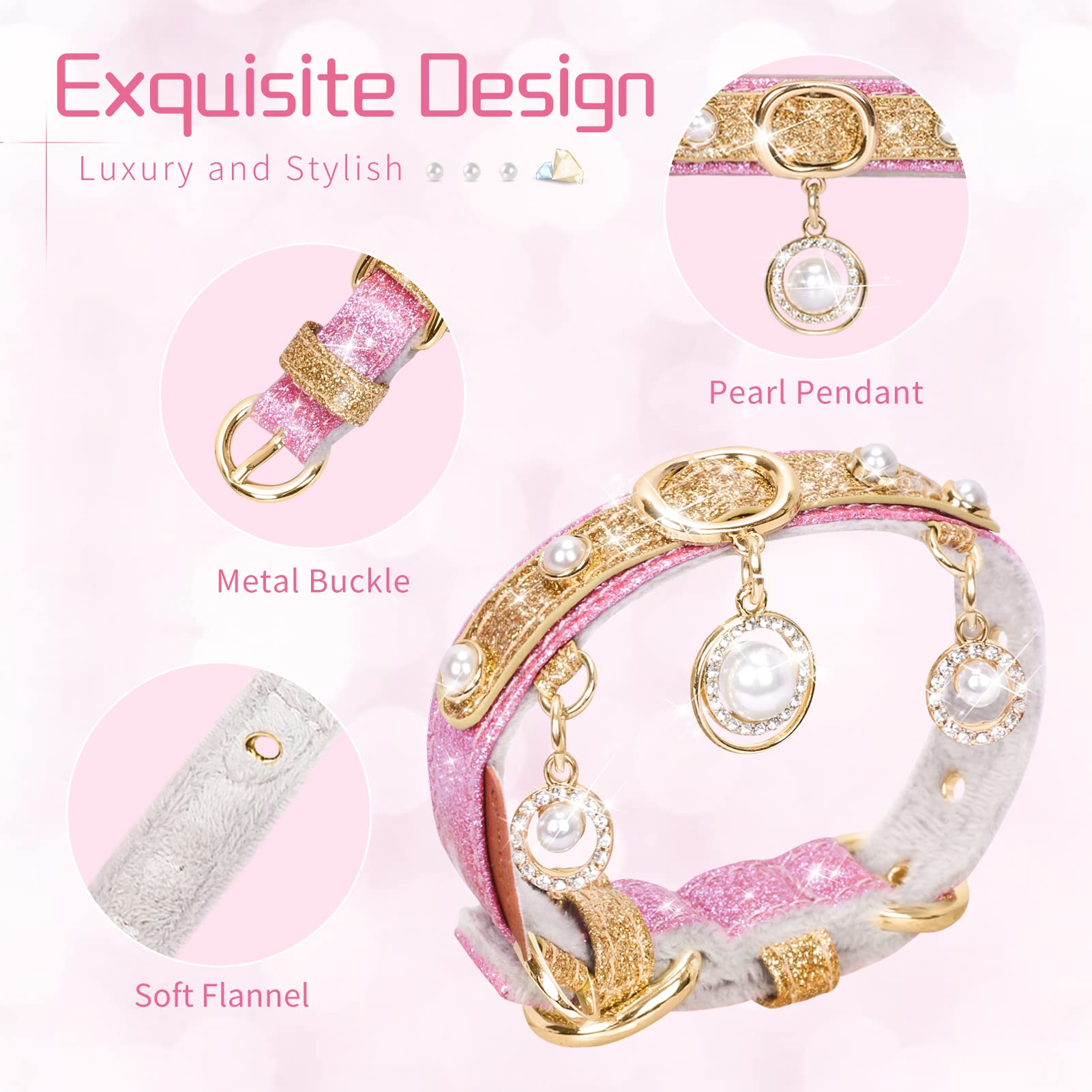 PetsHome Cat Collar, Dog Collar, Bling PU Leather Adjustable Pet Collar with Cute Pearls and Luxury Pendant for Cat and Small Dog Small Gold
