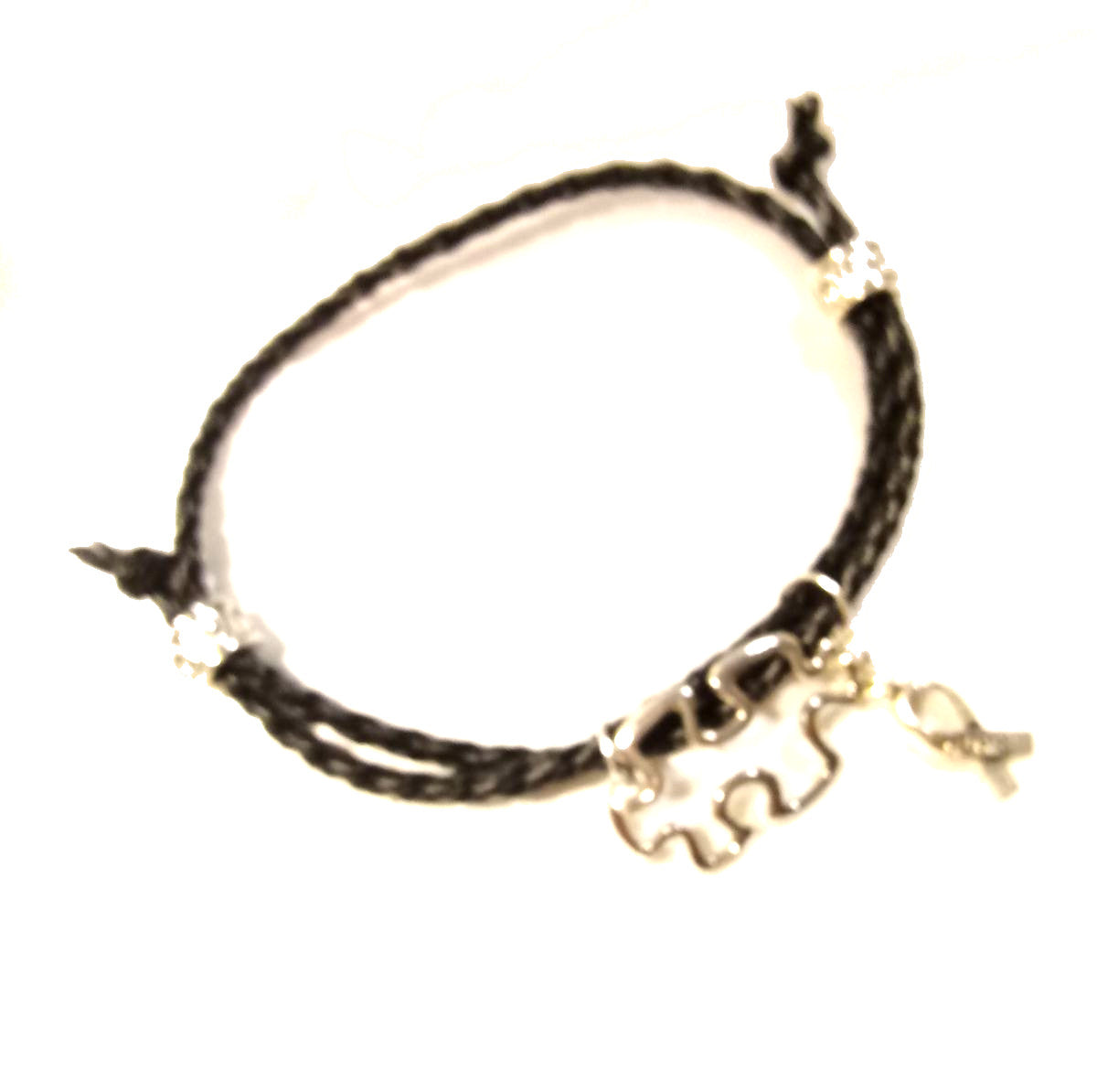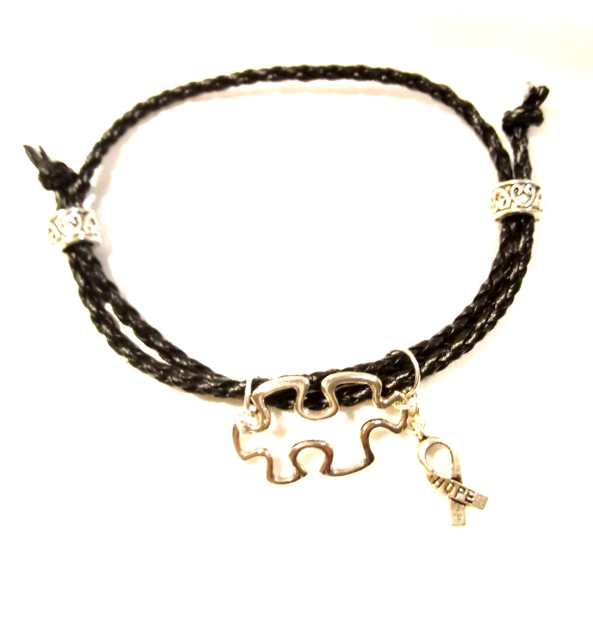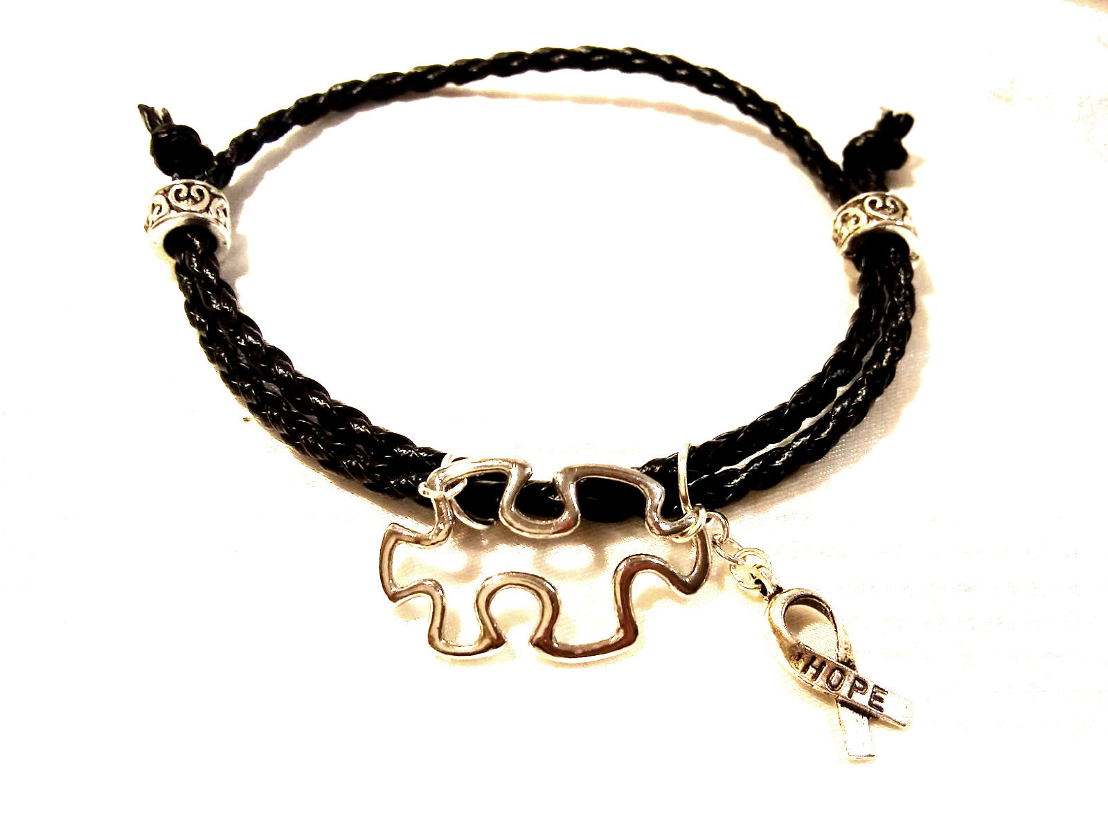 Newly released from ShopAtLuxe, this Americana Puzzle Piece Hope Ribbon Leather Wrap Bracelet is perfect for wearing any time of year. Two silver alloy charms: A puzzle piece outline a tiny ribbon of hope are suspended from high shine silver rings, while securely attached to an adjustable black leather bracelet. Embellished with thick silver heart rounds to keep your bracelet from unraveling. Bracelet expands and tightens, and will fit 5 to 9 inch wrists. No closure needed. An original design from the chief designer of ShopAtLuxe. Remember, with each purchase from ShopAtLuxe you will receive a complimentary gift!