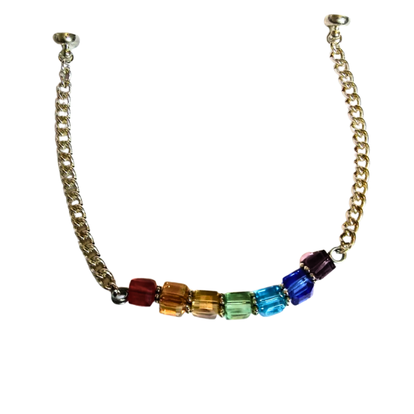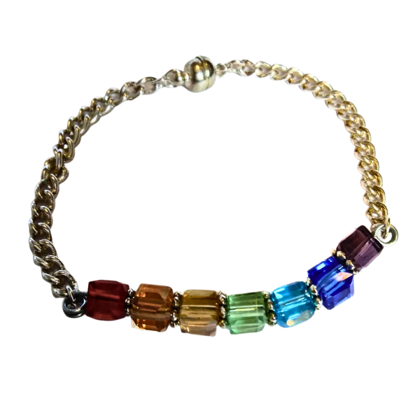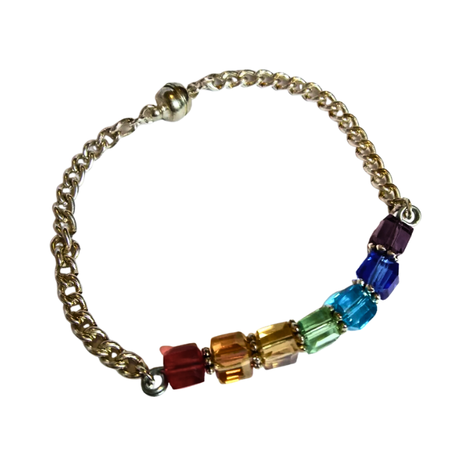 Newly handcrafted from ShopAtLuxe, this eclectic piece sports a rainbow with beautiful glass cubes and sterling silver accents, suspended from a silver curb chain. A silver magnet closure completes the 7.8 inch piece. If you need a different length, please contact us and we'll be happy to adjust it for you at no charge! Lead and nickel free. Complimentary gift with purchase!