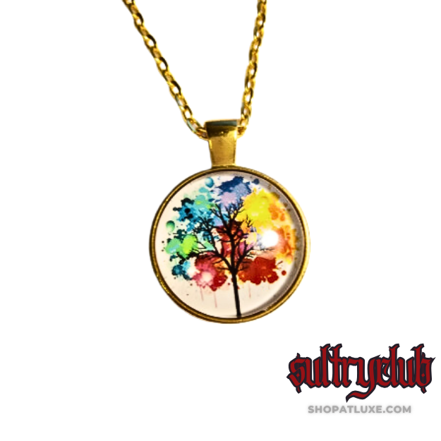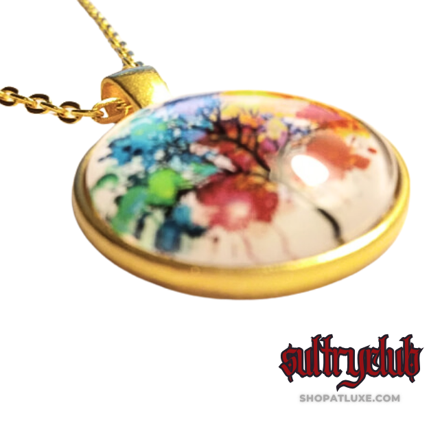 Newly handcrafted from ShopAtLuxe, this necklace features the tree of life in rainbow watercolors, in a gold setting with a traditional link gold plated chain. The cabochon pendant has a sturdy glass cover, and measures 1.25 inch across. Celebrate Pride in June, or all year round! For more details, see below... Some things you should know: *Carefully and lovingly handmade with quality components. *Cabochon measures 1" in diameter and setting is 1.2". *Permanently sealed under a jewelry-grade glass dome.