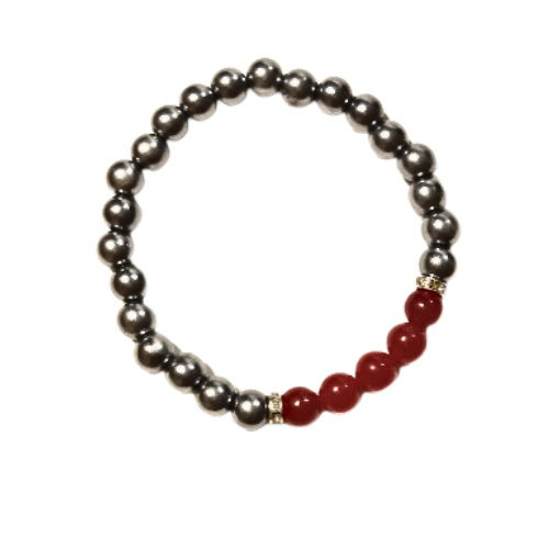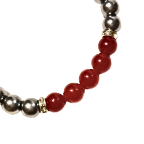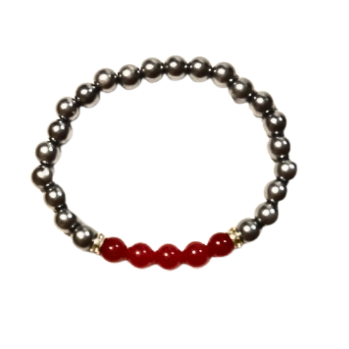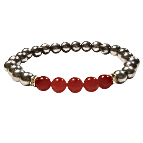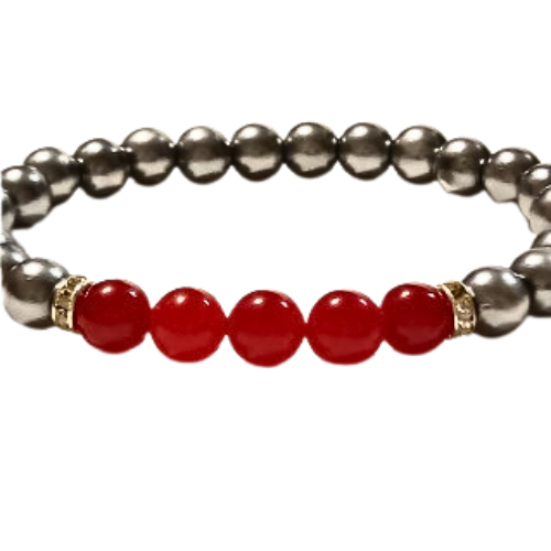 Newly handcrafted from ShopAtLuxe, this eye catching, limited edition bracelet is constructed of faceted red jade and silver rounds, suspended from a 7.5 inch stretch clear cord. Centering the red jade rounds are two crystal embellished spacer beads. Casual fit. For any gender. Hypoallergenic; lead and nickel free. Complimentary gift with purchase!