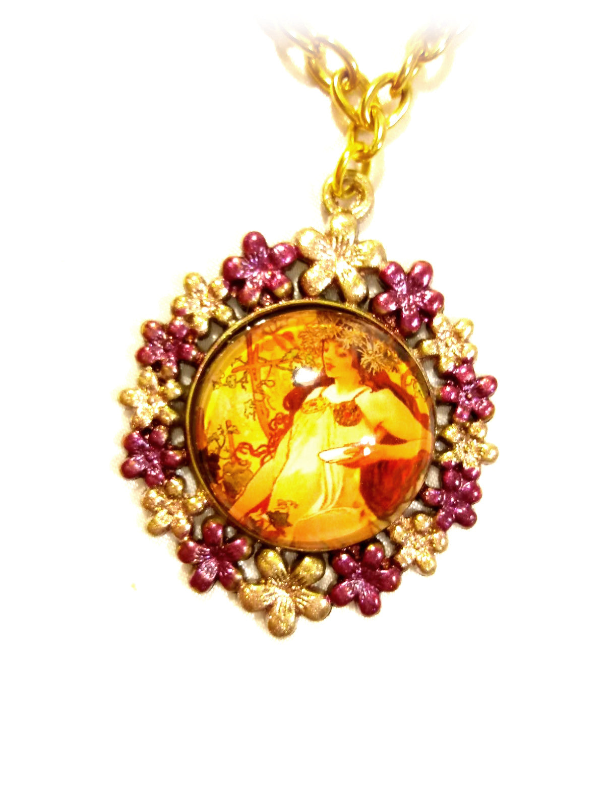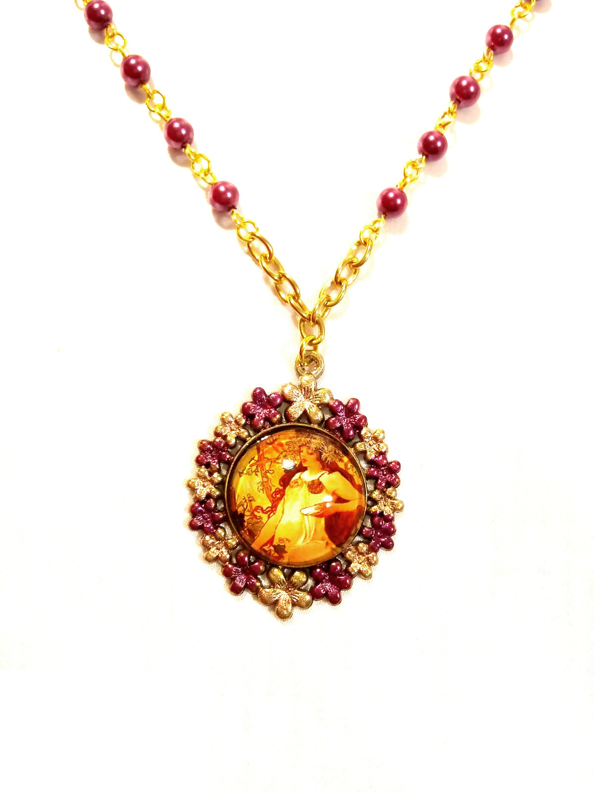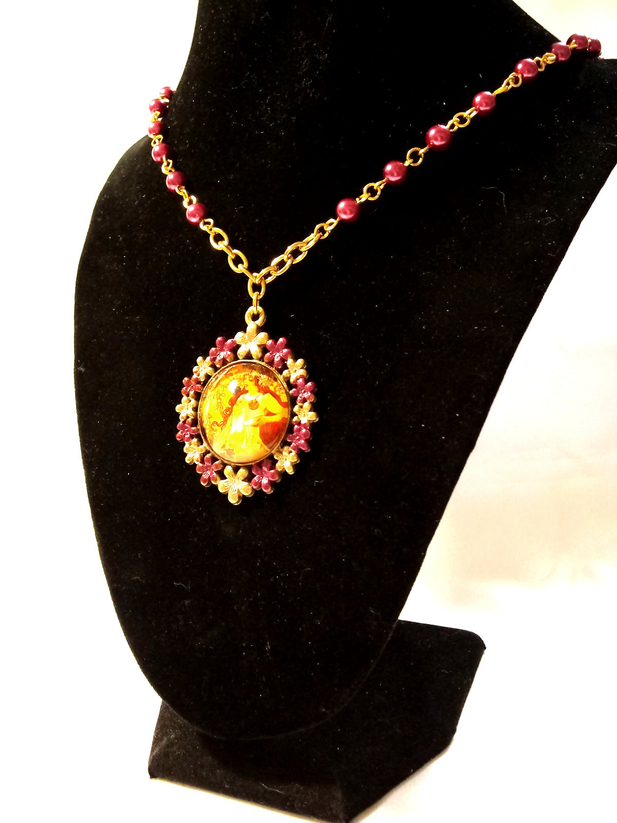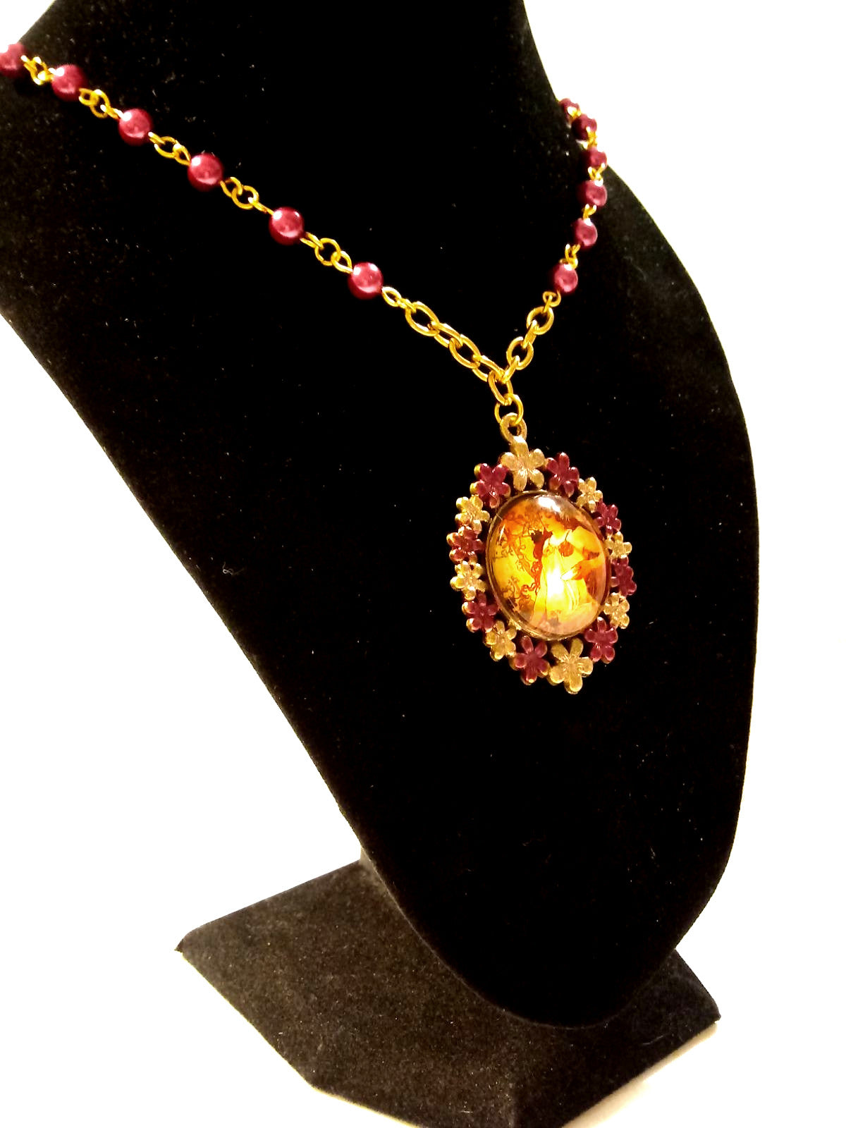 A historic piece designed for our ShopAtLuxe Global Tour Collection, this necklace is constructed of high quality pieces. This Goddess theme is a nod to the designer's appreciation of women, and the suffering she has endured throughout time. A handpainted bronze and glass Goddess pendant, is suspended from a hand beaded chain with fuchsia rounds and gold tones, measuring 20 inches. The cabochon, along with the chain, have all been handcrafted by our chief designer, here in the USA. If you have any questions, or would love to request a different length, please send a message. If you'd prefer a leather necklace, we can accommodate you. Lead and nickel free. Hypoallergenic. Complimentary gift with purchase.