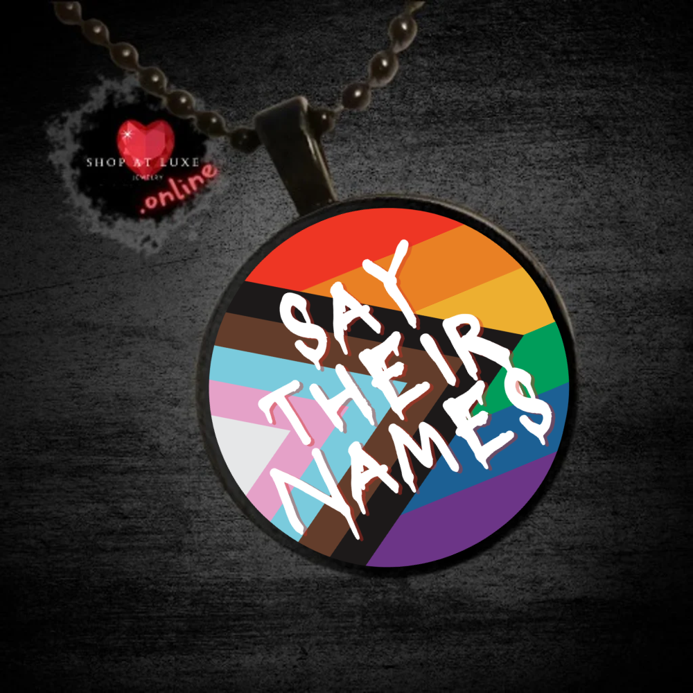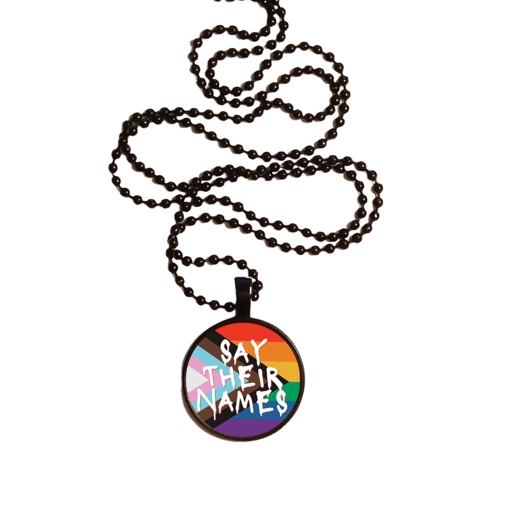 This pendant is constructed with a custom graphic with the words, "SAY THEIR NAMES". This image is bonded under a transparent topper, in a variety of chain colors and styles.