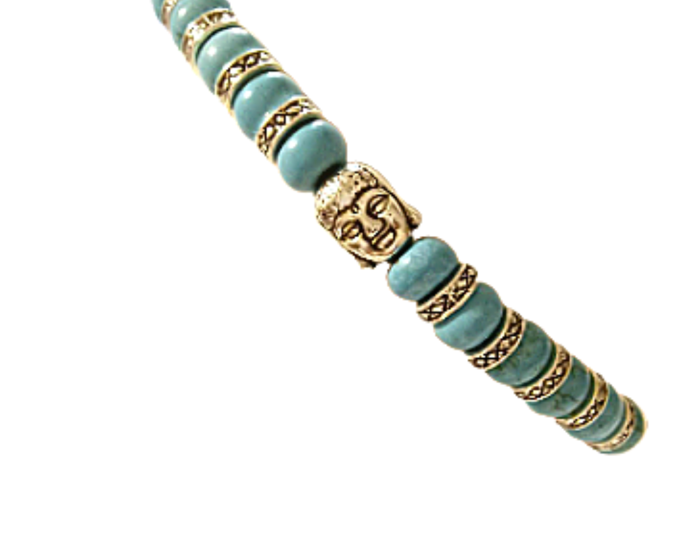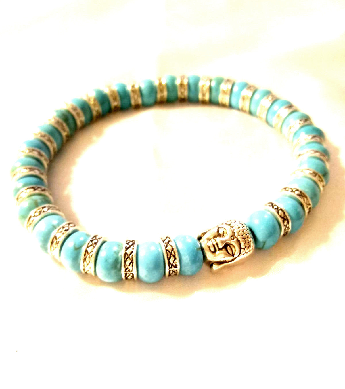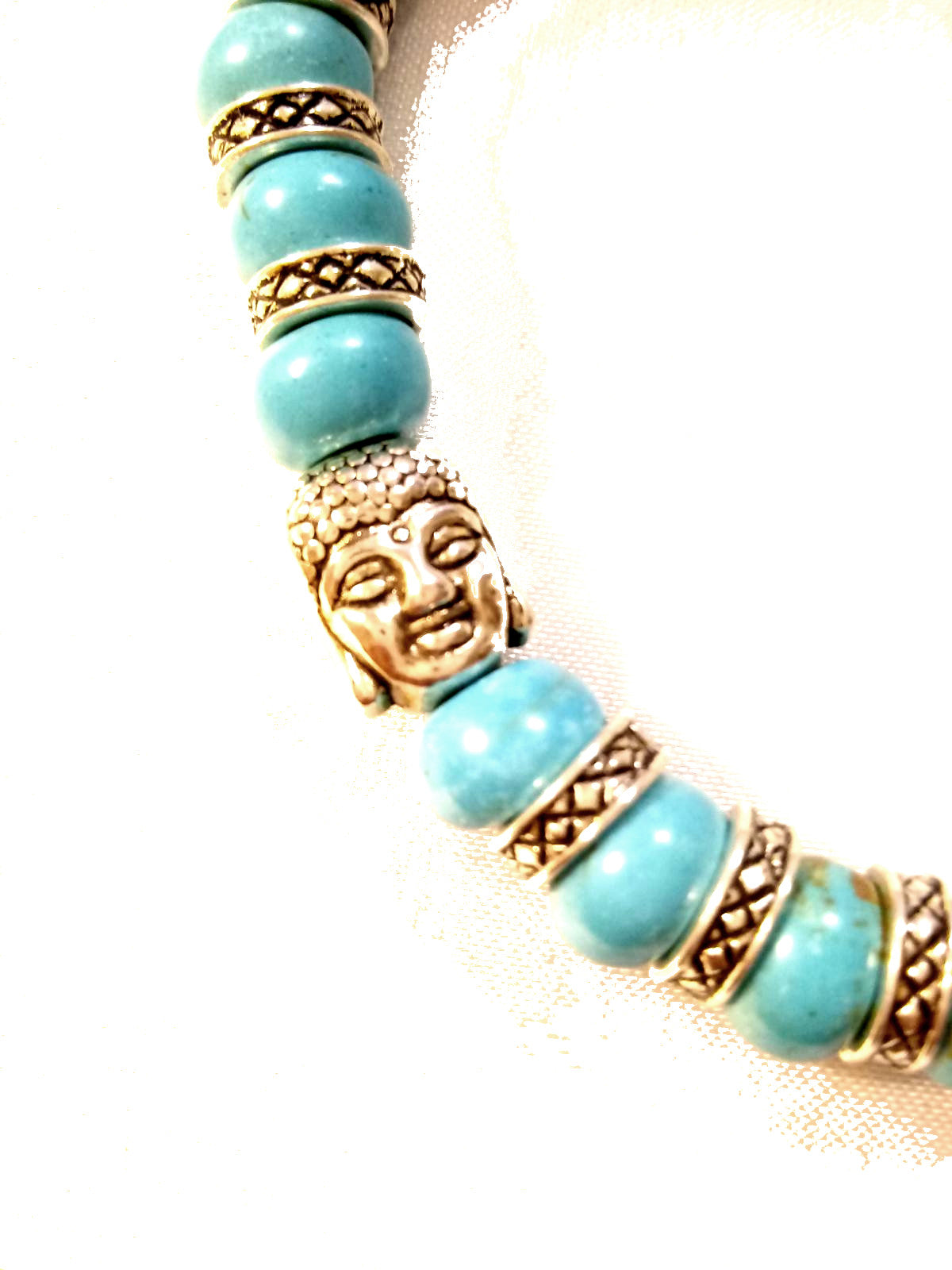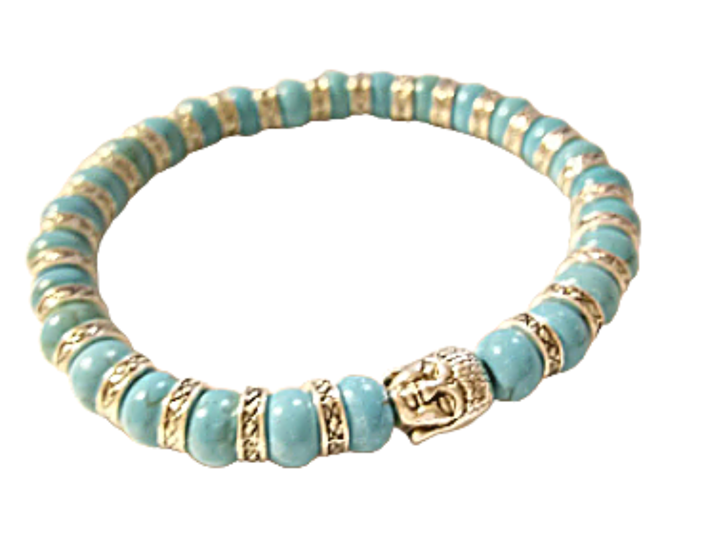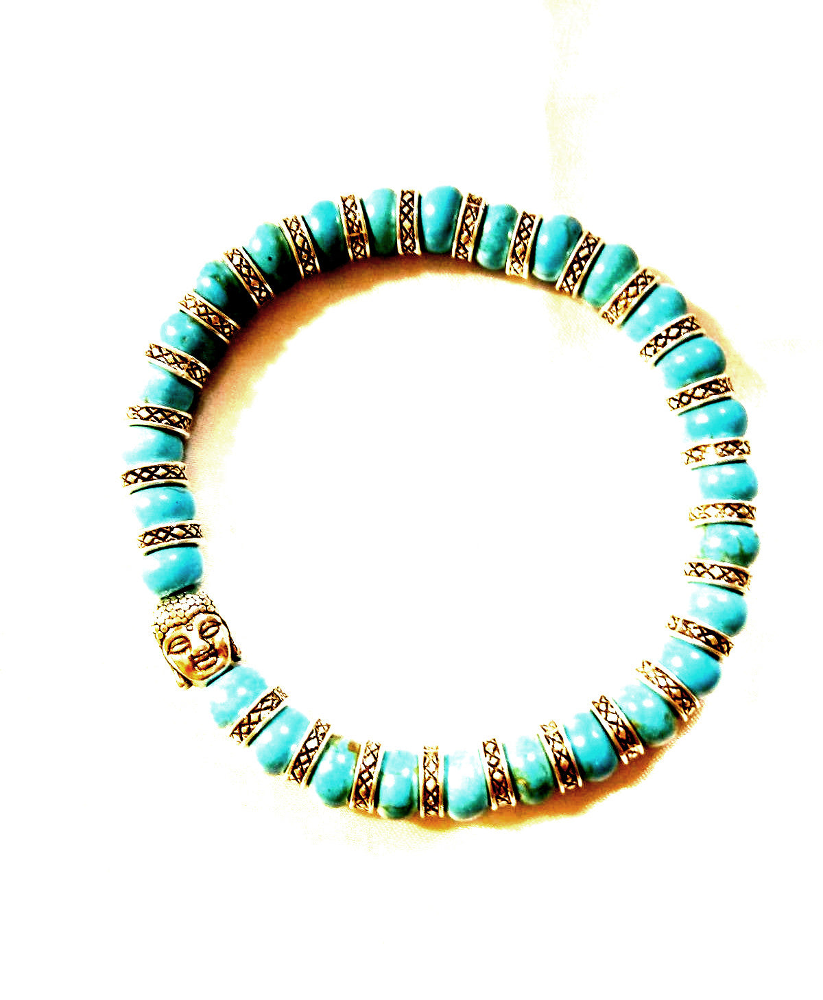Newly released for our Global Tour Collection, this contemporary Buddhist Bracelet is constructed with natural oval turquoise beads and engraved silver accent pieces, giving you the feel that comes with jewelry from Shopatluxe!