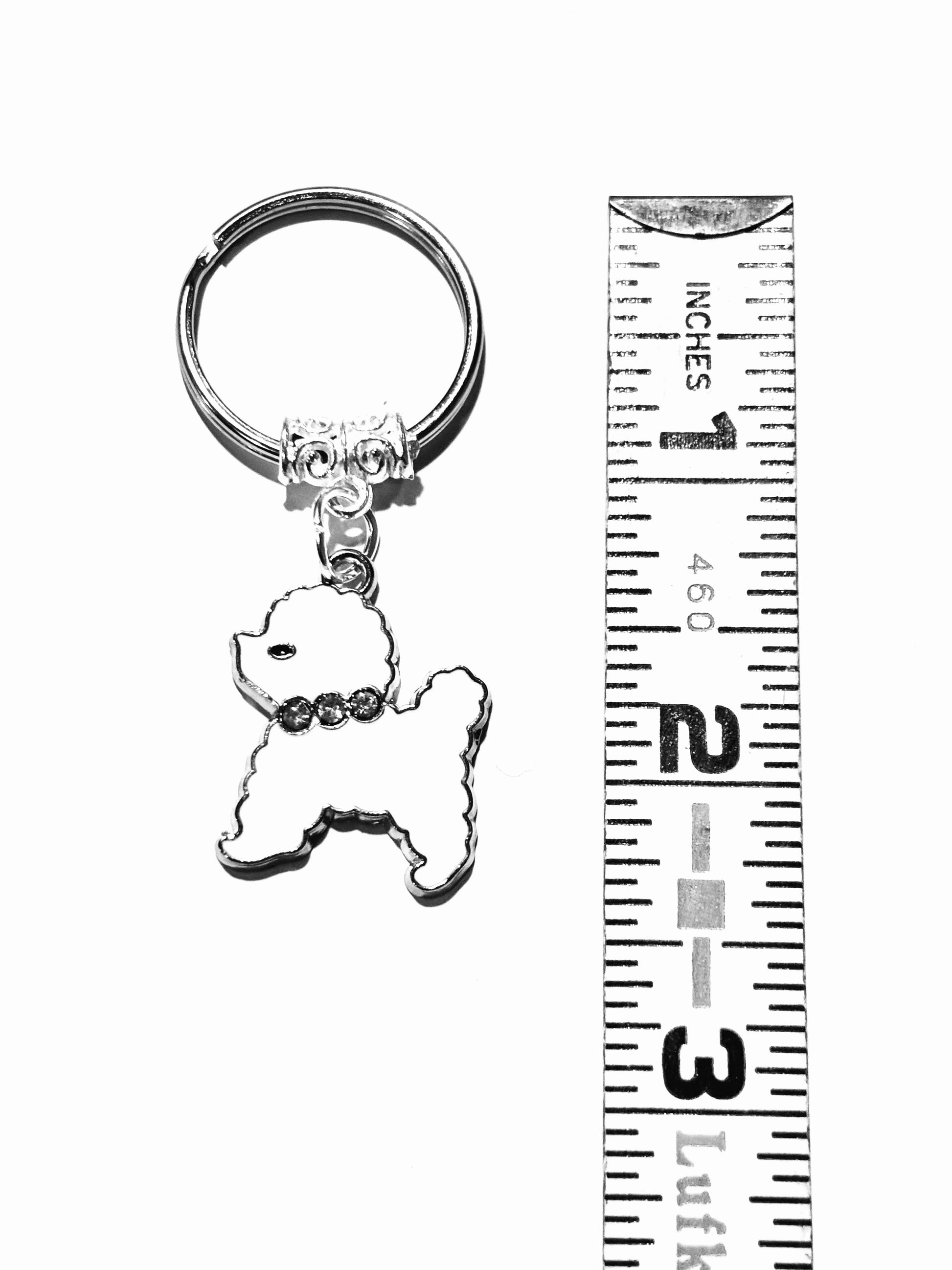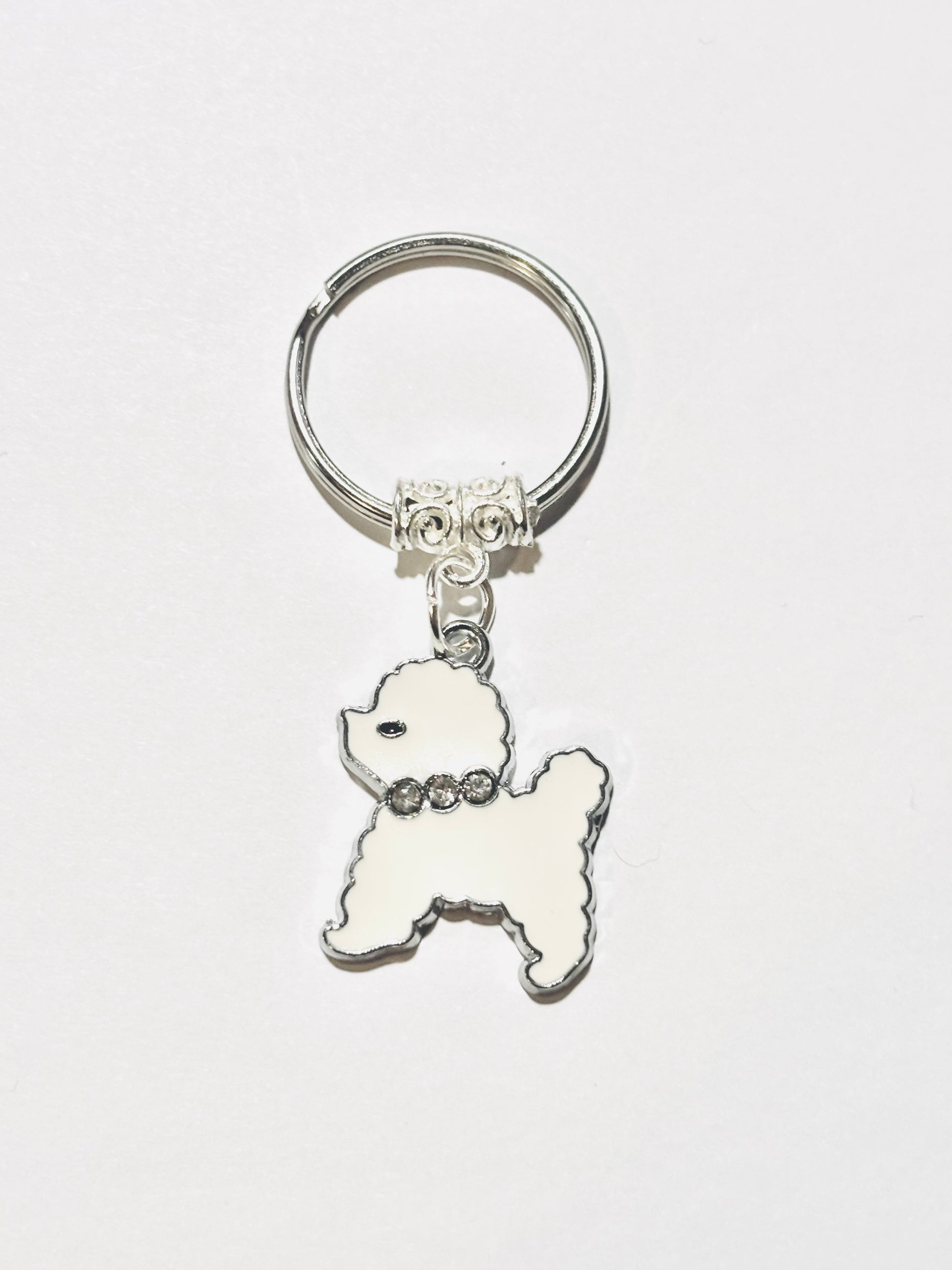 Description: - a custom crafted key chain with a white poodle with rhinestone collar pendant, made with a high quality steel metal split key ring, including a complimentary gift included! See image for close measurements.