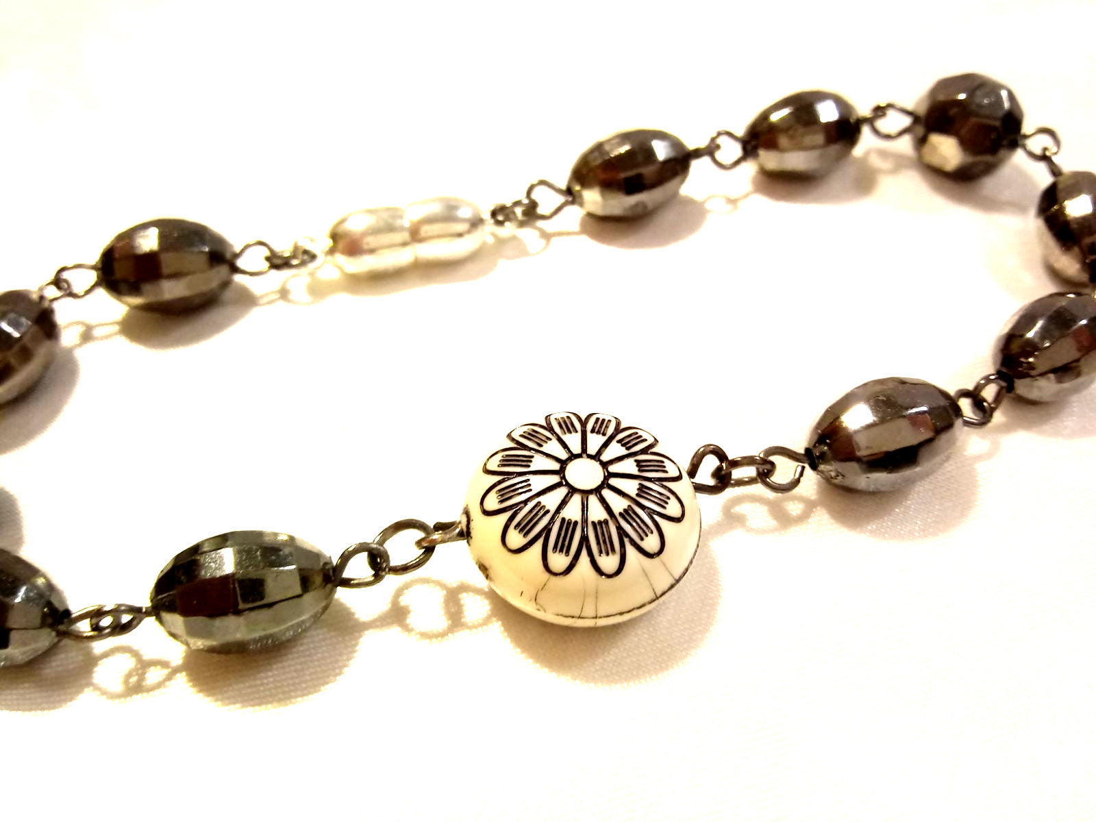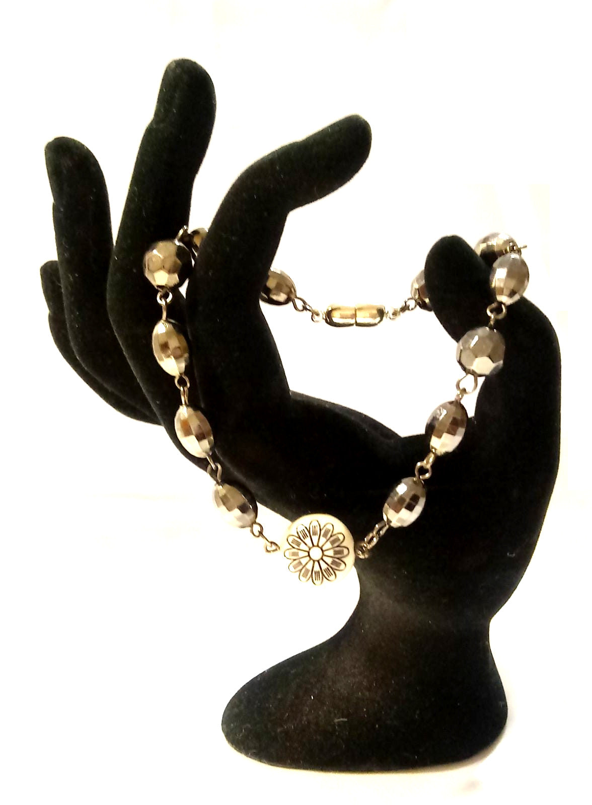 Constructed of a black geometric sun illustration on a centered acrylic bead, gun metal faceted beads and hand crafted black chain, this bracelet has been created for the gender free wearer. Silver magnetic clasp. Loose casual fit at 8.5 inches in length. For 7.5 to 8 inch wrists. Limited edition piece. Hypoallergenic; lead and nickel free. If you should need a different size, please contact us. Complimentary gift with purchase!