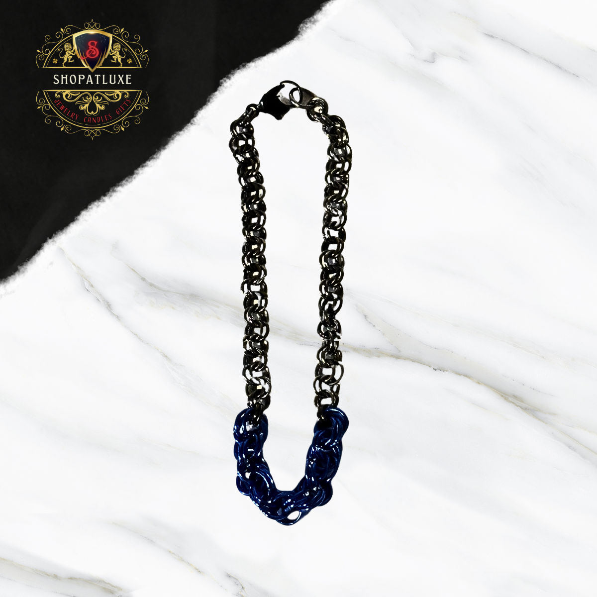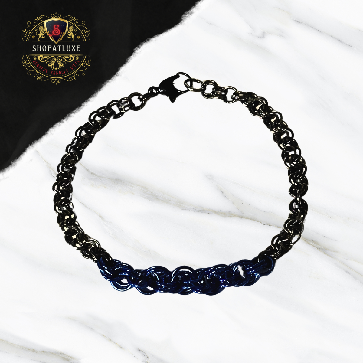 Newly constructed is an exquisite Thin Blue Line Hand Woven Bracelet! This original design is constructed of Royal Blue Aluminum Rings which are interconnected with black steel rings for a casual street style. Style: chainmail bracelet with a lobster claw closure.