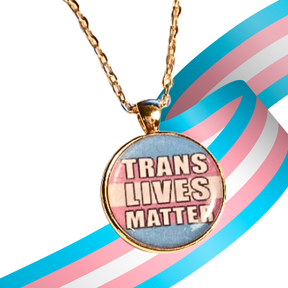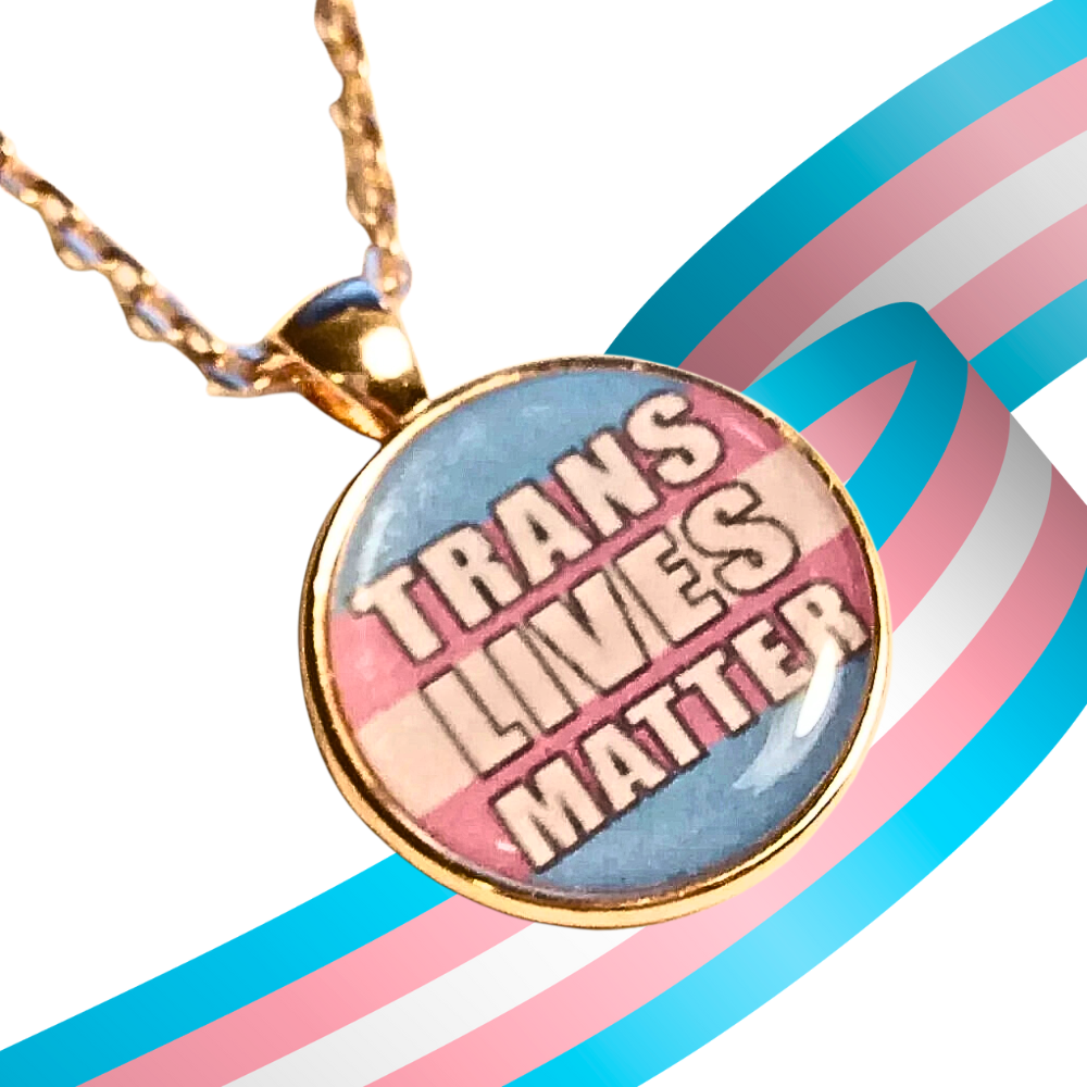 This pendant is constructed with a custom graphic with the words, "TRANS LIVES MATTER". This image is bonded under a transparent topper, in a variety of chain colors and styles.