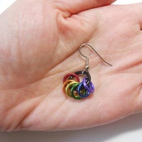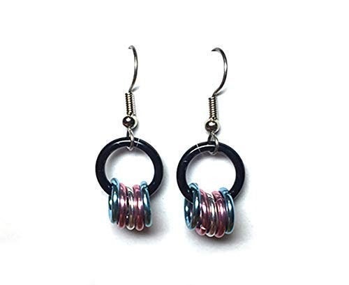 Increase awareness and celebrate your Pride with these on point Trans Pride Chainmaille Earrings! Vibrant anodized aluminum 15mm rings in the colors of the Transgender Flag are suspended on a black 15mm ring. Complimented by silver plated hooks (or your choice of black hooks). Soft silicone backings lend added comfort and a secure fit. Drop length: about 2 inches. Complimentary gift with purchase from ShopAtLuxe.